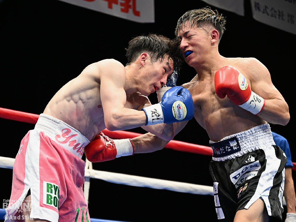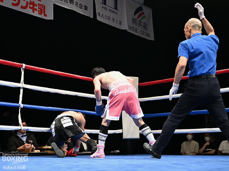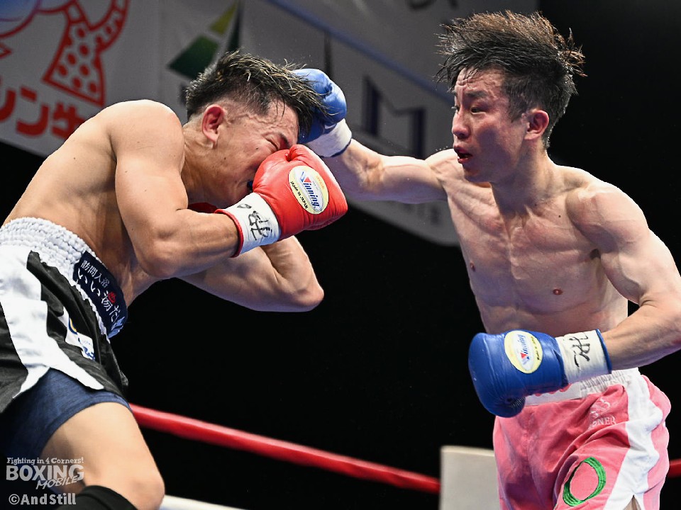 の右ストレートがヒット。2回も接近戦の構図は変わらず両者消耗戦。沖吉がアッパーに活路を見出したか。3回、きのぴーが自分から果敢に攻め要所でオーバーハンドを当てる。ラウンド終盤前に出たきのぴーに沖吉がフックを合わせダウンを奪う。きのぴーはほぼダメージなく立ち上がり挽回する為攻める。最終回、お互い死力を尽くした打ち合い、削り合い。我慢比べとなる。そのまま終了のゴングがなり勝敗は判定へ。試合はヒット数で上回りダウンも奪った沖吉が大差判定で勝利を挙げた。