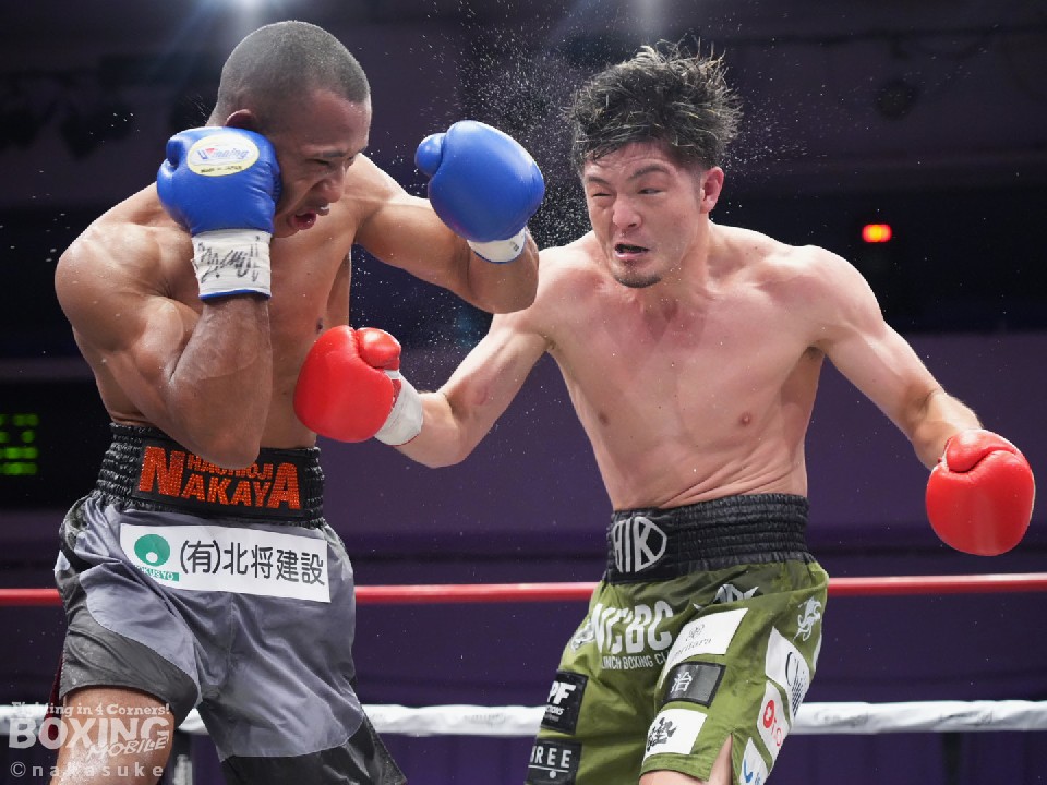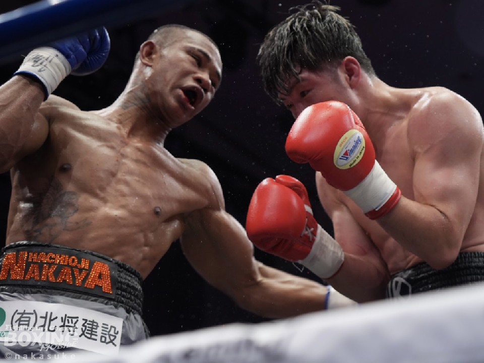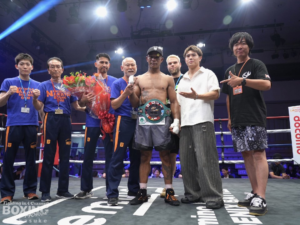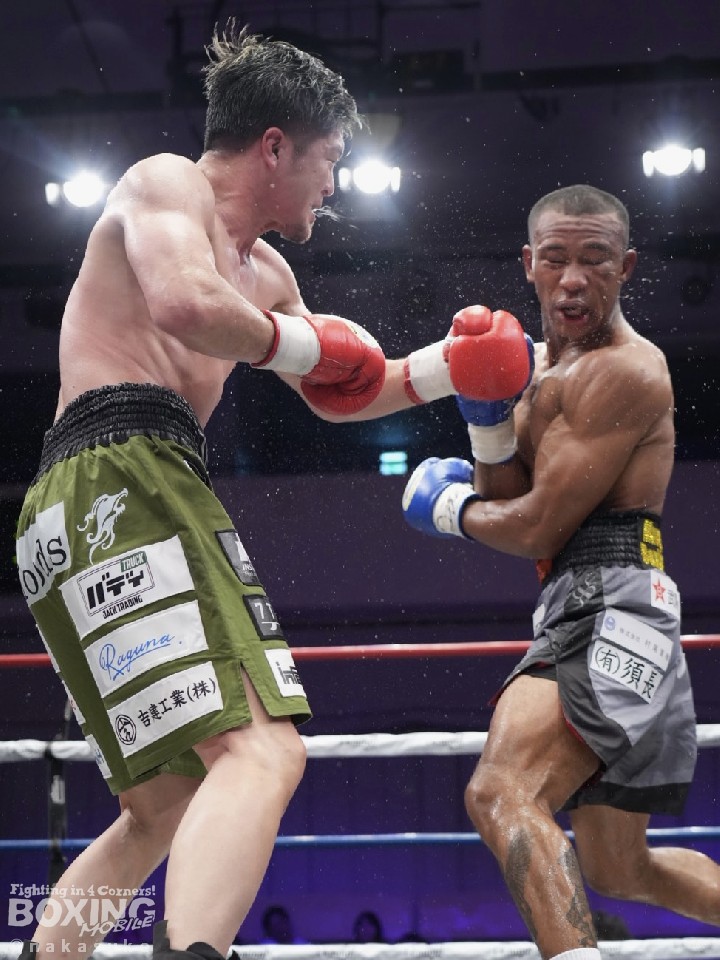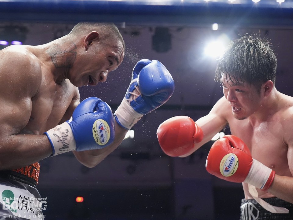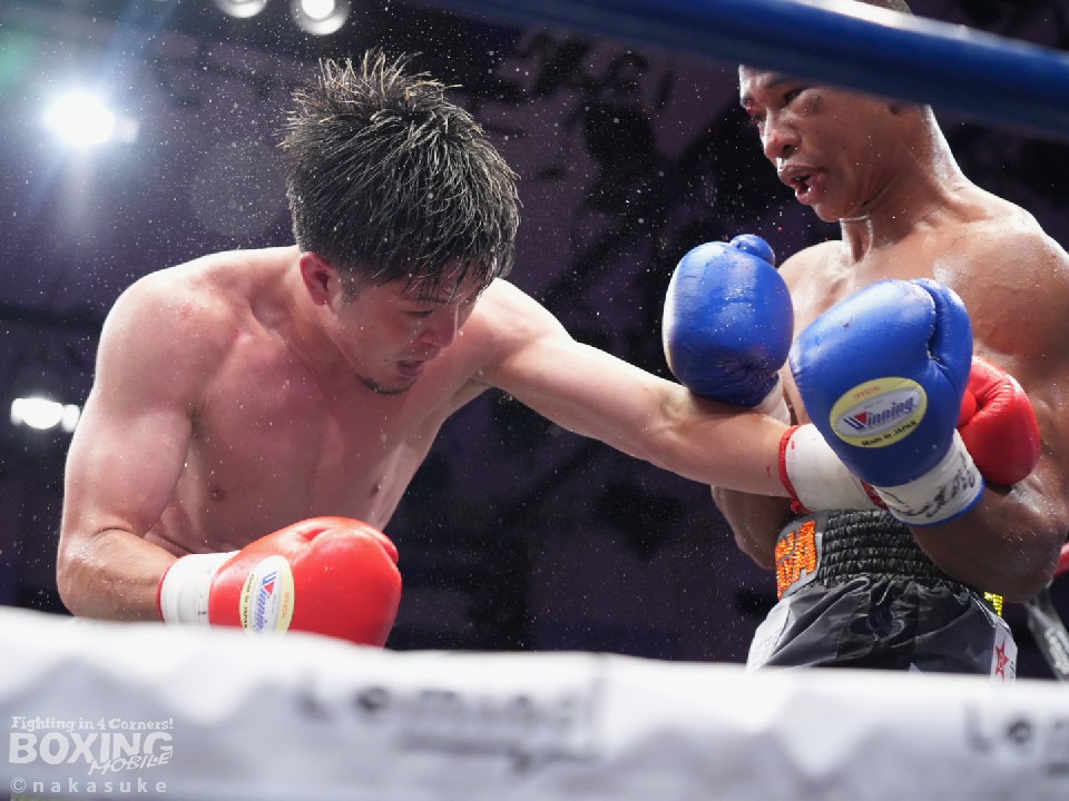 試合:空位のOPBFスーパーウェルター級王座を左右田とナァツが争った。ナァツが小刻みに頭を振りながら左ボディから仕掛けるのに対し、左右田はジャブで突き放しにいく構図。2回、左右田は右ストレートで迎え撃つとスッと横にズレて試合巧者ぶりを発揮。3回、ナァツは右ボディを叩きつけると相手のクリンチの隙間を上手く作り右フックをコツコツと叩いた。4回、クリンチが続く中、有効打を集めたのはナァツ。4回終了時の公開採点は39-37×3でナァツがリード。6回、流れを変えたい左右田は左フックをねじ込み仕掛けに行くとナァツも強気に応戦。ナァツはコンパクトな左アッパーから左フックをヒット。7回、ナァツは上下に打ち分けると回転力を上げて攻勢。8回終了時の公開採点は、78-74×2、79-73×1でナァツがポイント差を広げた。9回もナァツのラウンド。左ボディを突き刺すとサイドに回り込み見栄えの良さをアピール。10回、左右田は右カウンターを好打。ナァツもここは引くまいと真っ向から打ち合った。ナァツは偶然のバッティングで右目上をカット。11回、左右田は左フックで顔を弾くとナァツは倍返し。このラウンドは左右田が盛り返した印象。12回、ナァツは残っているスタミナを使い果たすべく、手数を増やして攻勢。左右田も歯を食いしばりながら懸命に打ち返した。終始、有効打で上回ったナァツが15戦目で新チャンピオンに輝いた。