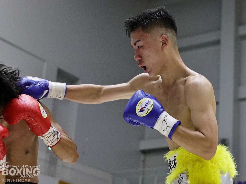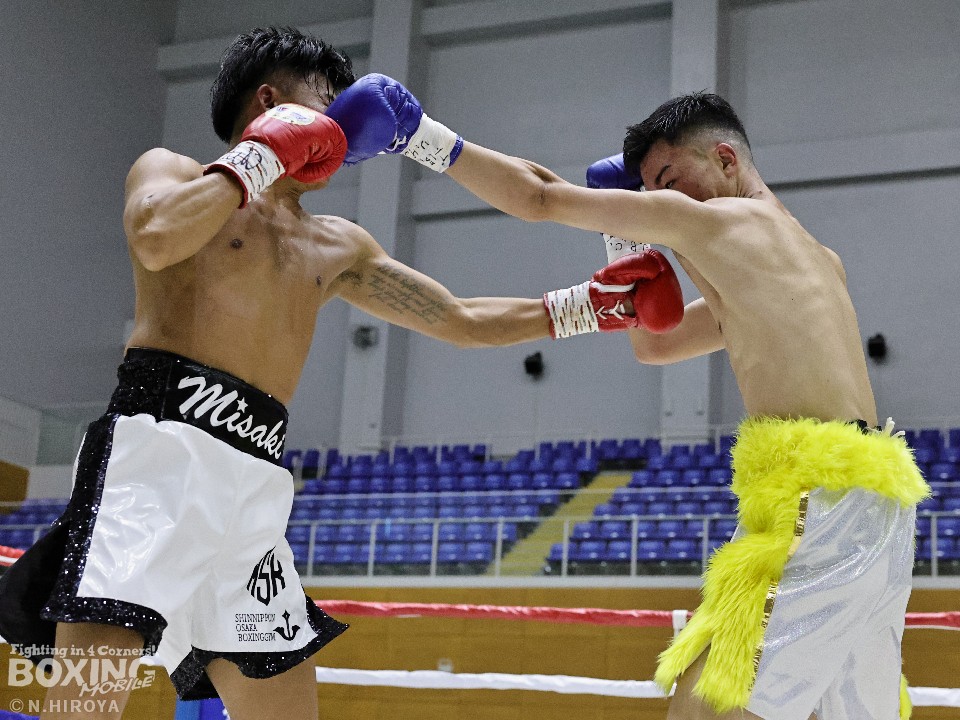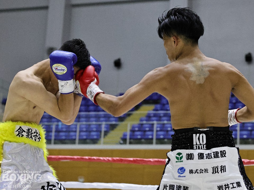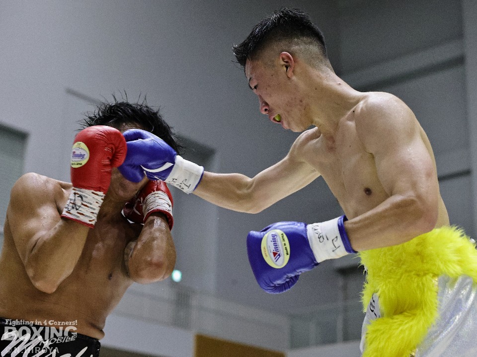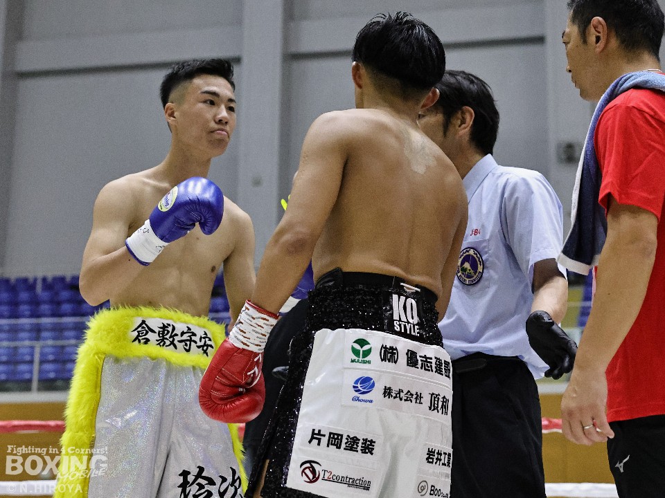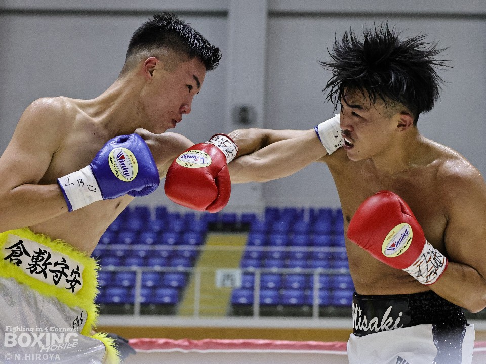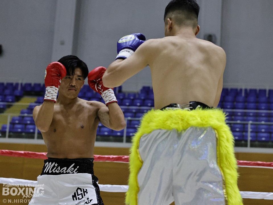 試合:田井がジャブを突いてリズムを作るとワンツーをヒット。やや後手に回った山岡は、単発の左ボディを返した。2回、山岡は左ボディを突き刺すと左右をまとめて反撃。中間距離での攻防で上回った印象。3回、距離を詰めた田井がショートアッパーで積極的な攻撃。4回、田井はプレスをかけてワンツーで顔を弾くと連打で攻勢。山岡は左アッパーから左フックで食い下がった。ジャッジに委ねられた採点は引き分け。新人王特別ルールにより優勢点を勝ち取った田井が西日本新人王決勝戦に駒を進めた。