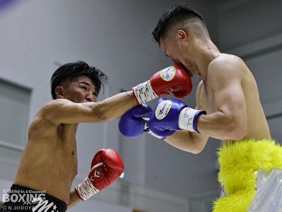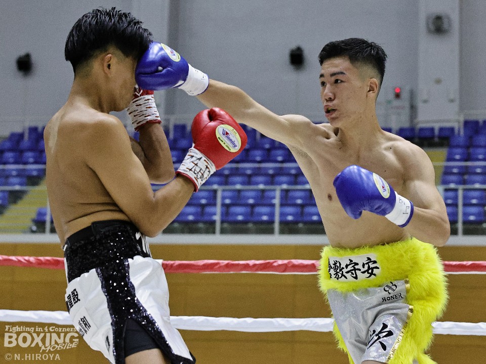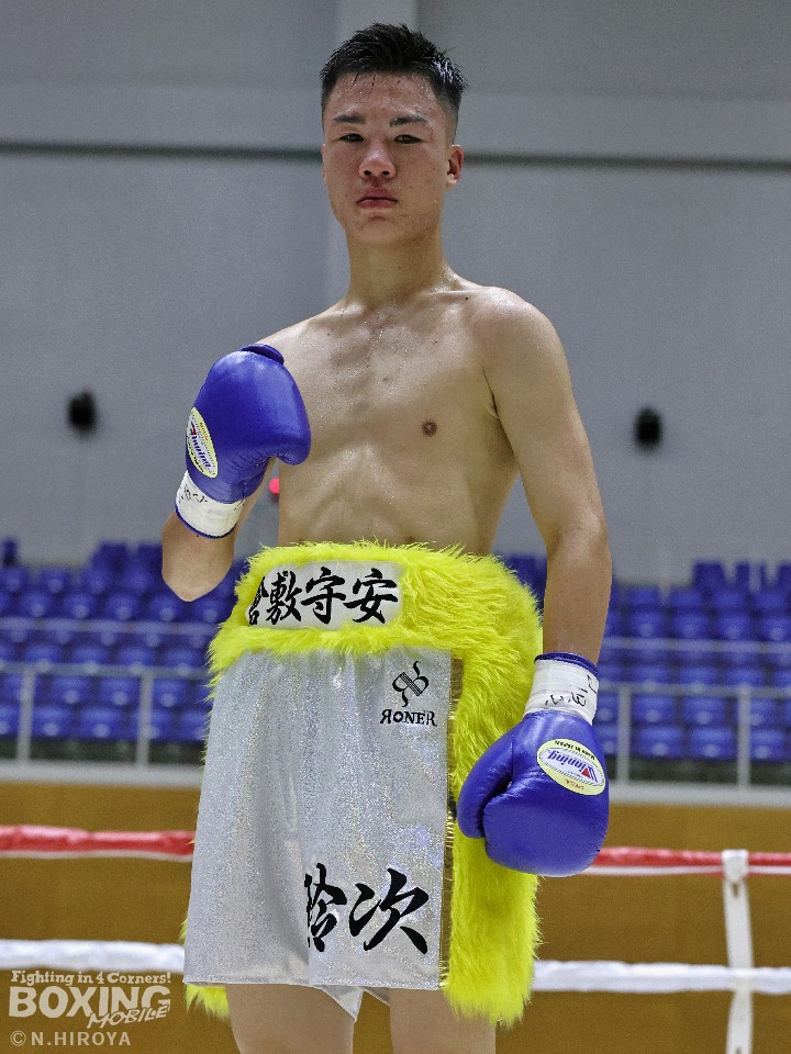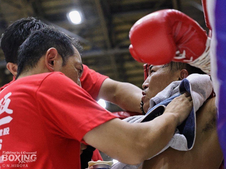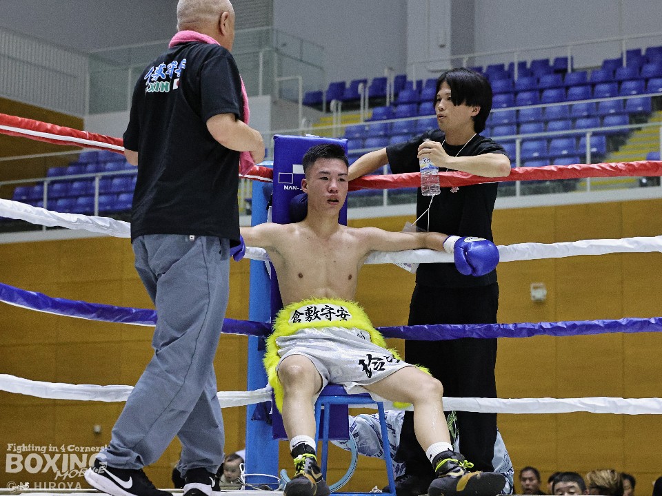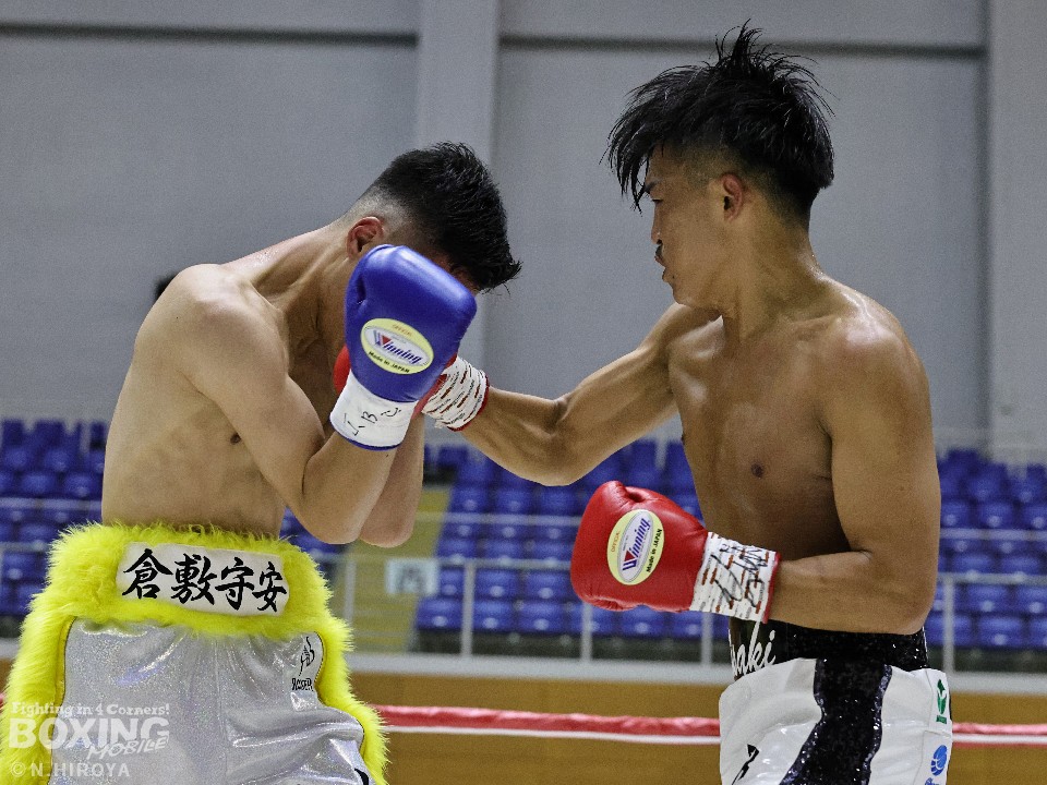 試合:田井がジャブを突いてリズムを作るとワンツーをヒット。やや後手に回った山岡は、単発の左ボディを返した。2回、山岡は左ボディを突き刺すと左右をまとめて反撃。中間距離での攻防で上回った印象。3回、距離を詰めた田井がショートアッパーで積極的な攻撃。4回、田井はプレスをかけてワンツーで顔を弾くと連打で攻勢。山岡は左アッパーから左フックで食い下がった。ジャッジに委ねられた採点は引き分け。新人王特別ルールにより優勢点を勝ち取った田井が西日本新人王決勝戦に駒を進めた。