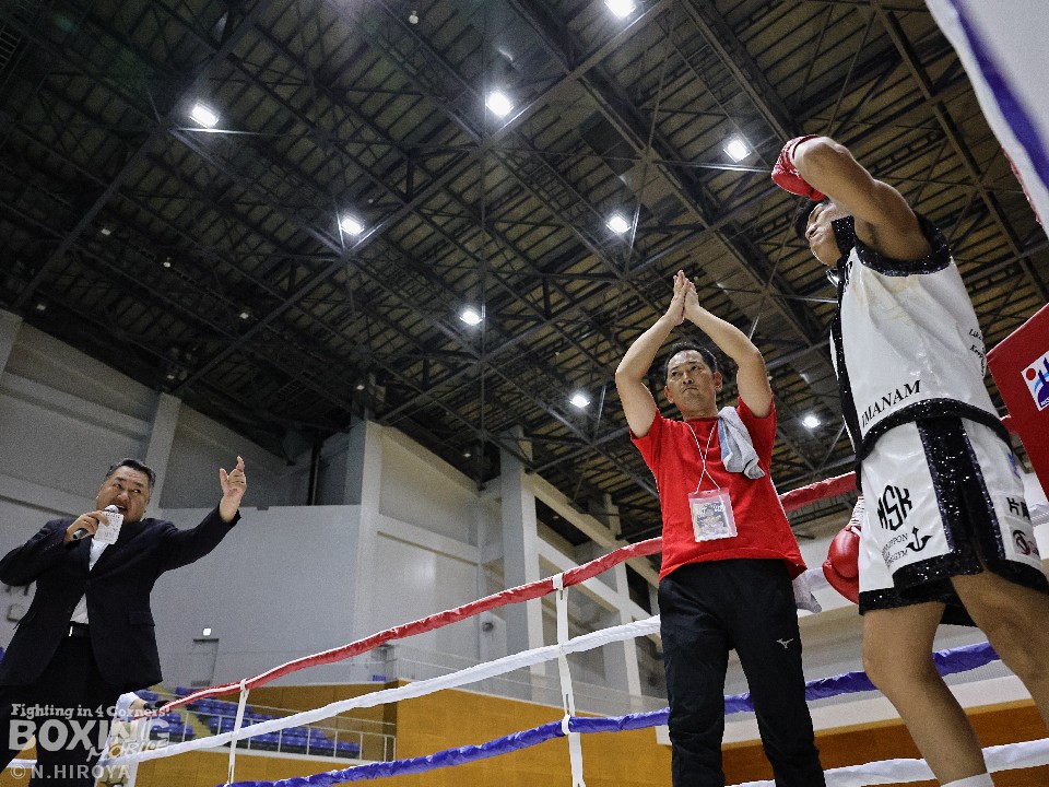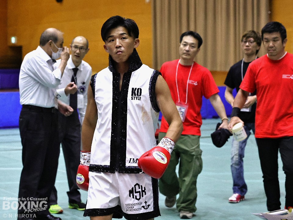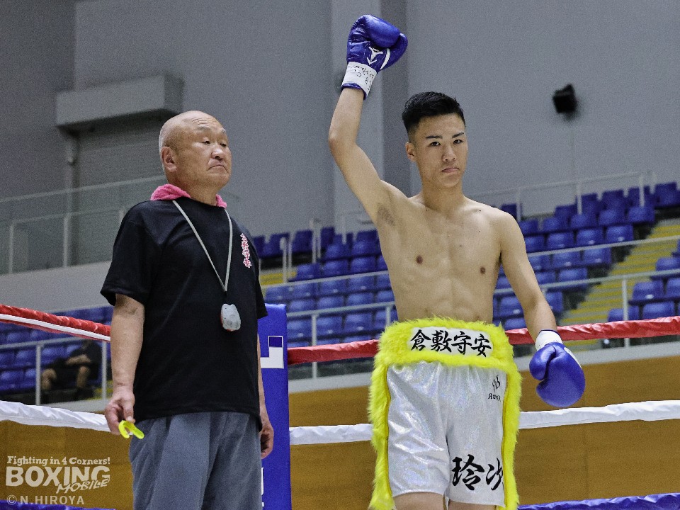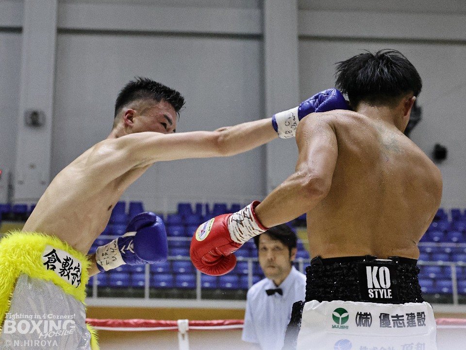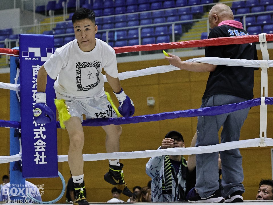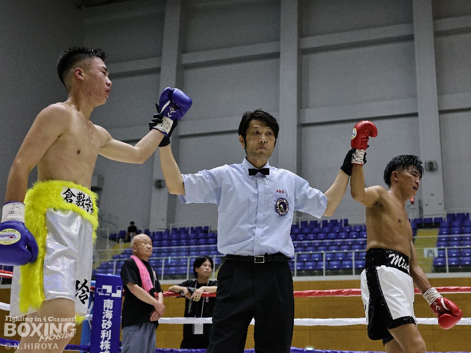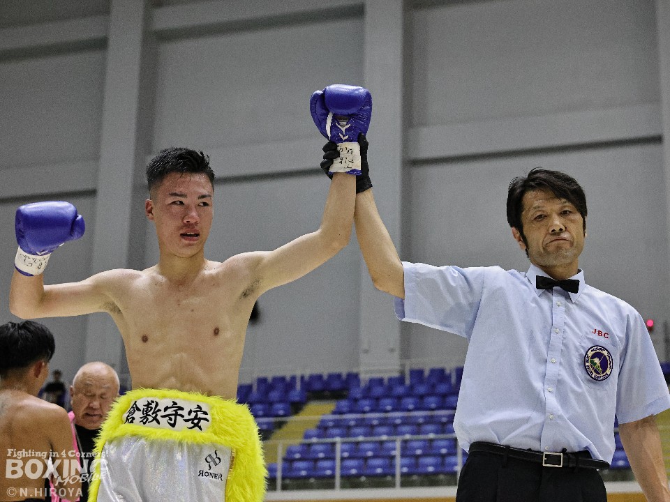 試合:田井がジャブを突いてリズムを作るとワンツーをヒット。やや後手に回った山岡は、単発の左ボディを返した。2回、山岡は左ボディを突き刺すと左右をまとめて反撃。中間距離での攻防で上回った印象。3回、距離を詰めた田井がショートアッパーで積極的な攻撃。4回、田井はプレスをかけてワンツーで顔を弾くと連打で攻勢。山岡は左アッパーから左フックで食い下がった。ジャッジに委ねられた採点は引き分け。新人王特別ルールにより優勢点を勝ち取った田井が西日本新人王決勝戦に駒を進めた。