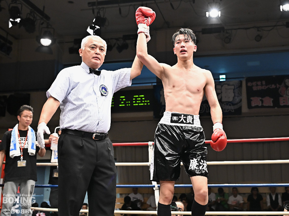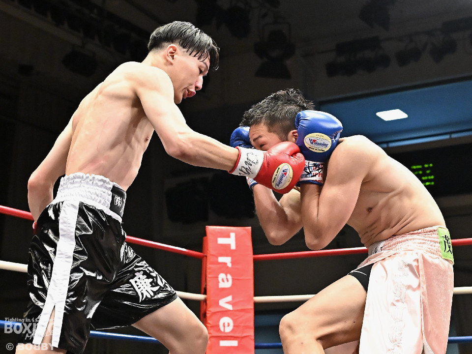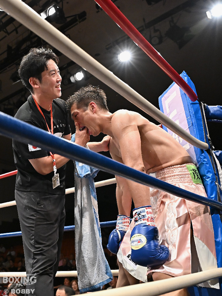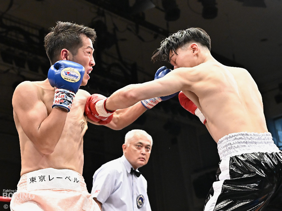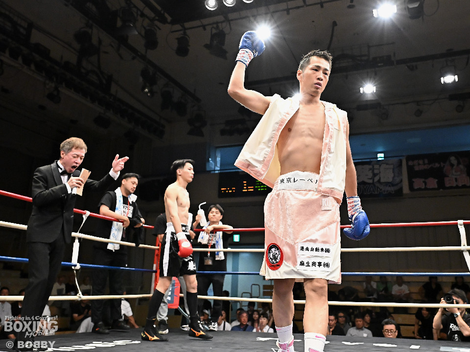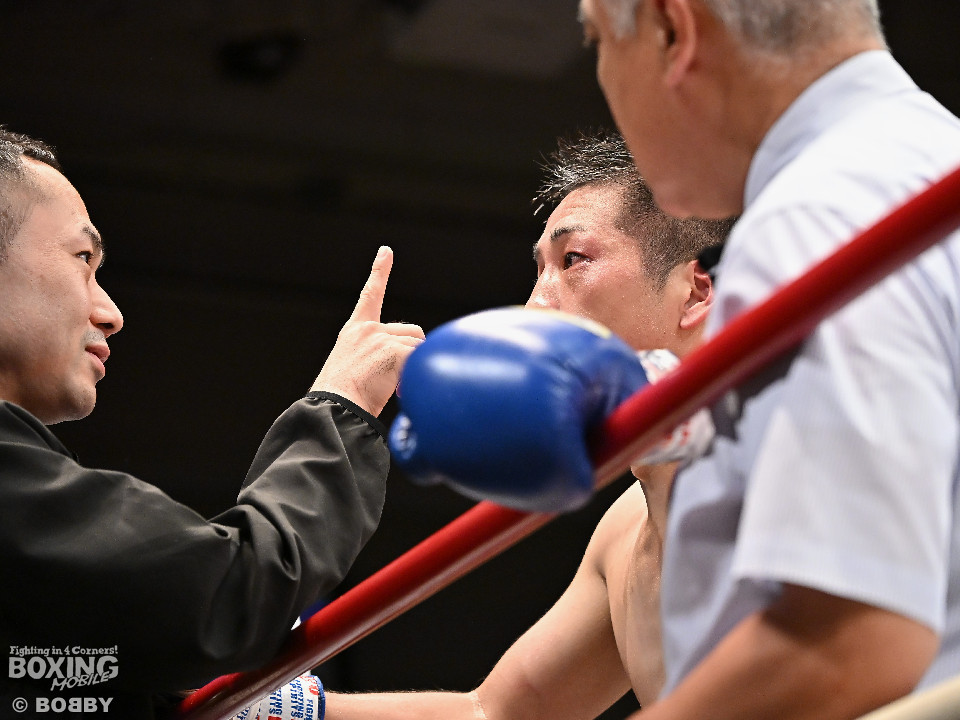 試合:倉持がジャブから左ボディにつなげて丁寧な組み立て。6年3ヶ月ぶりにカムバックした山本は、左フックを合わせるが後手に回った印象。2回、激しいパンチの応酬を繰り広げる中、山本はヒッティングで右目下を負傷。3回、倉本はワンツーで腰を沈めさせるとパンチをまとめたところで山本陣営が棄権を申し出た。倉持が初のKO勝ちでB級昇格を決めた。