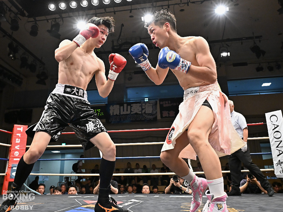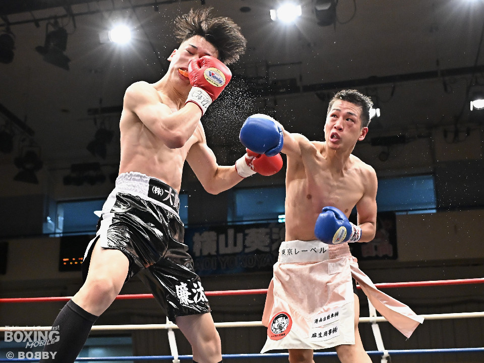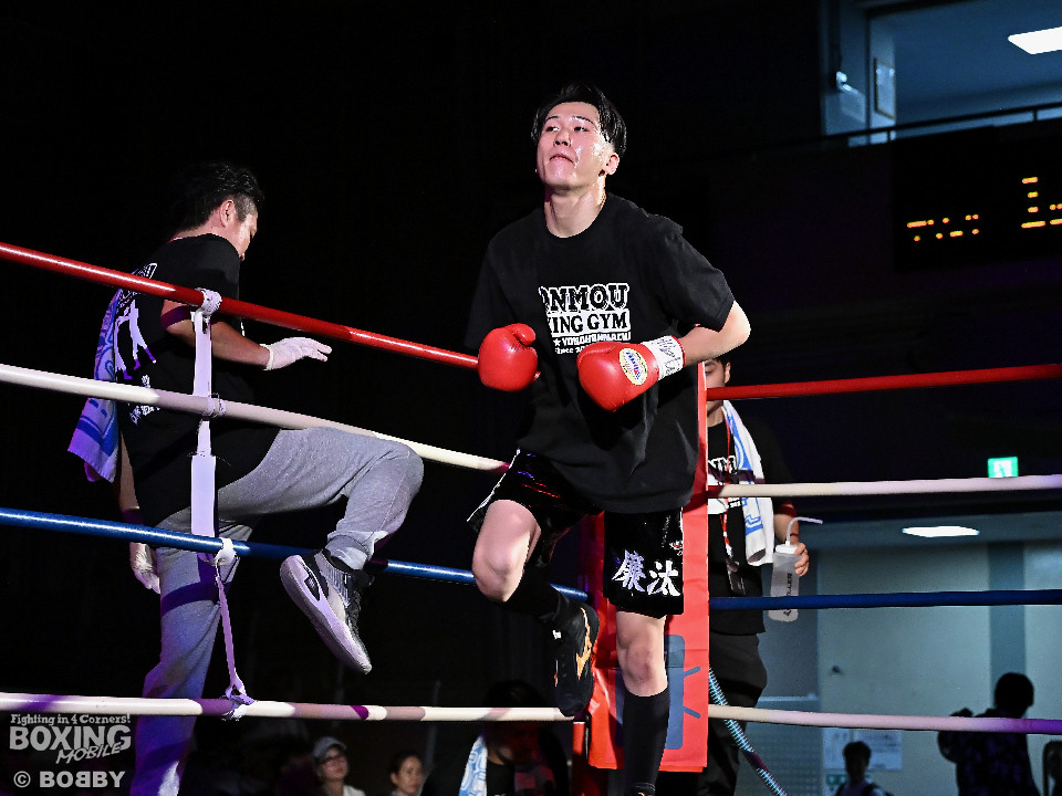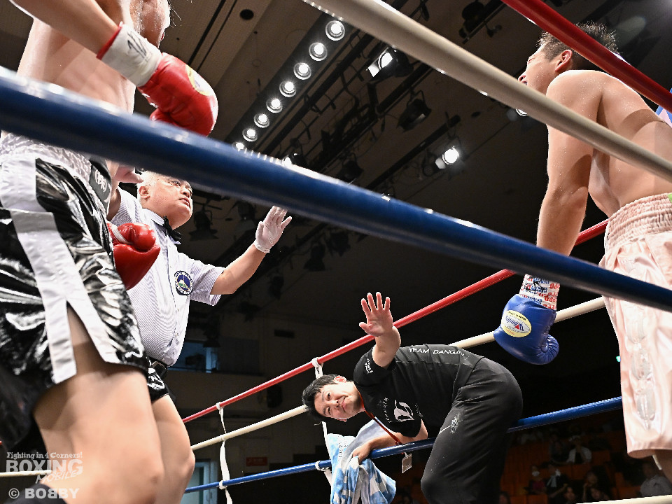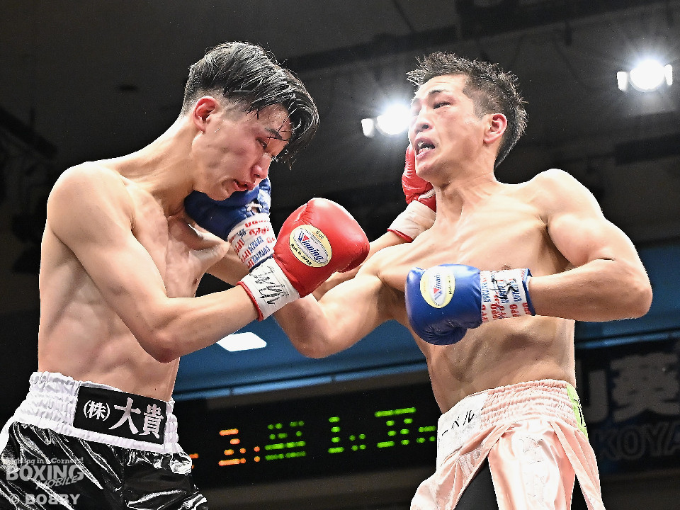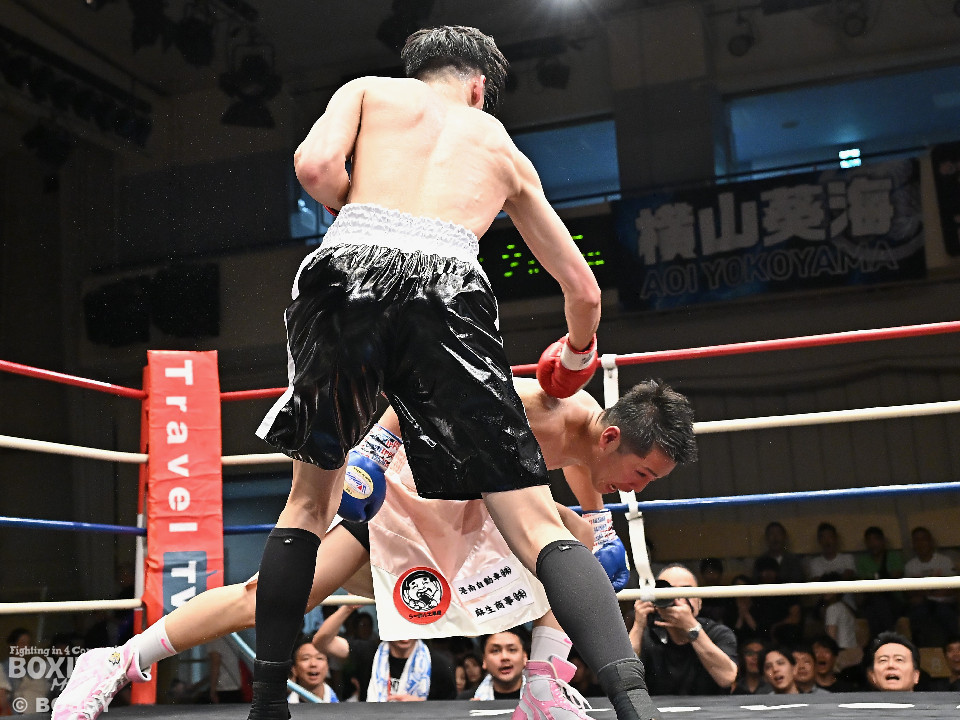 試合:倉持がジャブから左ボディにつなげて丁寧な組み立て。6年3ヶ月ぶりにカムバックした山本は、左フックを合わせるが後手に回った印象。2回、激しいパンチの応酬を繰り広げる中、山本はヒッティングで右目下を負傷。3回、倉本はワンツーで腰を沈めさせるとパンチをまとめたところで山本陣営が棄権を申し出た。倉持が初のKO勝ちでB級昇格を決めた。
