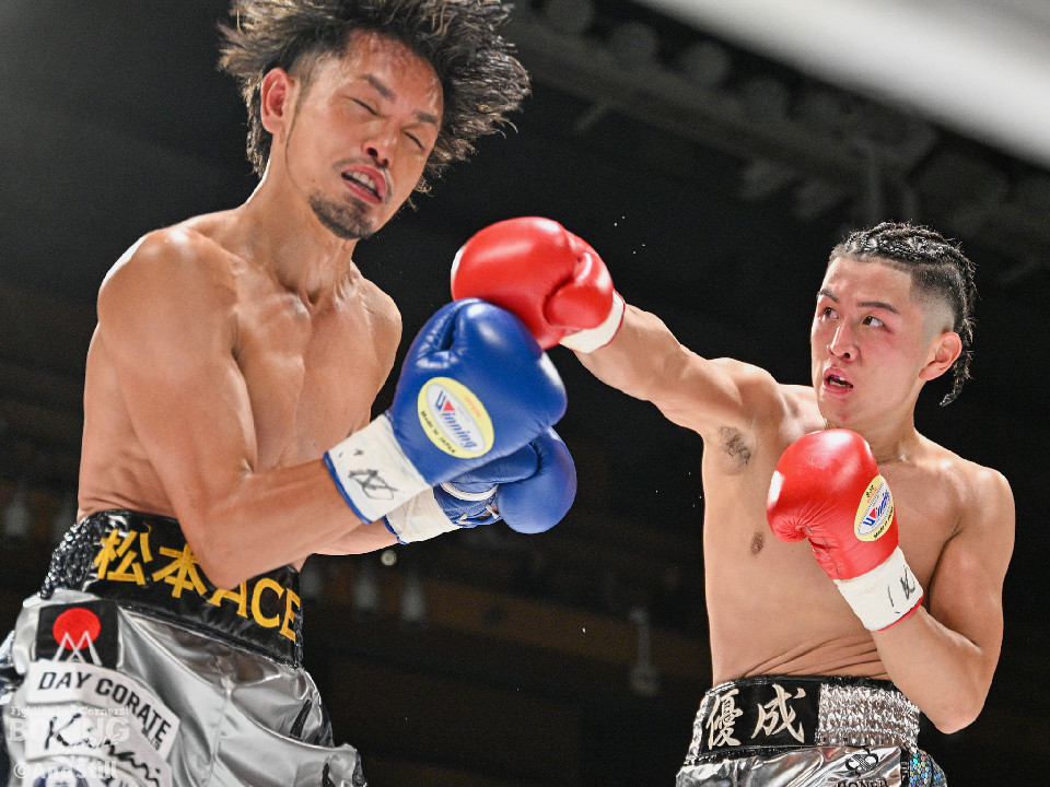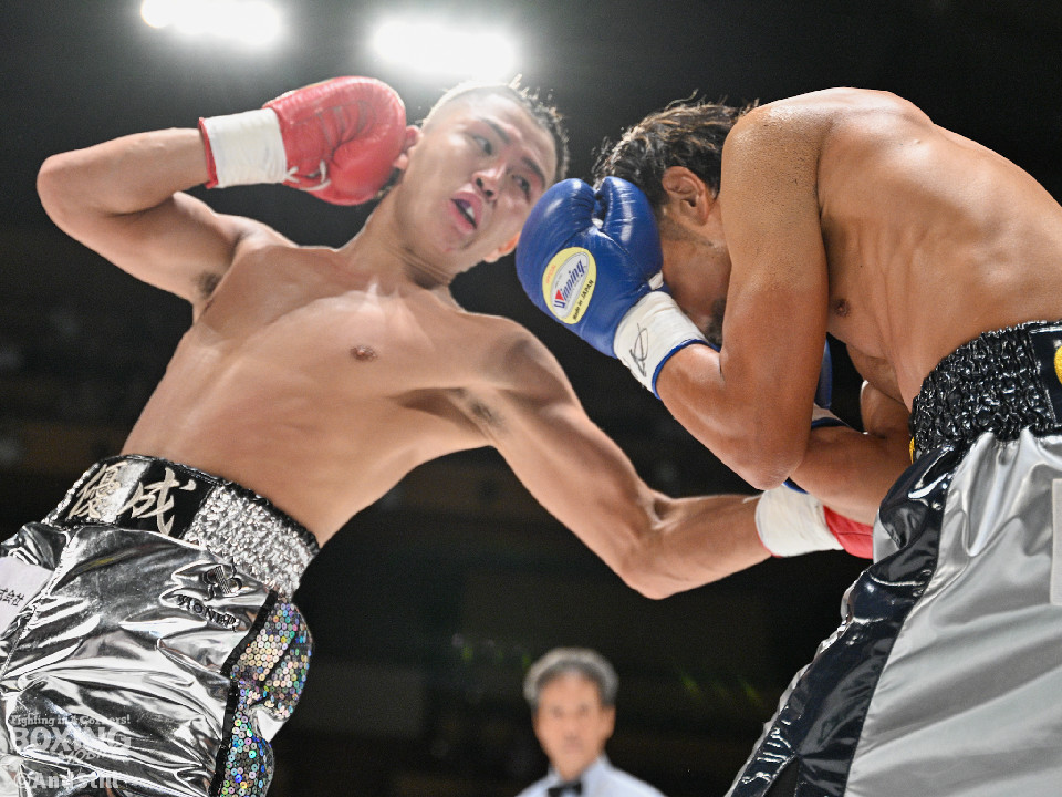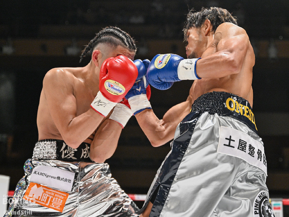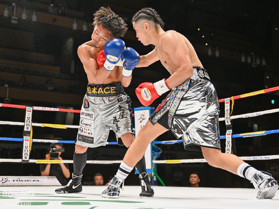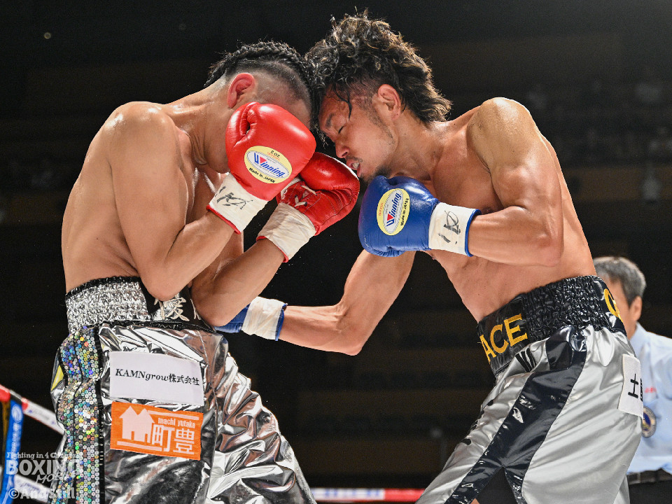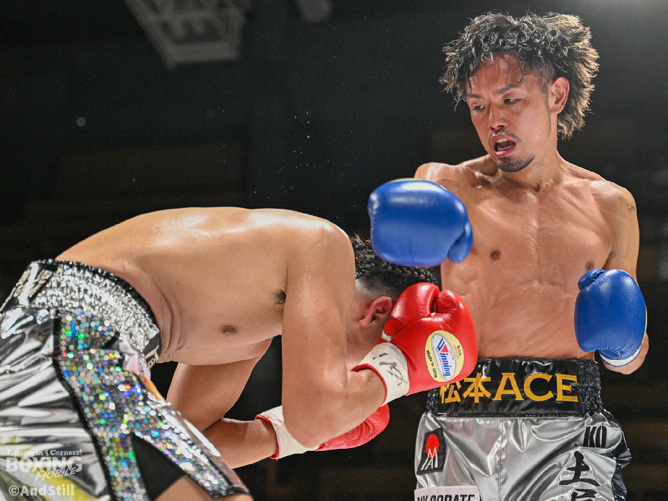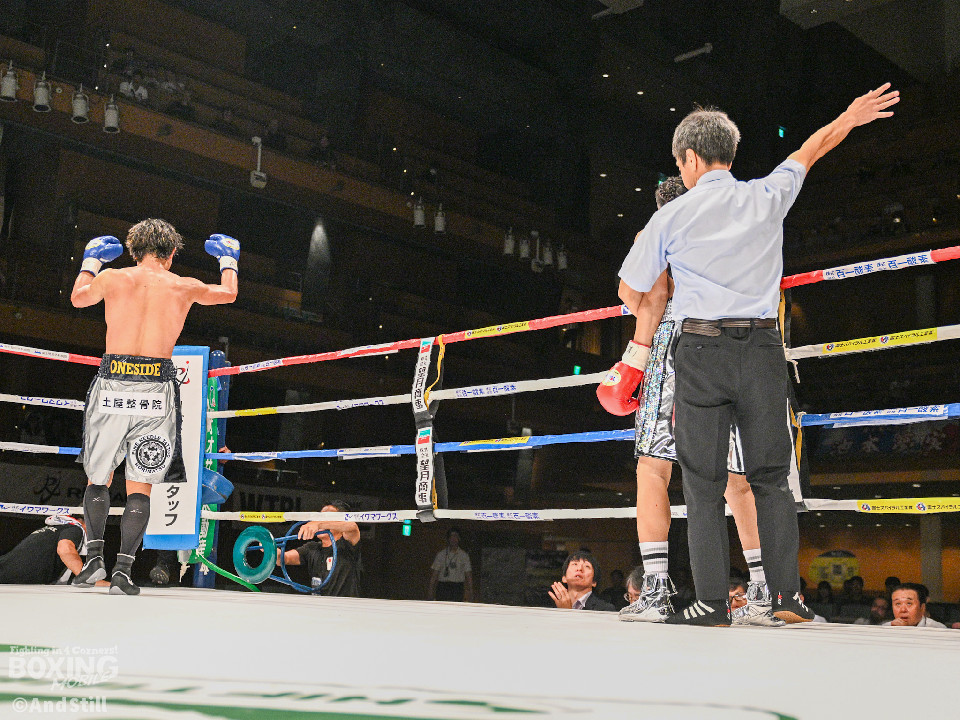 試合:アッパーでリズムを作る土屋に対して、初回、白井はジャブと左ボディで応戦、右ストレートも見せた。2回、右アッパーからの連打で仕掛けてきた土屋に対して、白井は右ストレートと左ボディを返すが、土屋は手数を増やして連打を続けた。3回はサイドステップで切り替えながら土屋のプレスを外した白井だが、土屋が右アッパーの後に左右の連打をまとめたところで、レフェリーが試合を止めた。