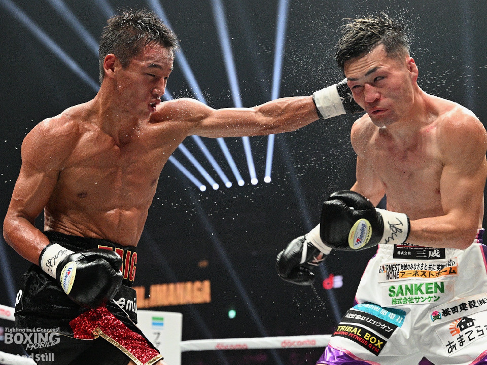 試合:空位の日本ライト級王座を懸けて村上と今永が対峙した。サウスポー同士による一戦は、村上がワンツーから仕掛けるが、今永は落ち着いた試合運びを見せると単発の左ボディストレートをヒット。2回、左右をまとめた村上だが、今永はブロックで冷静に対応。3回、今永はプレスをかけて左クロスをヒット。鼻先だがポイントをアピールするには十分だ。今永は上下に打ち分け積極的な攻撃。被弾は最小限に抑えた村上だが、突破口を開けず。続く回も今永のラウンド。ロープに詰めて連打で攻勢。前半終了時の公開採点は50-45×で今永がリード。6回、流れを変えたい村上は細かくまとめるが、今永は真っ向から迎え撃つと右ボディを好打。8回、村上はプレスをかけてワンツーを軸にアグレッシブな姿勢。9回、今永は左クロスで顔を弾き見栄えの良さをアピール。手数をまとめて意地を見せた村上だが、流れを変えるまでには至らず。10回、ギアを上げた今永は倒しに行く姿勢。最後まで勝負を諦めない村上を振り切った。今永が判定勝ちで新チャンピオンに輝いた。