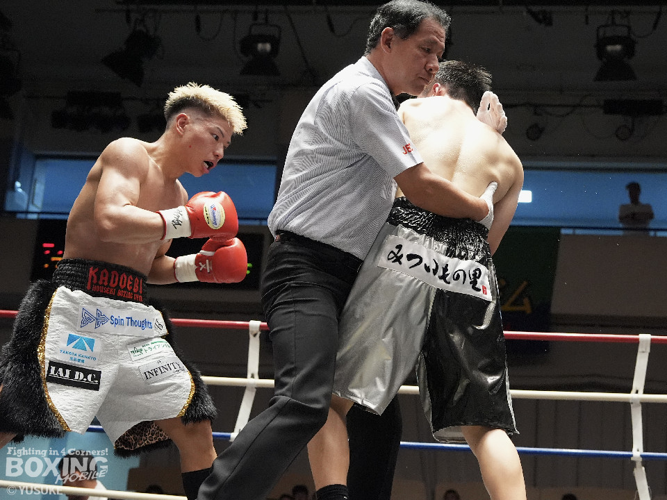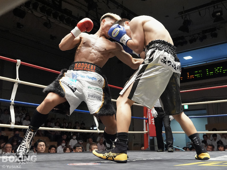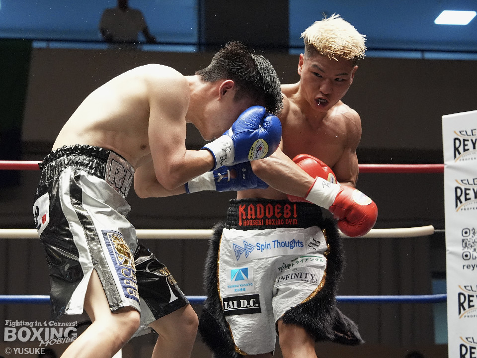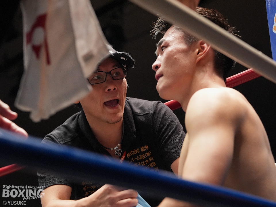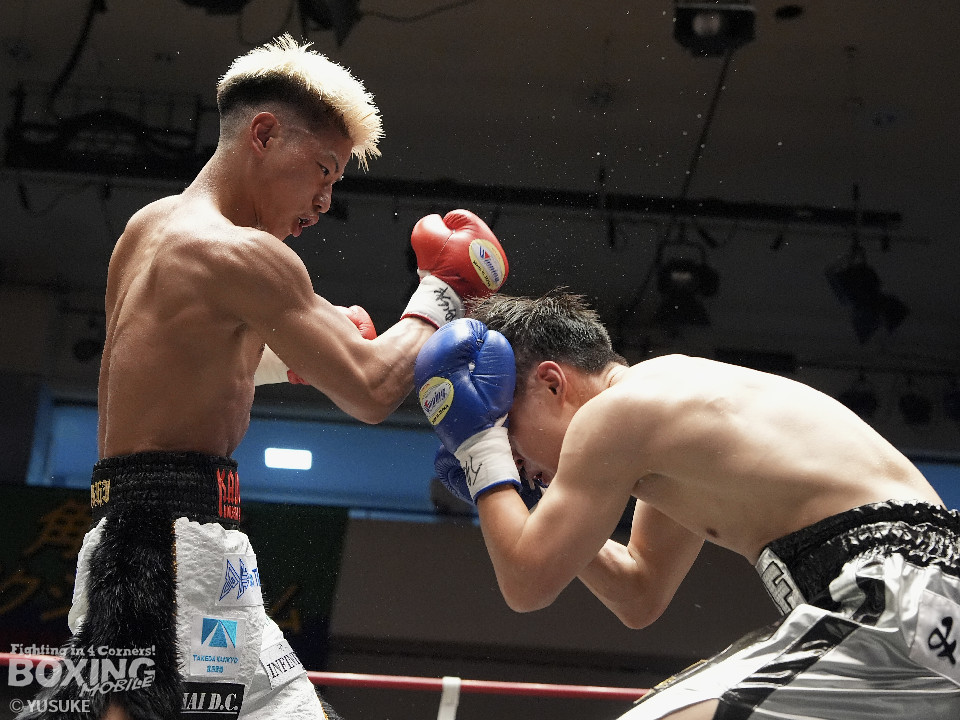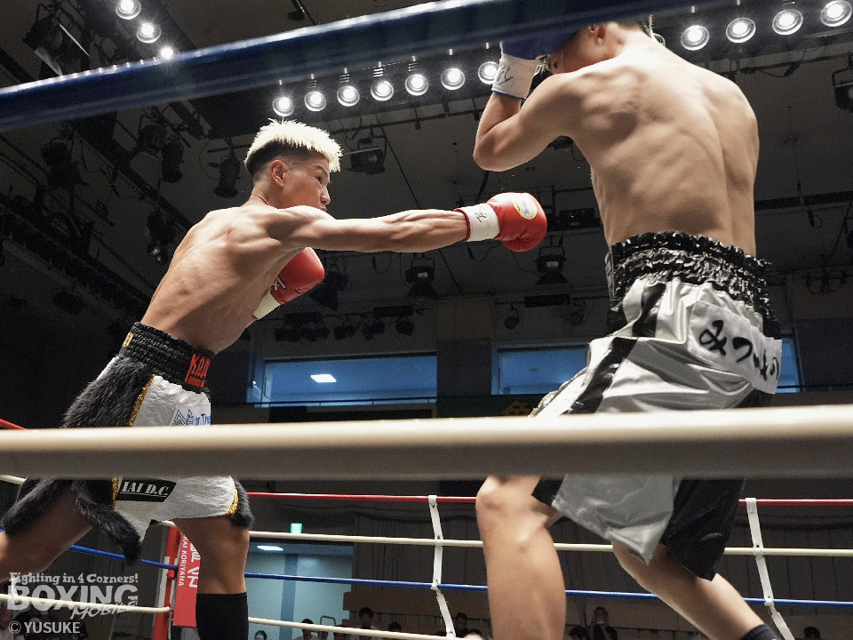 試合:村山がガードを固めながらタイミングを探ると右クロスでバランスを崩させて先制。2回、西本は右アッパー、ワンツーでテンポの良い攻撃で反撃。打ち終わりを狙う村山だが後手に回った印象。3回、至近距離で激しいパンチの応酬。村山が左ボディを突き刺せば、西本も力強い右フックを叩きつけて消耗戦へ。4回、村山は左のダブルのコンビネーションを決めるが、ここを踏ん張った西本は回転力を活かした連打で攻勢。右フックを叩きつけたところで村山陣営からタオルが投げ込まれた。