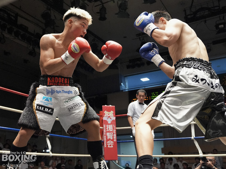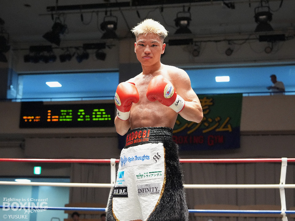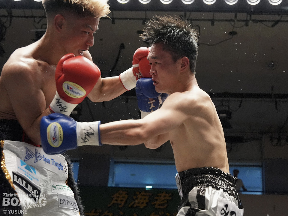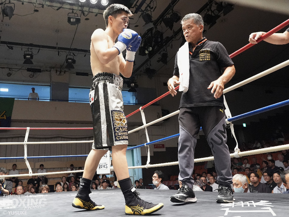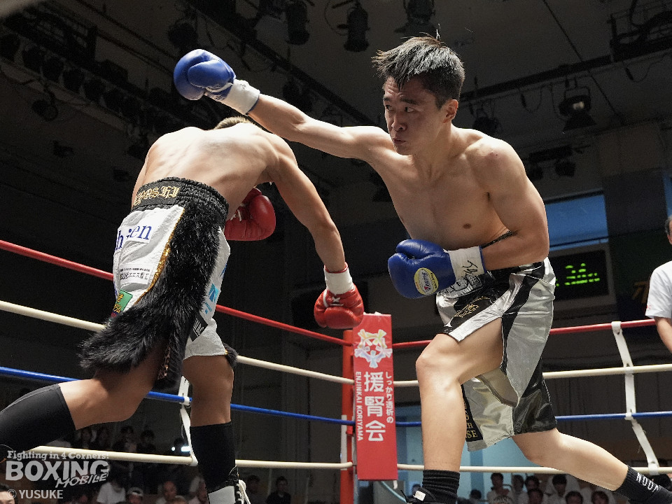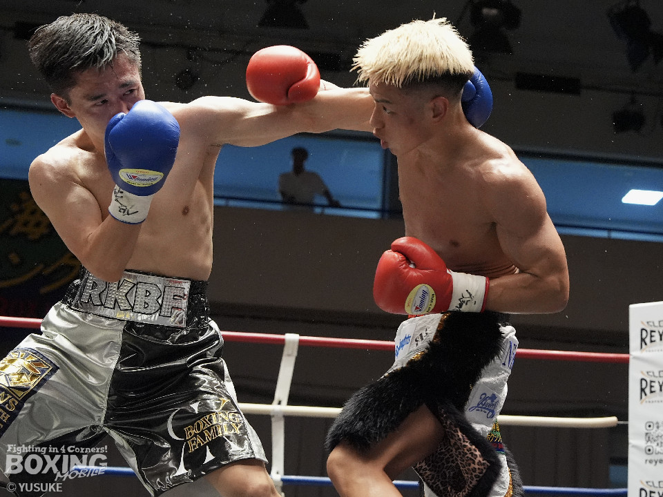 試合:村山がガードを固めながらタイミングを探ると右クロスでバランスを崩させて先制。2回、西本は右アッパー、ワンツーでテンポの良い攻撃で反撃。打ち終わりを狙う村山だが後手に回った印象。3回、至近距離で激しいパンチの応酬。村山が左ボディを突き刺せば、西本も力強い右フックを叩きつけて消耗戦へ。4回、村山は左のダブルのコンビネーションを決めるが、ここを踏ん張った西本は回転力を活かした連打で攻勢。右フックを叩きつけたところで村山陣営からタオルが投げ込まれた。