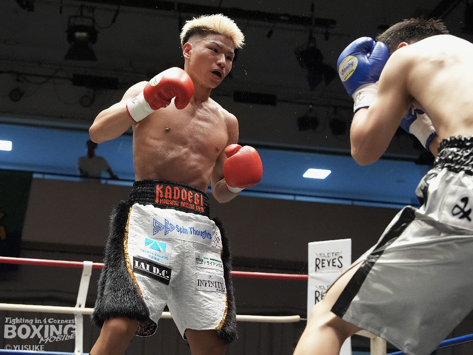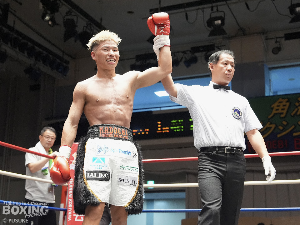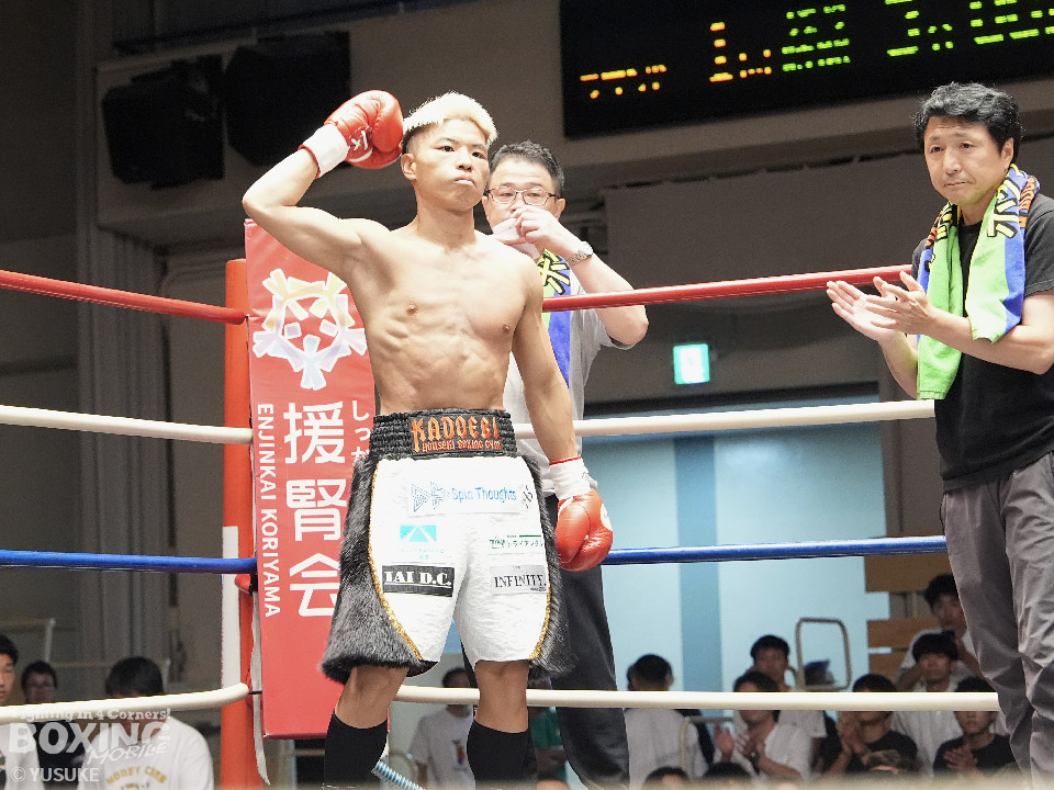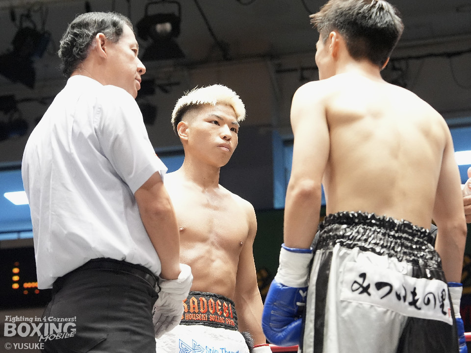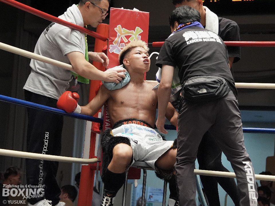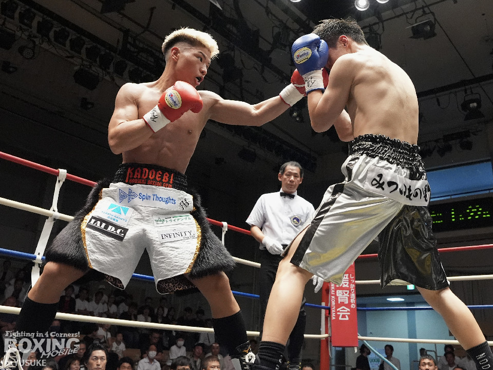 試合:村山がガードを固めながらタイミングを探ると右クロスでバランスを崩させて先制。2回、西本は右アッパー、ワンツーでテンポの良い攻撃で反撃。打ち終わりを狙う村山だが後手に回った印象。3回、至近距離で激しいパンチの応酬。村山が左ボディを突き刺せば、西本も力強い右フックを叩きつけて消耗戦へ。4回、村山は左のダブルのコンビネーションを決めるが、ここを踏ん張った西本は回転力を活かした連打で攻勢。右フックを叩きつけたところで村山陣営からタオルが投げ込まれた。