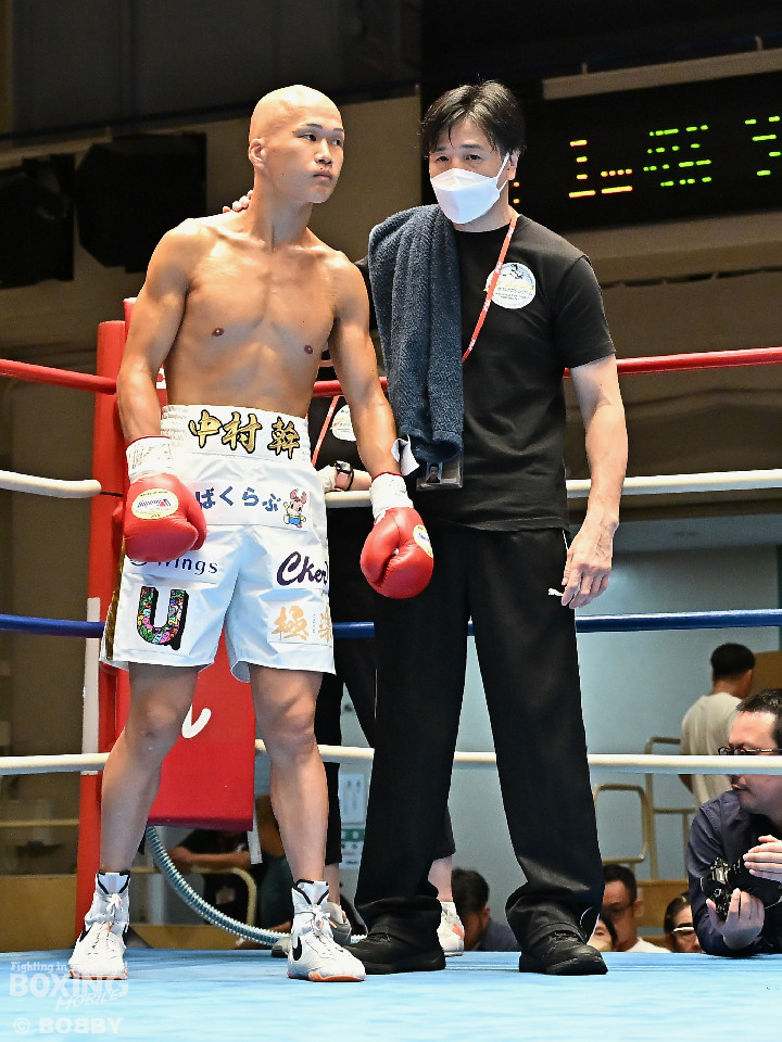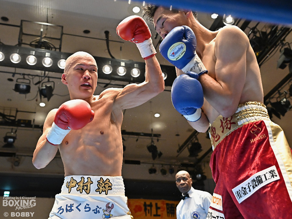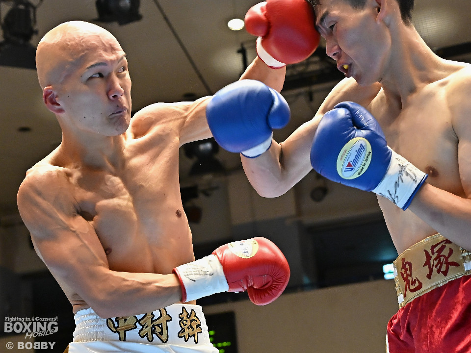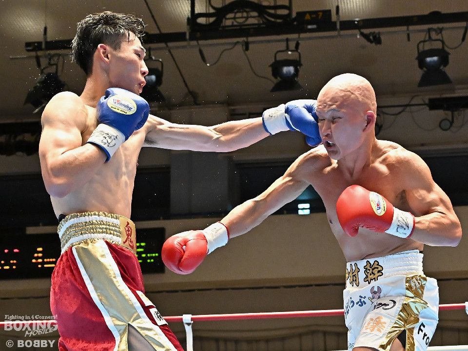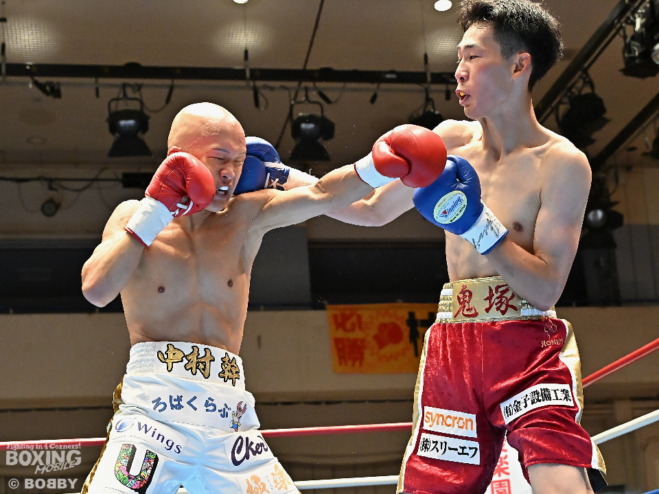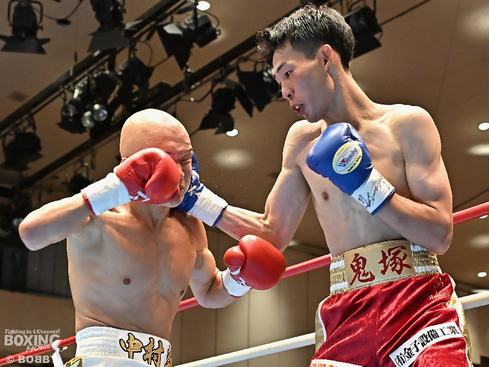 試合:中村がボディにコツコツと集めて積極的に攻めるが、サウスポー鬼塚は左カウンターで膝を揺らして応戦。2回、中村はプッシュしながら、しつこいボクシングを展開。3回、鬼塚は打ち下ろしの左ストレートでガクッと腰を沈めさせると連打で攻勢。4回、鬼塚は左ボディストレートを差し込むと回転力を活かした連打で攻め立てて粘る相手を振り切った。