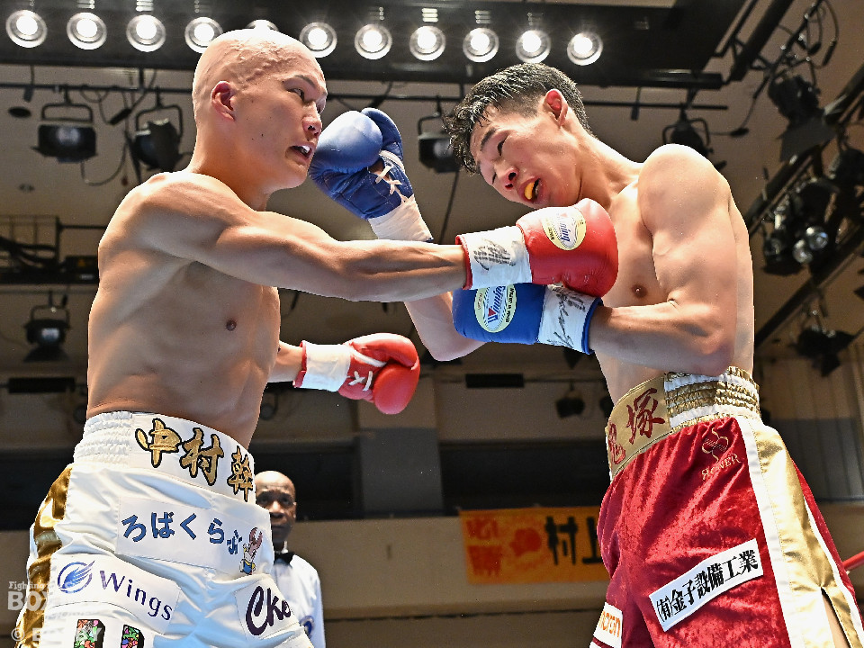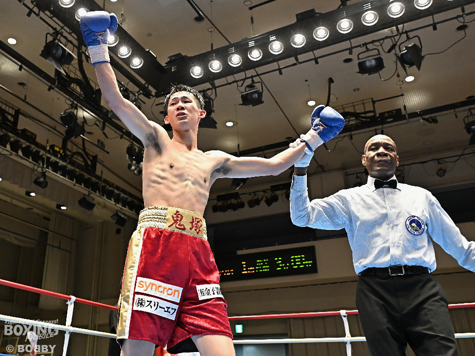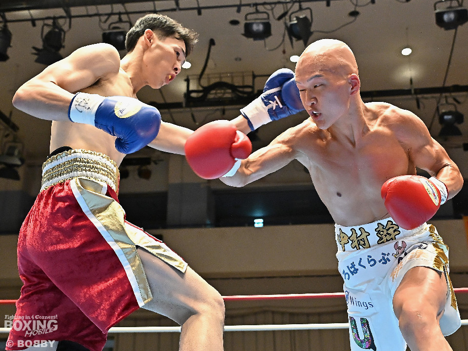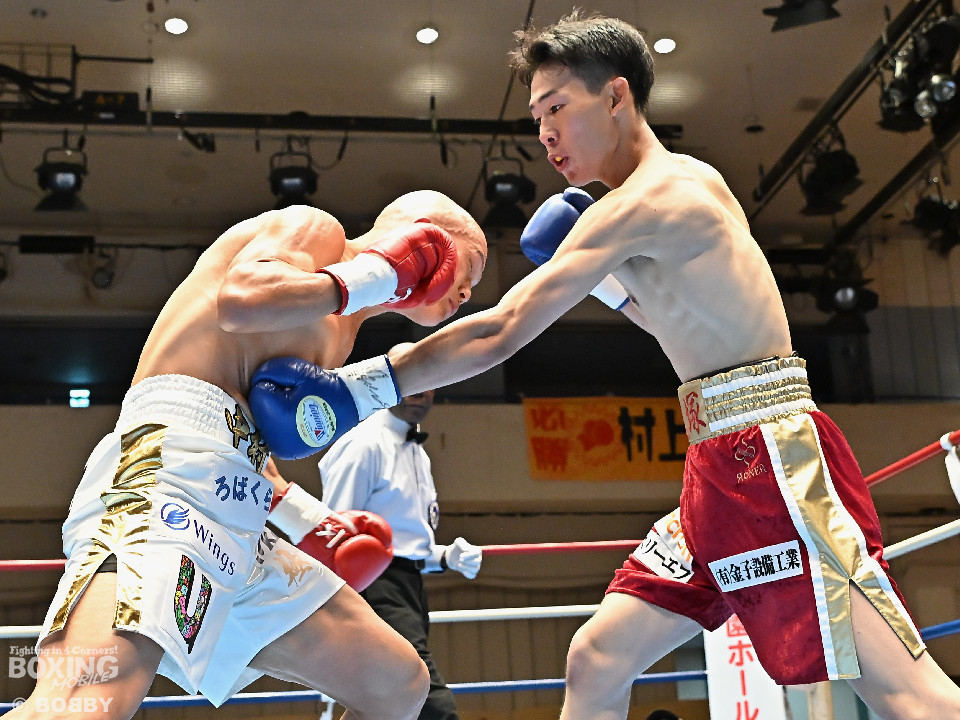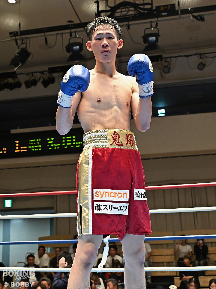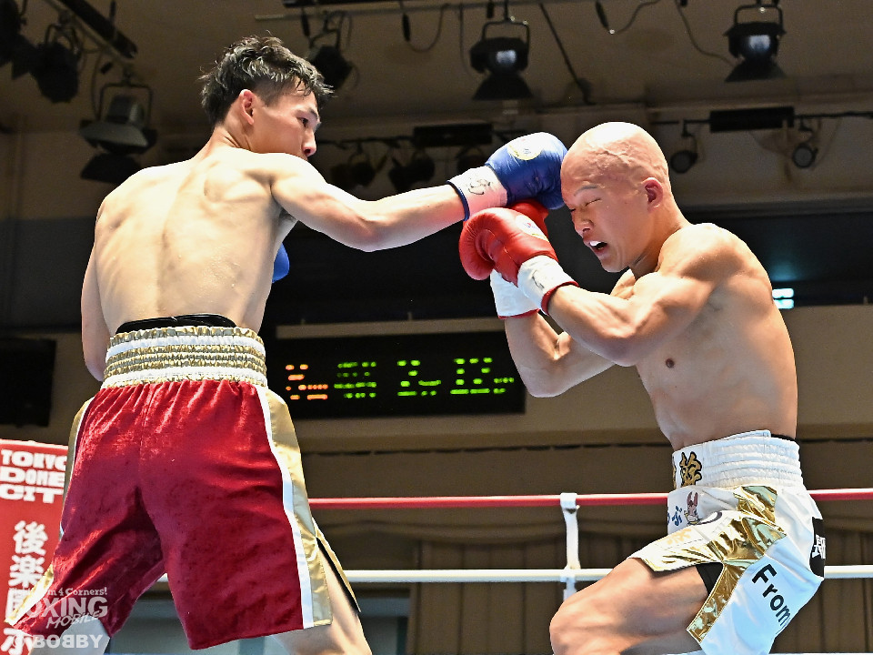 試合:中村がボディにコツコツと集めて積極的に攻めるが、サウスポー鬼塚は左カウンターで膝を揺らして応戦。2回、中村はプッシュしながら、しつこいボクシングを展開。3回、鬼塚は打ち下ろしの左ストレートでガクッと腰を沈めさせると連打で攻勢。4回、鬼塚は左ボディストレートを差し込むと回転力を活かした連打で攻め立てて粘る相手を振り切った。