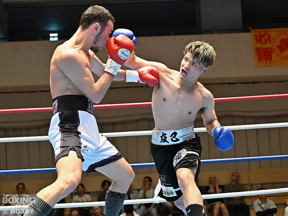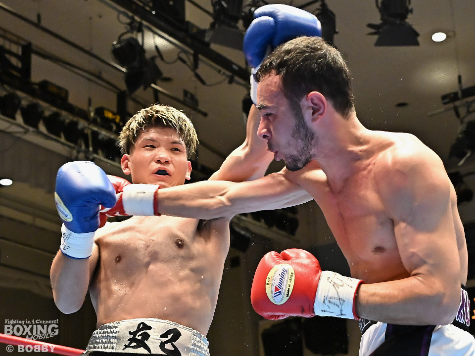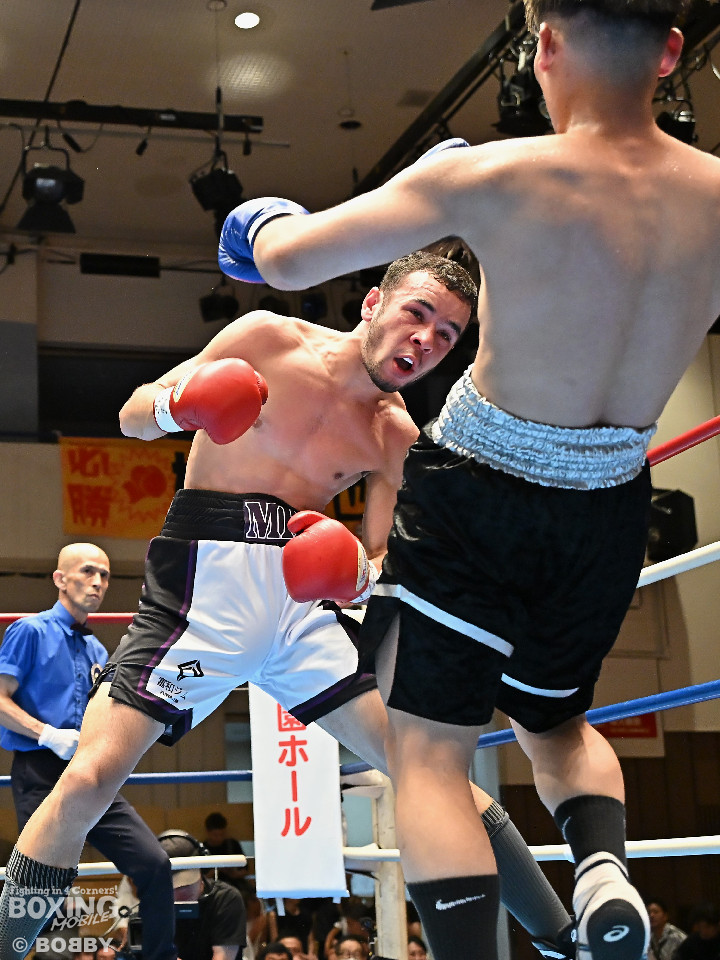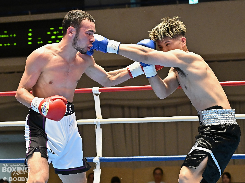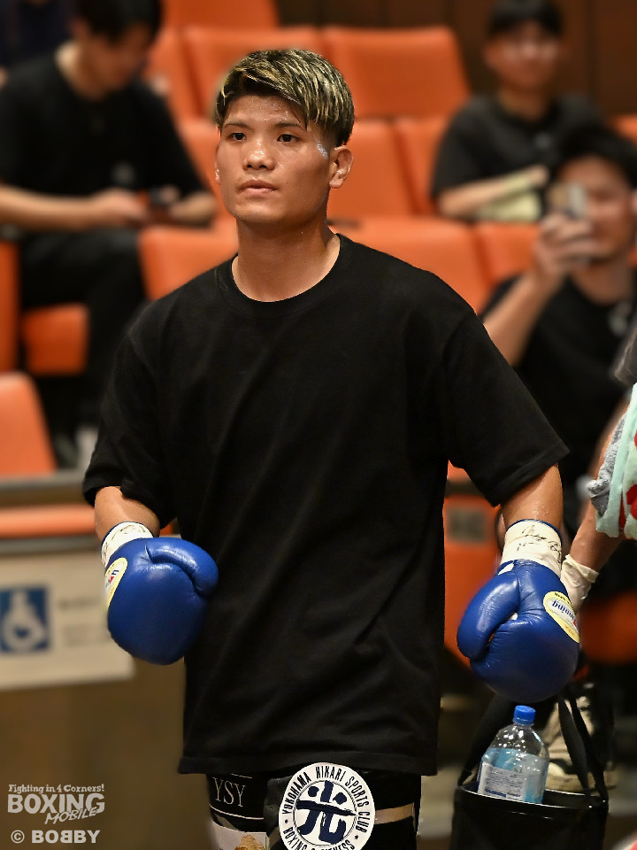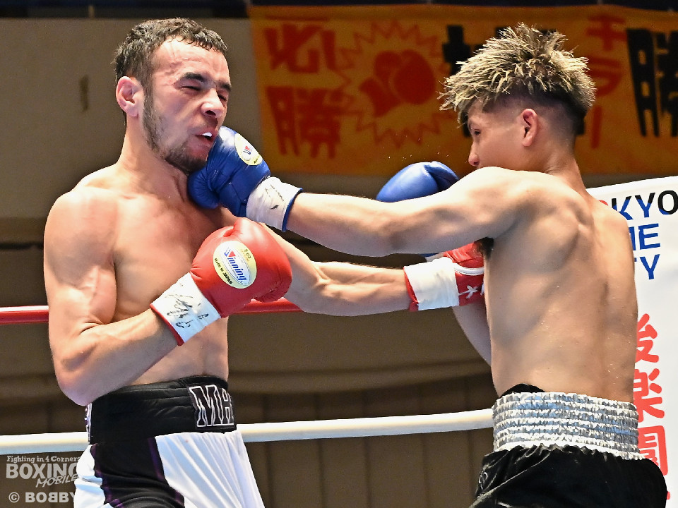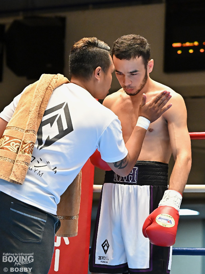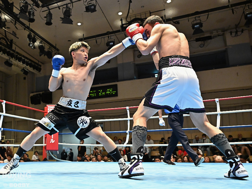 試合:永野がステップを刻みながらワンツーで迎え撃ちリズム感のある攻撃を披露。2回、永野は相手のリターンを警戒しながら機動力を活かしたボクシングを展開。ウズベキスタン人ボクサーのムロドジョンは、打ち合いに持ち込みたいが思い通りにできず。3回、ムロドジョンは距離を詰めて右フックで反撃。ラウンド終盤には左アッパーで顔を弾いた。勢いづいたムロドジョンは4回、前に出てグイグイと攻め立てるが、永野は意を決して打ち合うと連打で押し返した。ジャッジ2者の支持を得た永野が初勝利した。