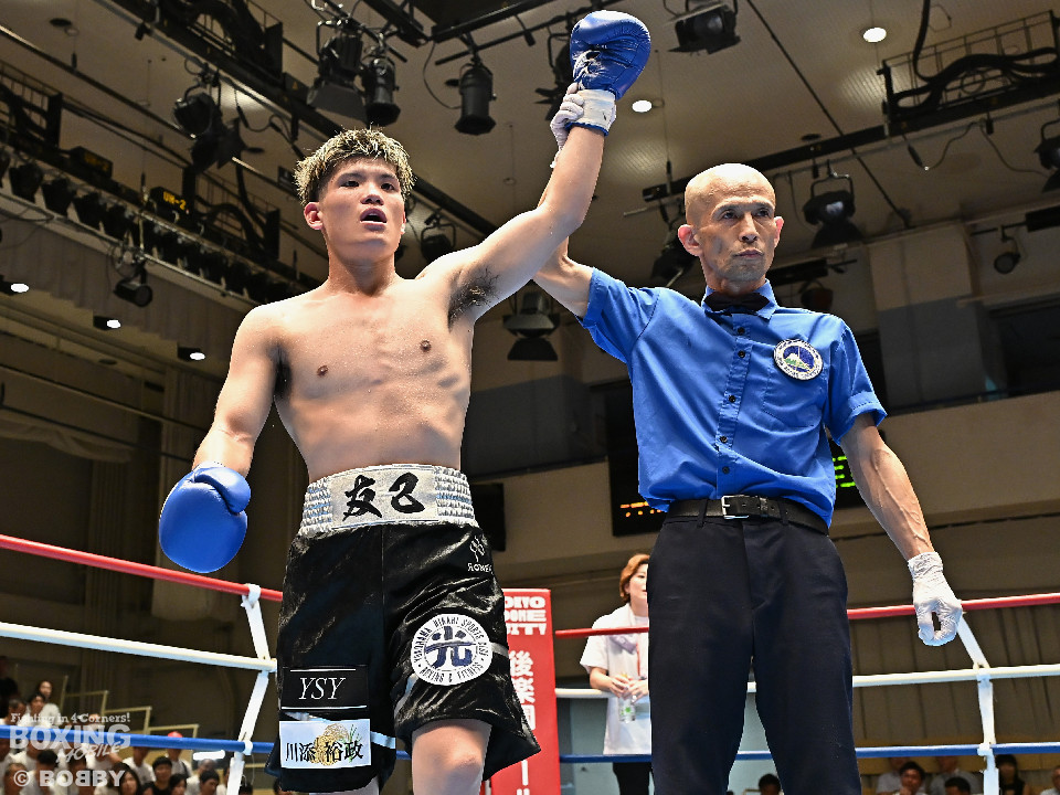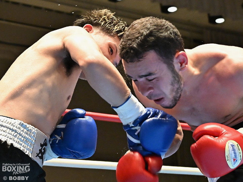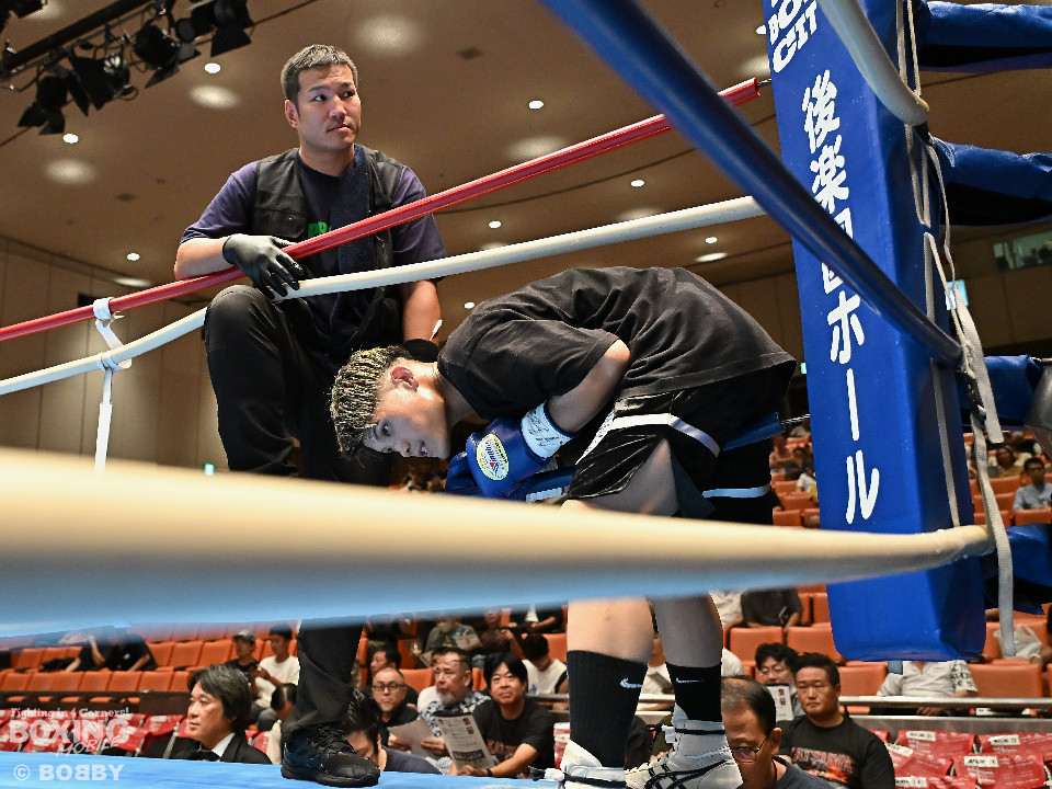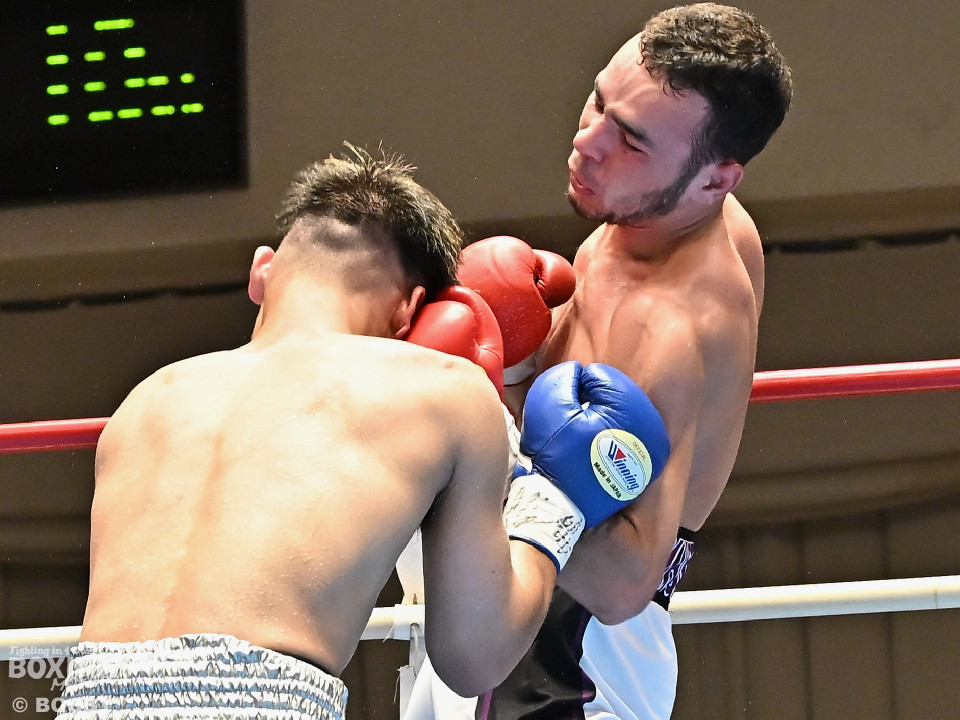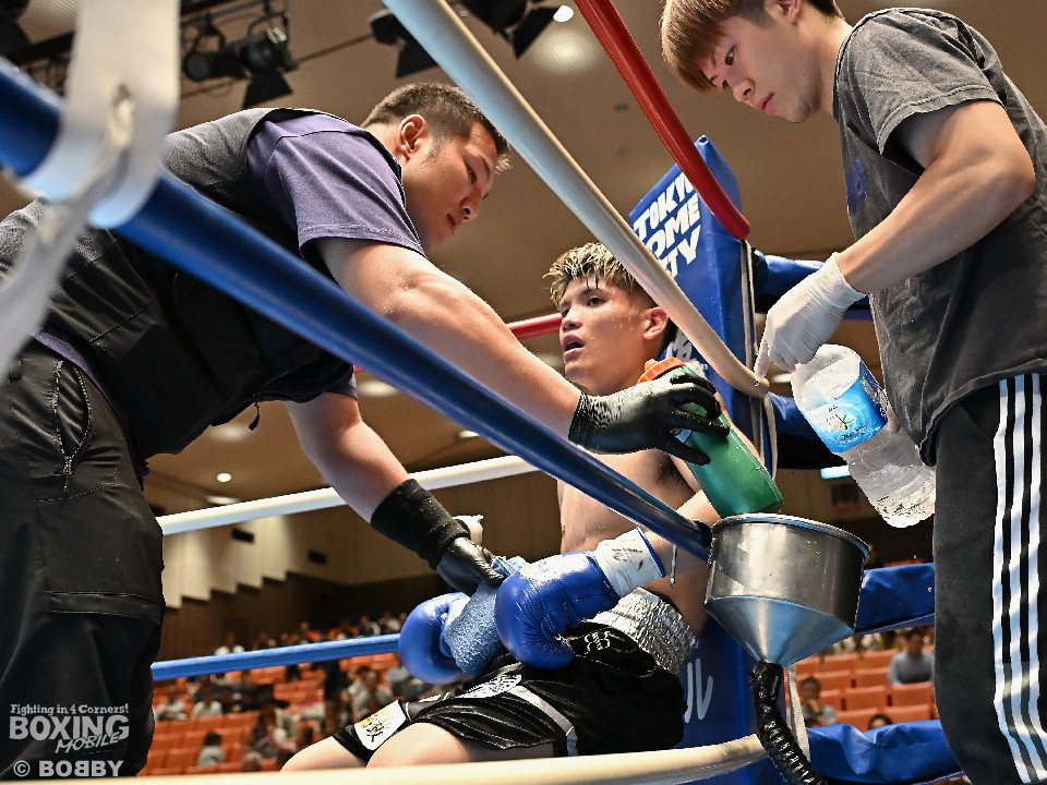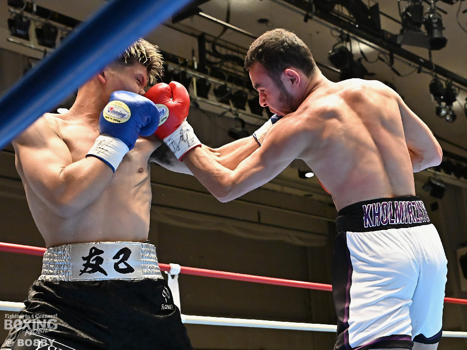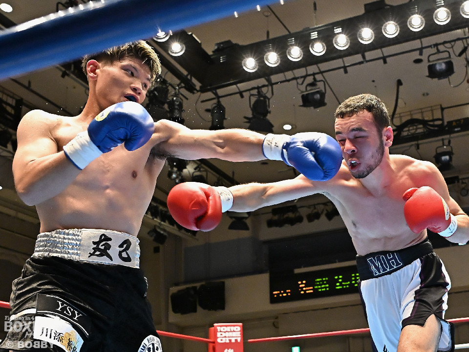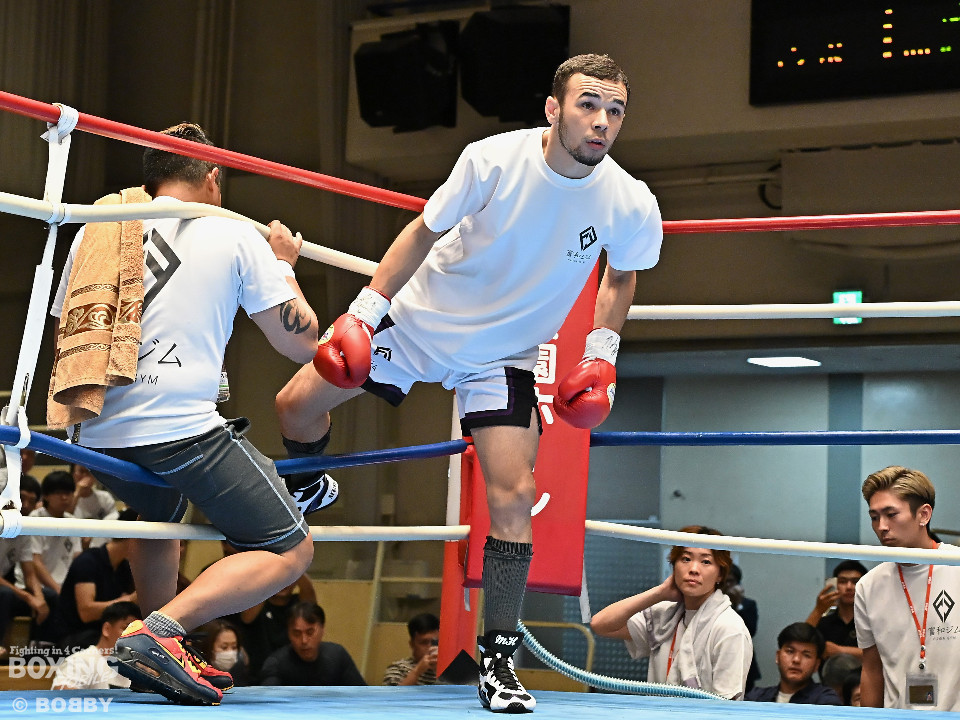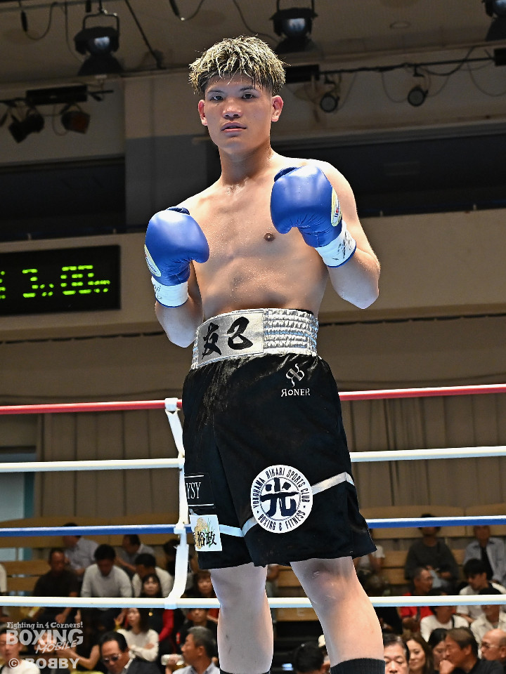 試合:永野がステップを刻みながらワンツーで迎え撃ちリズム感のある攻撃を披露。2回、永野は相手のリターンを警戒しながら機動力を活かしたボクシングを展開。ウズベキスタン人ボクサーのムロドジョンは、打ち合いに持ち込みたいが思い通りにできず。3回、ムロドジョンは距離を詰めて右フックで反撃。ラウンド終盤には左アッパーで顔を弾いた。勢いづいたムロドジョンは4回、前に出てグイグイと攻め立てるが、永野は意を決して打ち合うと連打で押し返した。ジャッジ2者の支持を得た永野が初勝利した。