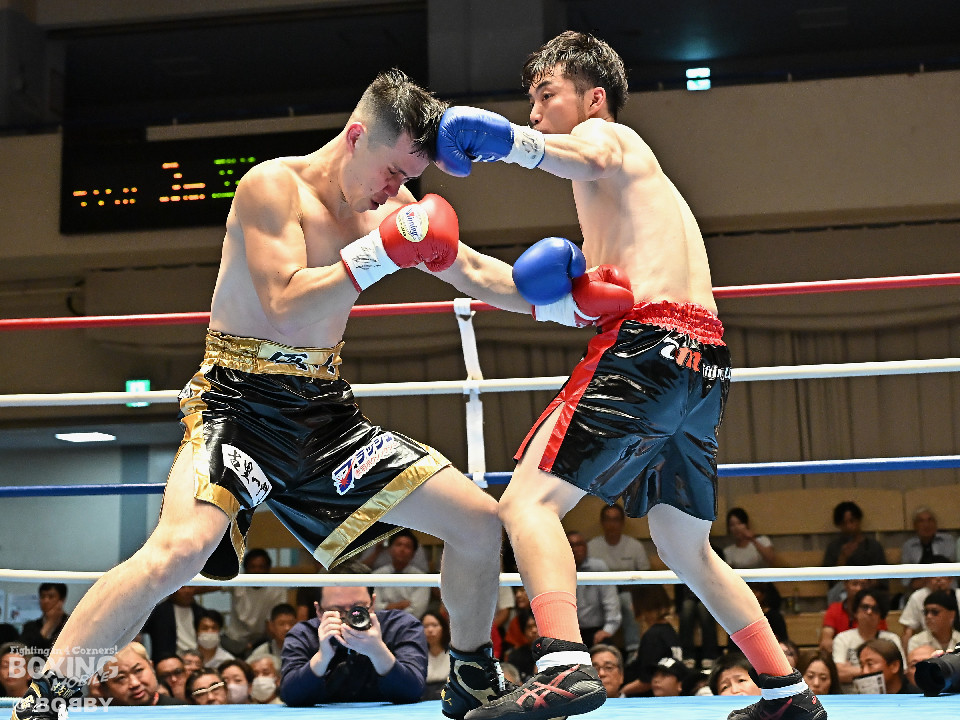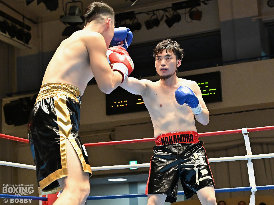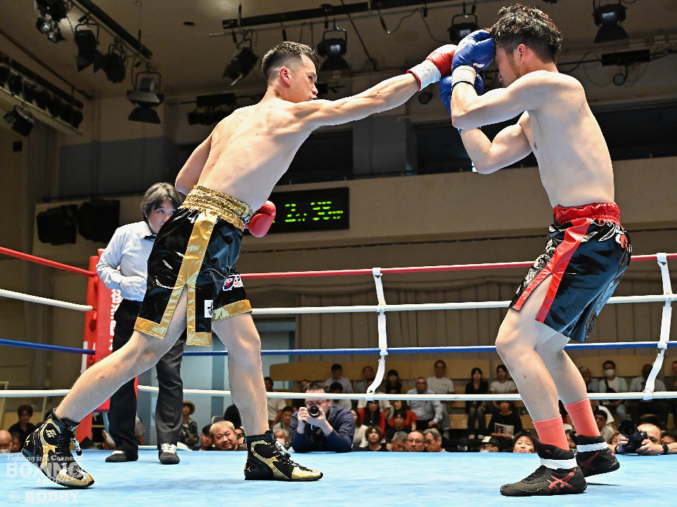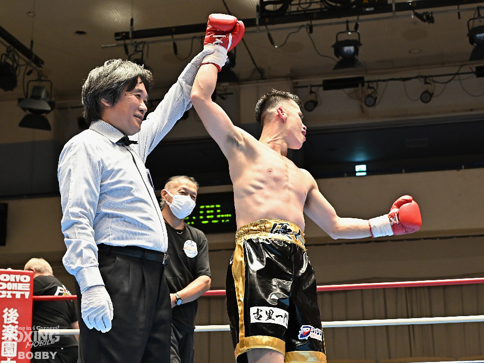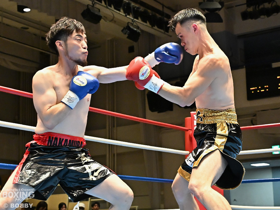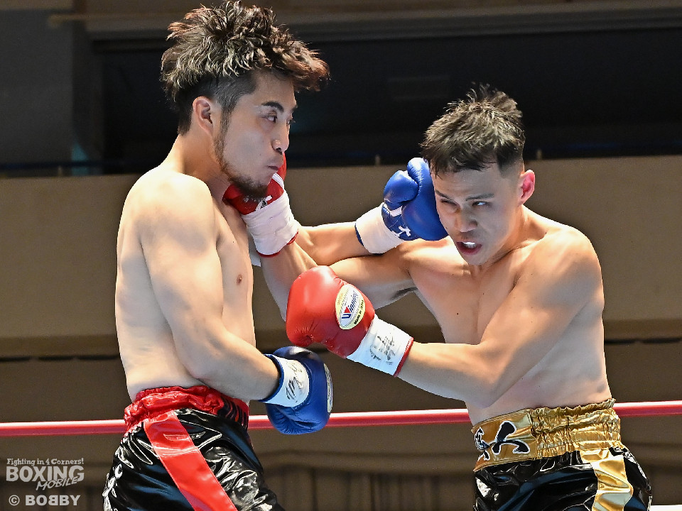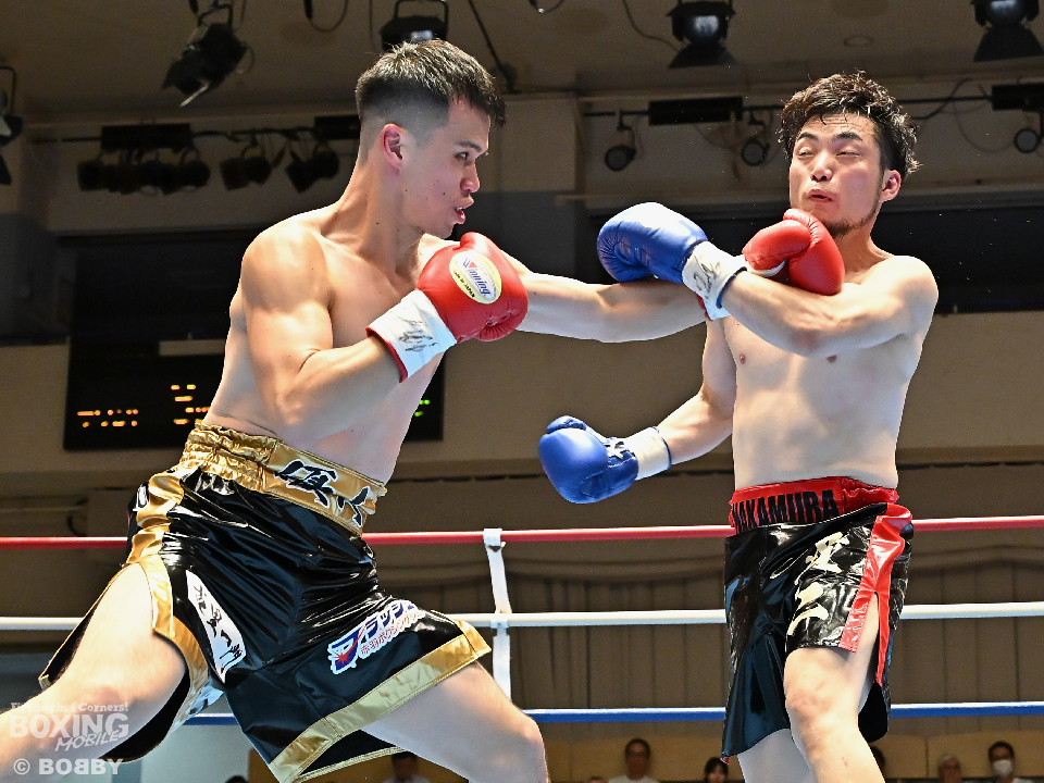試合:距離がかみ合わず決定打が出ない中、猪爪が単発の右フックをヒット。本来はオーソドックスの中村だがこの日は、サウスポーで挑んだ。2~3回、レフェリーに引き離される展開が続き、ジャッジ泣かせの試合。4回、頻繁にスイッチした中村は左右を振って攻め立てるが猪爪も負けじと右フックを返した。要所で右を当てた猪爪が勝利をつかんだ。