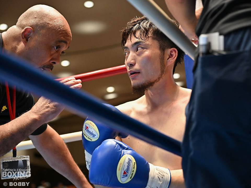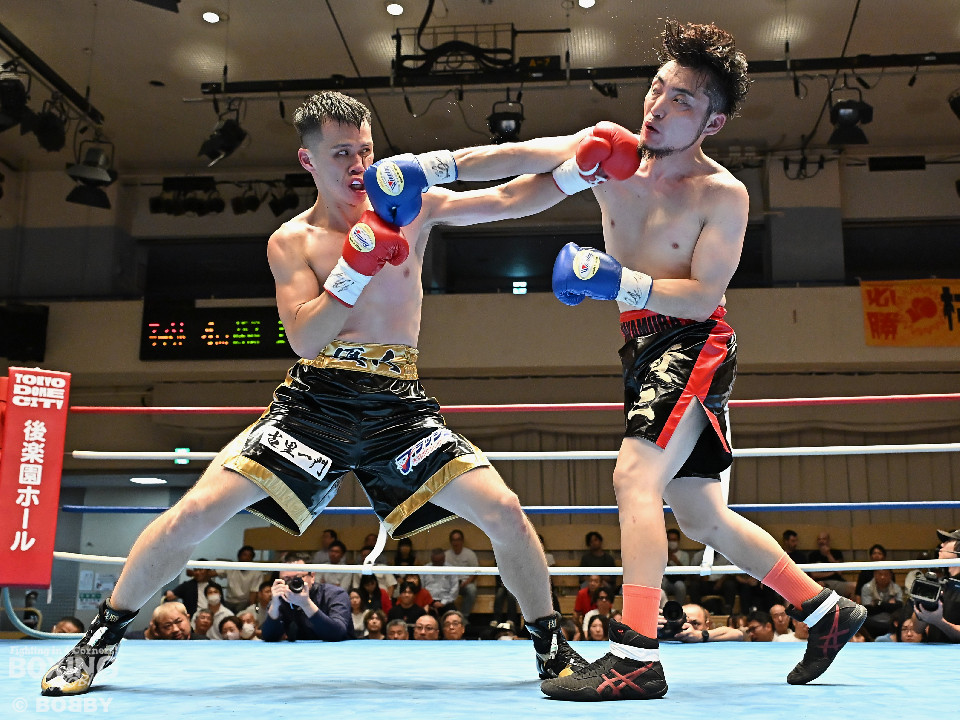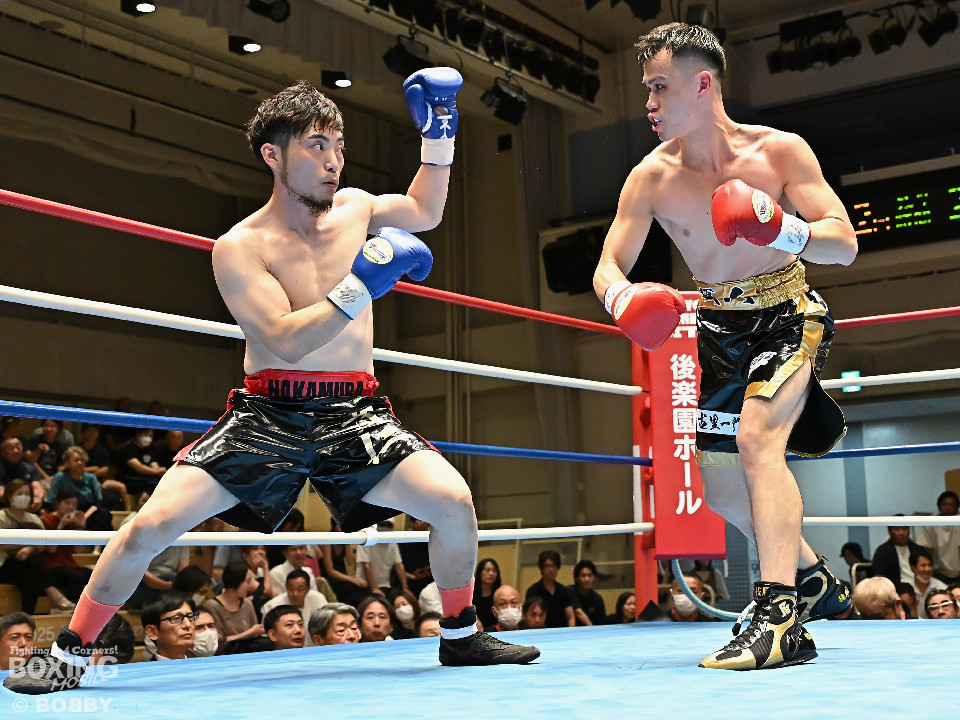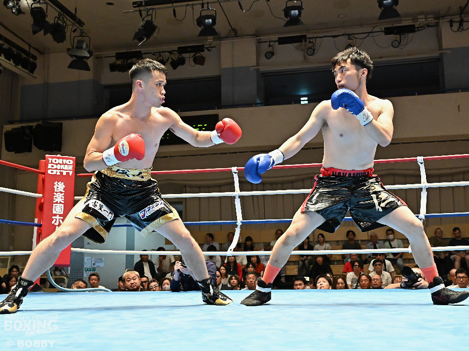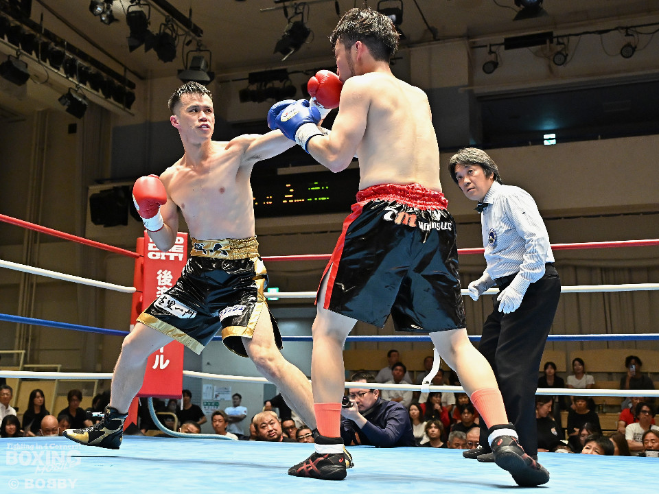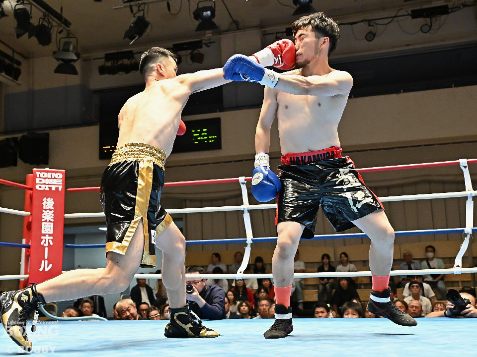試合:距離がかみ合わず決定打が出ない中、猪爪が単発の右フックをヒット。本来はオーソドックスの中村だがこの日は、サウスポーで挑んだ。2~3回、レフェリーに引き離される展開が続き、ジャッジ泣かせの試合。4回、頻繁にスイッチした中村は左右を振って攻め立てるが猪爪も負けじと右フックを返した。要所で右を当てた猪爪が勝利をつかんだ。