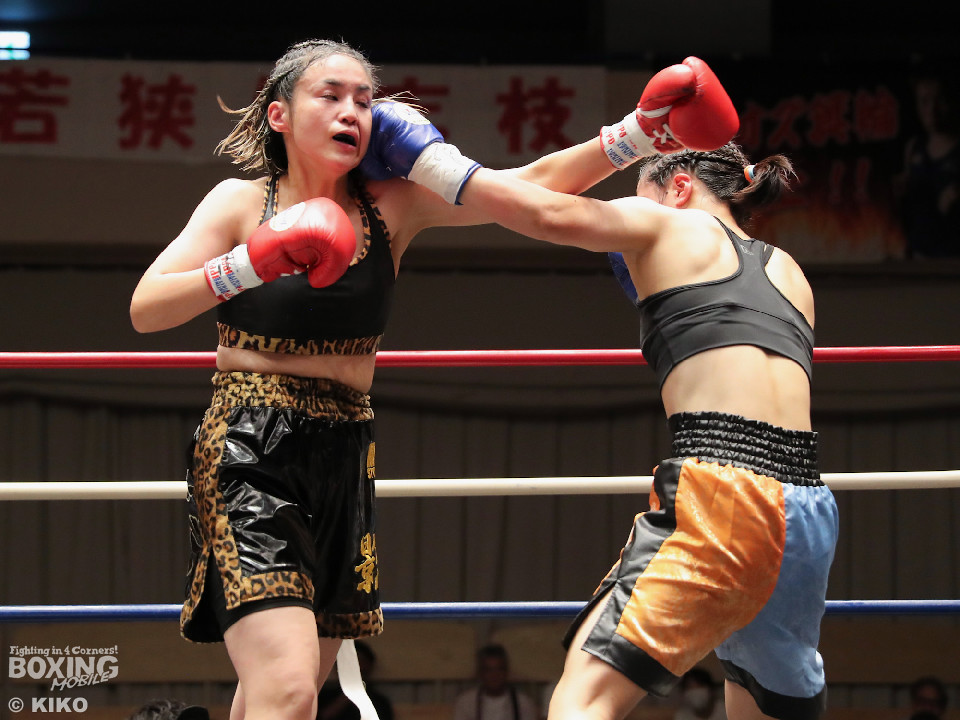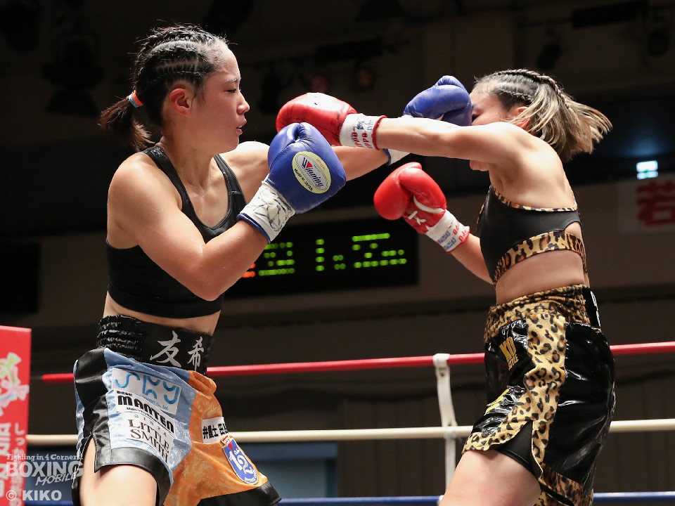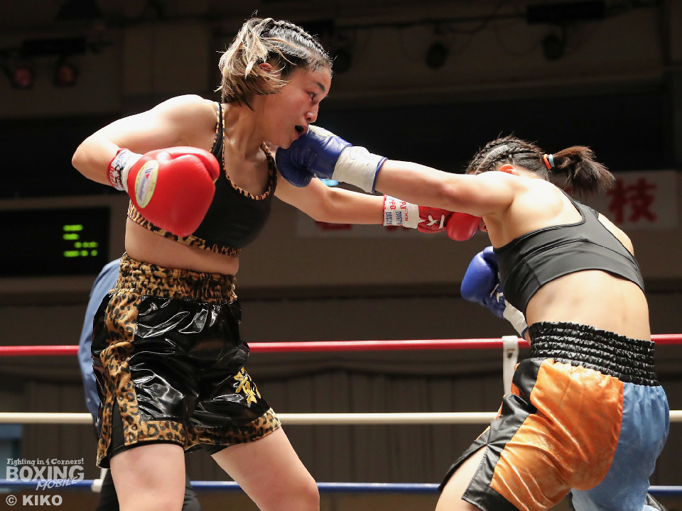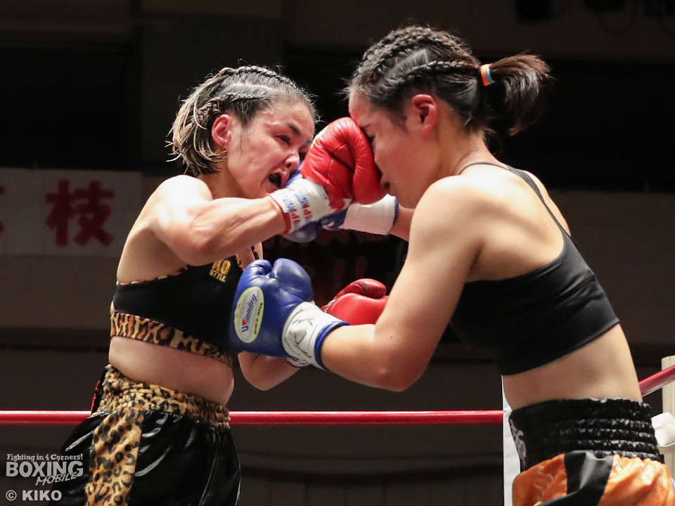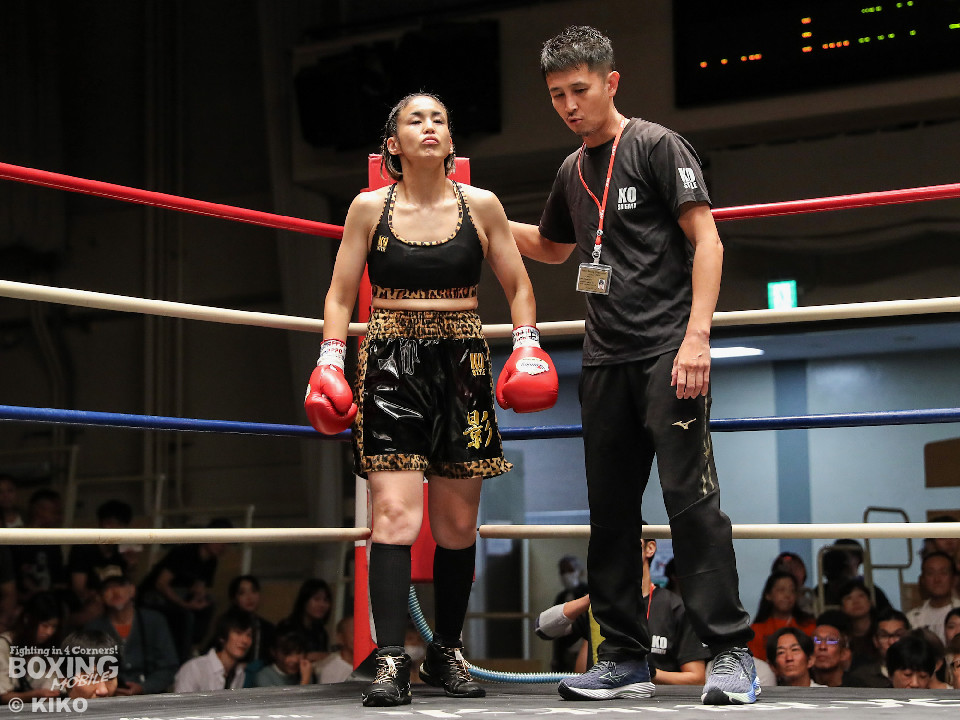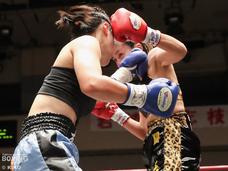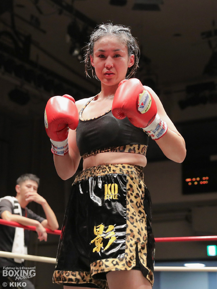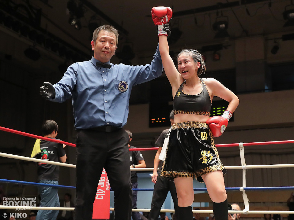 試合:開始から回転力を活かした打撃戦でスタート。影山が左右アッパーを決めれば、片山もパパっと手数をまとめて譲らず。2回、影山はプッシュしながらショートアッパーを軸にグイグイと攻め立てて攻勢。3回、片山は出入りを意識しながらワンツーをヒット。しかし、影山の勢いは止まらない。豊富なスタミナを活かして攻め立てた。勝負が決まったのは4回、影山は残っているスタミナを使い果たすがごとく、左右をまとめてレフェリーストップに持ち込んだ。