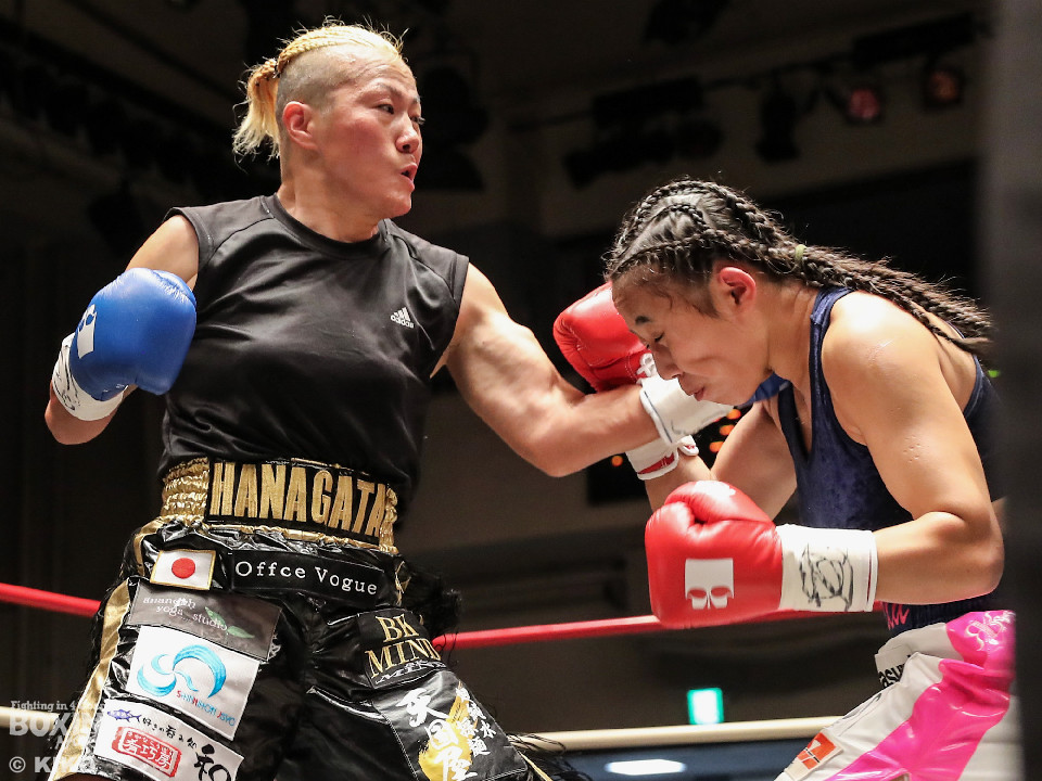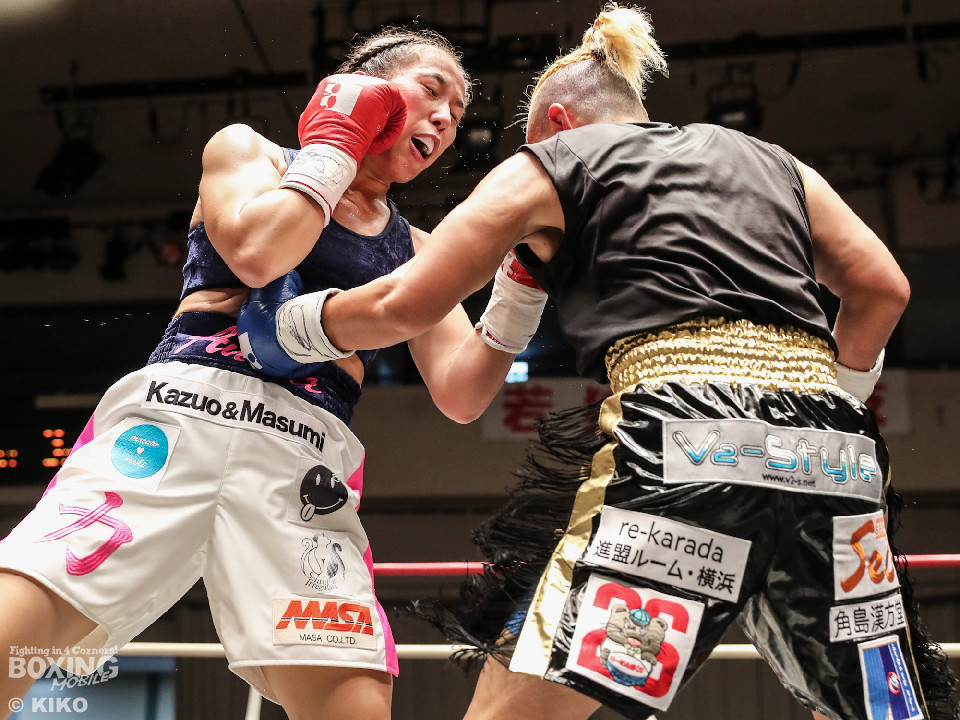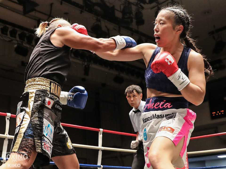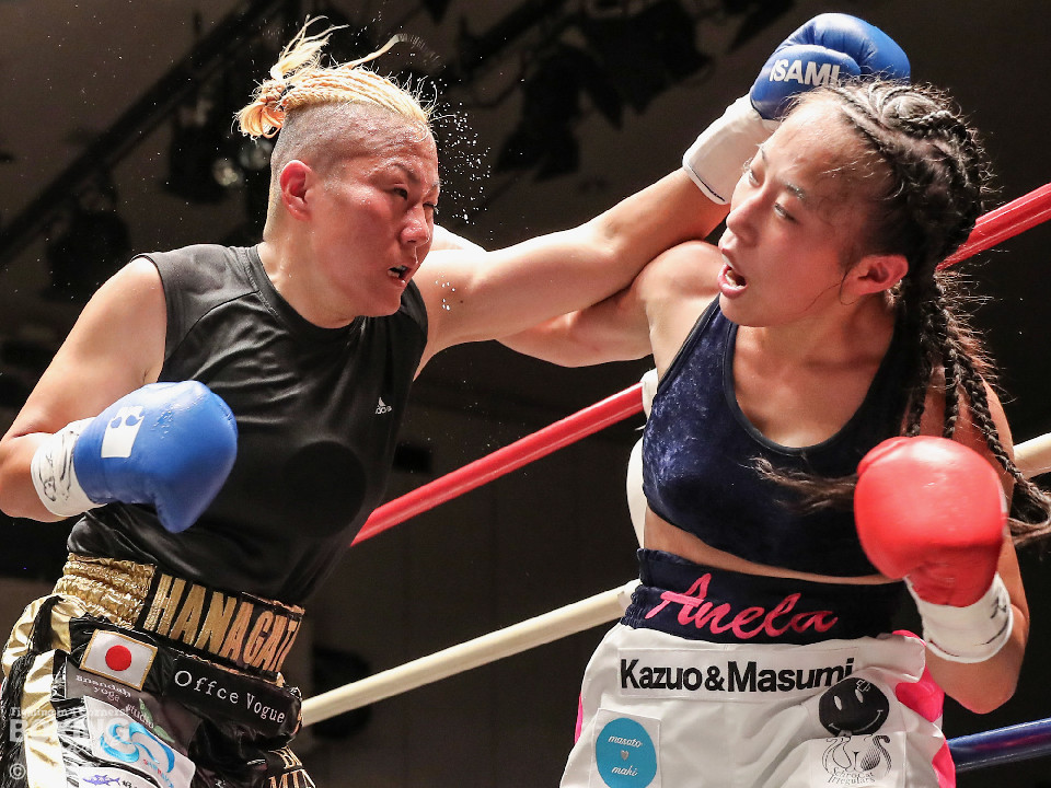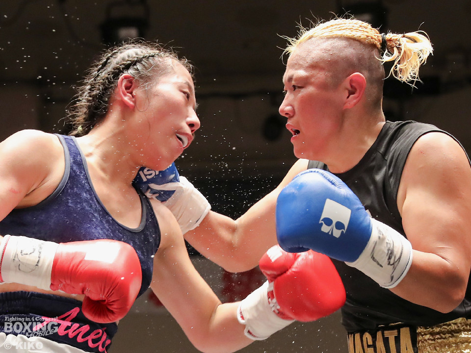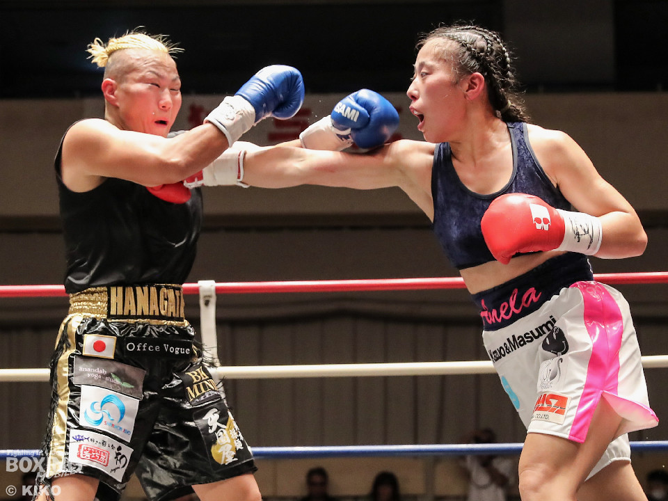試合:OPBF東洋太平洋女子フェザー級王者の大澤と日本女子同級王者の若狭による王座統一戦。開始5秒、大澤が右クロスを合わせるとバランスを崩して倒れた若狭を見てレフェリーはダウンを宣告。再開後、攻撃の手を緩めず攻めると、若狭も真っ向から応戦。初回から会場はヒートアップした。2回、大澤は右クロス、左ボディを決めるとこれに火がついた若狭は、得意分野だとばかりに応戦。火が出るような打ち合いに大歓声が沸き起こった。3回、若狭が右フックをねじ込むとグイグイと攻め立てて反撃。4回、大澤はジャブからワンツーにつなげて見栄えの良さをアピール。前半終了時の公開採点は39-36×2、40-35×1で大澤がリード。5回、大澤は左ショートアッパーを差し込むと出入りを活かしたボクシングを展開。6回、大澤は右ストレートを巧みに使いわけた。7回、パンチを交錯させる中、大澤が左ボディ、ワンツーで上回った。最終8回、ギアを上げた大澤はワンツーを軸に攻勢。右ストレートが顔面を捉えたところでレフェリーが割って入った。大澤が女子フェザー級2冠王者に輝いた。