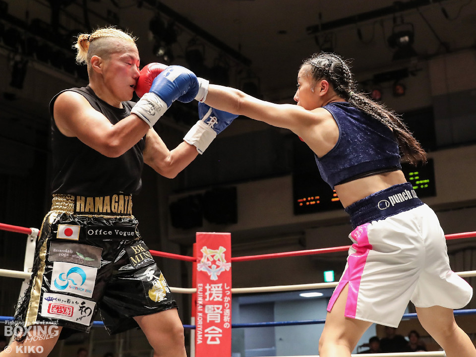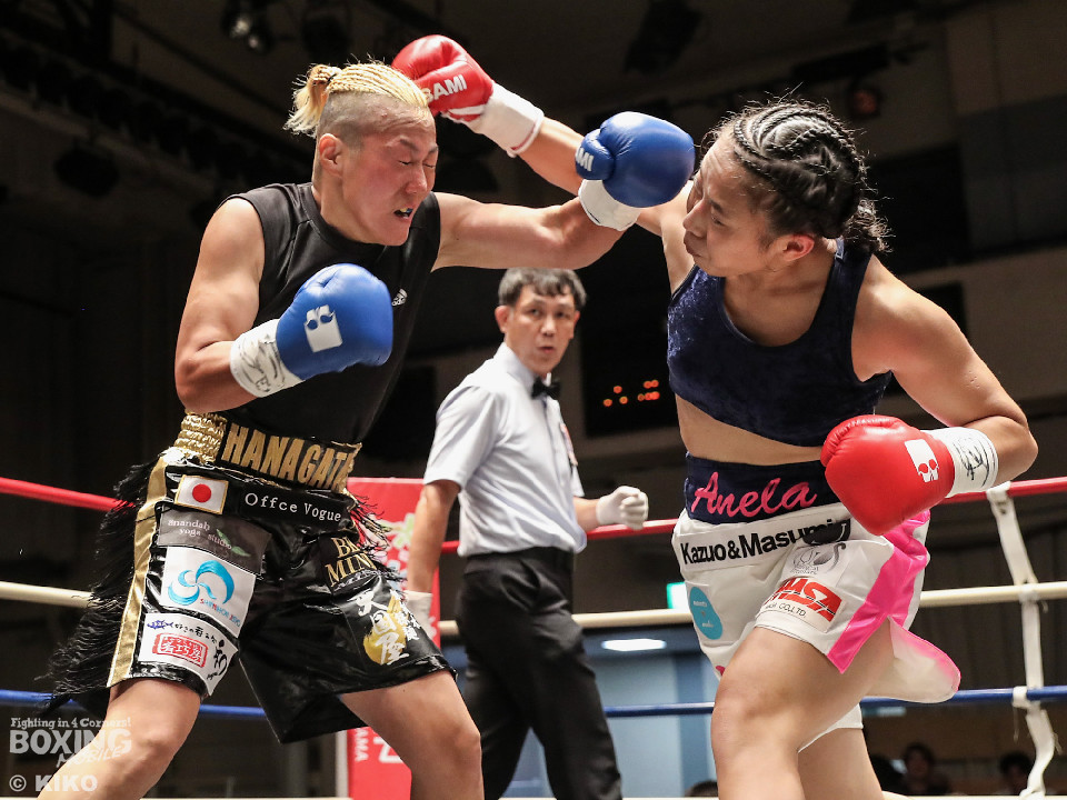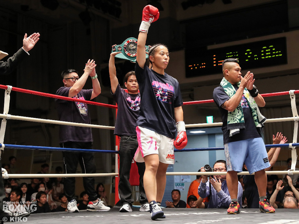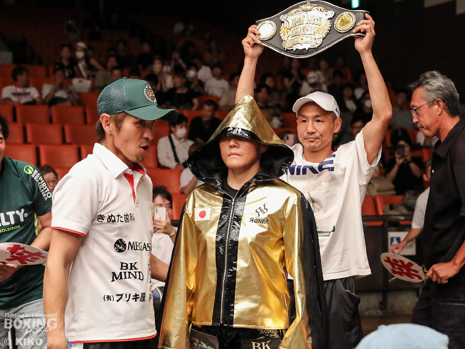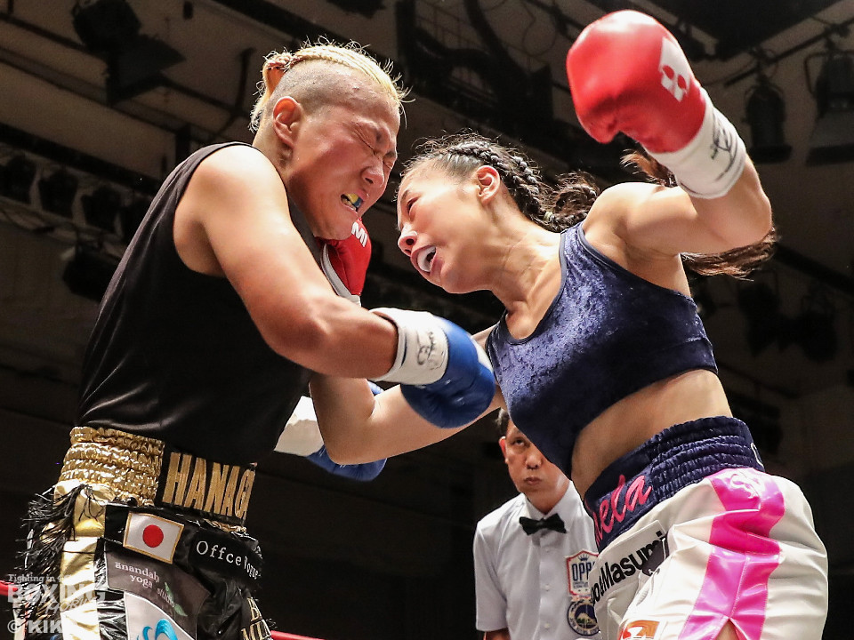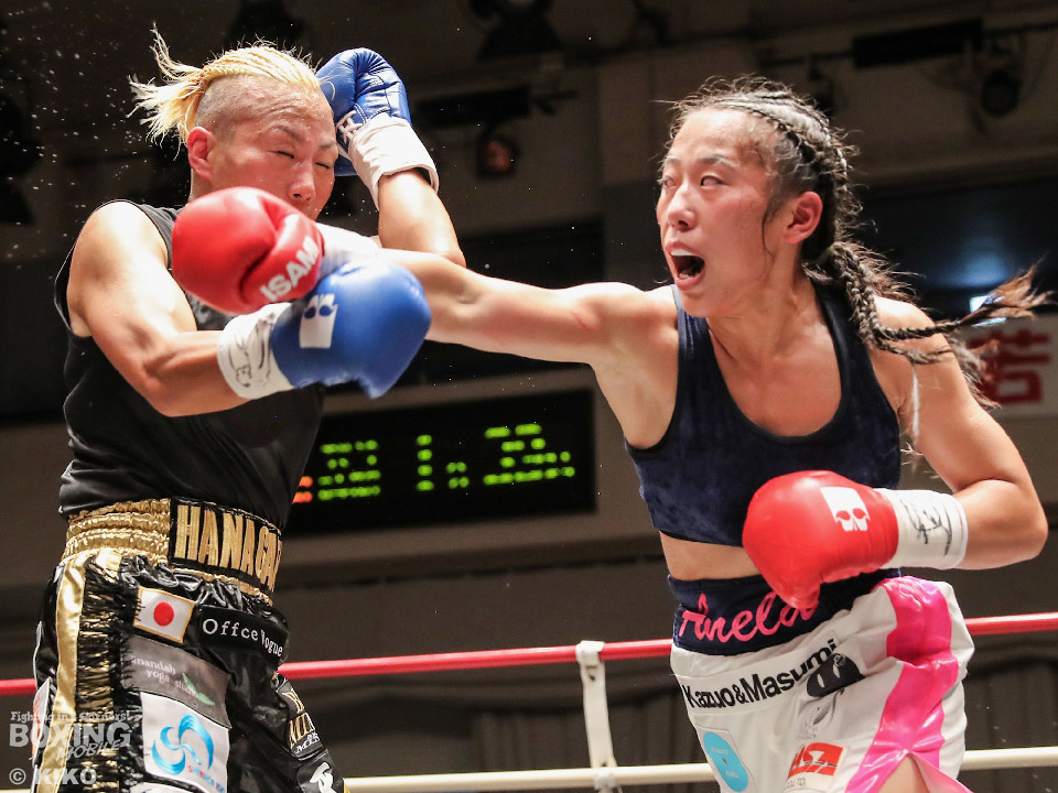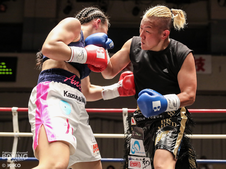 試合:OPBF東洋太平洋女子フェザー級王者の大澤と日本女子同級王者の若狭による王座統一戦。開始5秒、大澤が右クロスを合わせるとバランスを崩して倒れた若狭を見てレフェリーはダウンを宣告。再開後、攻撃の手を緩めず攻めると、若狭も真っ向から応戦。初回から会場はヒートアップした。2回、大澤は右クロス、左ボディを決めるとこれに火がついた若狭は、得意分野だとばかりに応戦。火が出るような打ち合いに大歓声が沸き起こった。3回、若狭が右フックをねじ込むとグイグイと攻め立てて反撃。4回、大澤はジャブからワンツーにつなげて見栄えの良さをアピール。前半終了時の公開採点は39-36×2、40-35×1で大澤がリード。5回、大澤は左ショートアッパーを差し込むと出入りを活かしたボクシングを展開。6回、大澤は右ストレートを巧みに使いわけた。7回、パンチを交錯させる中、大澤が左ボディ、ワンツーで上回った。最終8回、ギアを上げた大澤はワンツーを軸に攻勢。右ストレートが顔面を捉えたところでレフェリーが割って入った。大澤が女子フェザー級2冠王者に輝いた。
