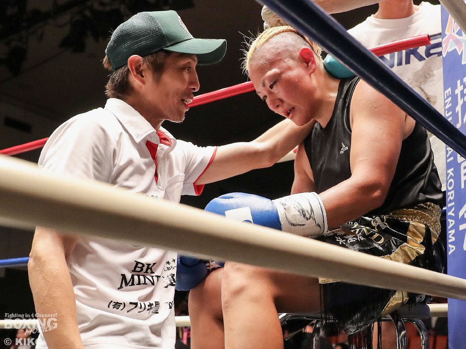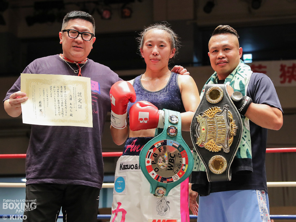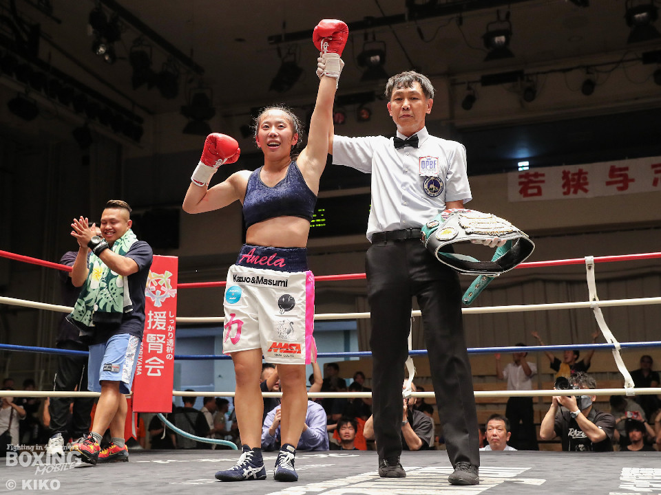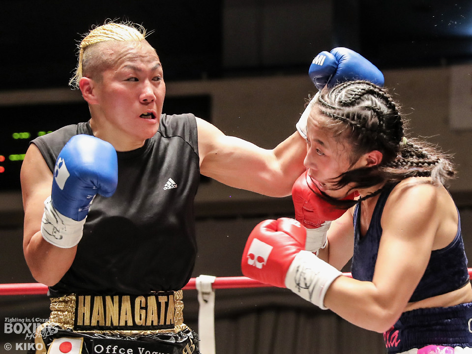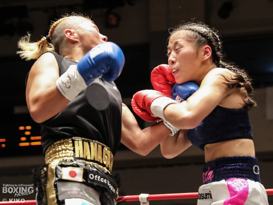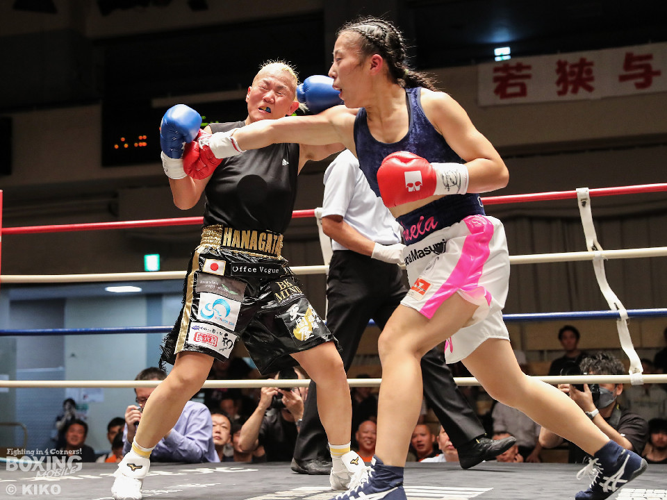 試合:OPBF東洋太平洋女子フェザー級王者の大澤と日本女子同級王者の若狭による王座統一戦。開始5秒、大澤が右クロスを合わせるとバランスを崩して倒れた若狭を見てレフェリーはダウンを宣告。再開後、攻撃の手を緩めず攻めると、若狭も真っ向から応戦。初回から会場はヒートアップした。2回、大澤は右クロス、左ボディを決めるとこれに火がついた若狭は、得意分野だとばかりに応戦。火が出るような打ち合いに大歓声が沸き起こった。3回、若狭が右フックをねじ込むとグイグイと攻め立てて反撃。4回、大澤はジャブからワンツーにつなげて見栄えの良さをアピール。前半終了時の公開採点は39-36×2、40-35×1で大澤がリード。5回、大澤は左ショートアッパーを差し込むと出入りを活かしたボクシングを展開。6回、大澤は右ストレートを巧みに使いわけた。7回、パンチを交錯させる中、大澤が左ボディ、ワンツーで上回った。最終8回、ギアを上げた大澤はワンツーを軸に攻勢。右ストレートが顔面を捉えたところでレフェリーが割って入った。大澤が女子フェザー級2冠王者に輝いた。