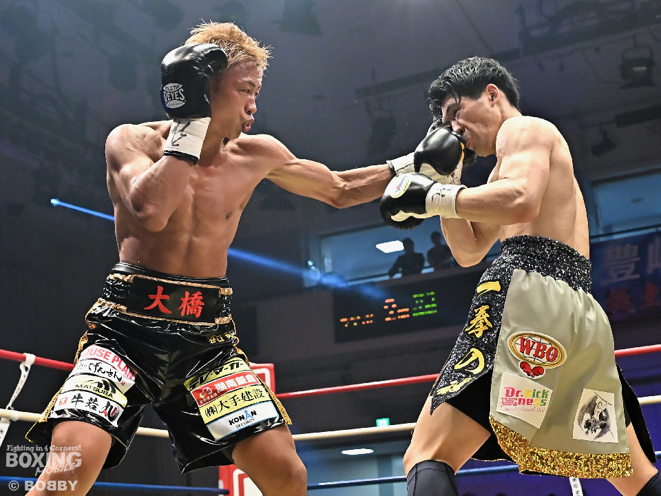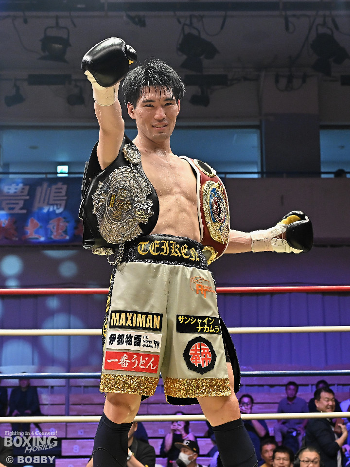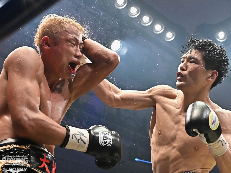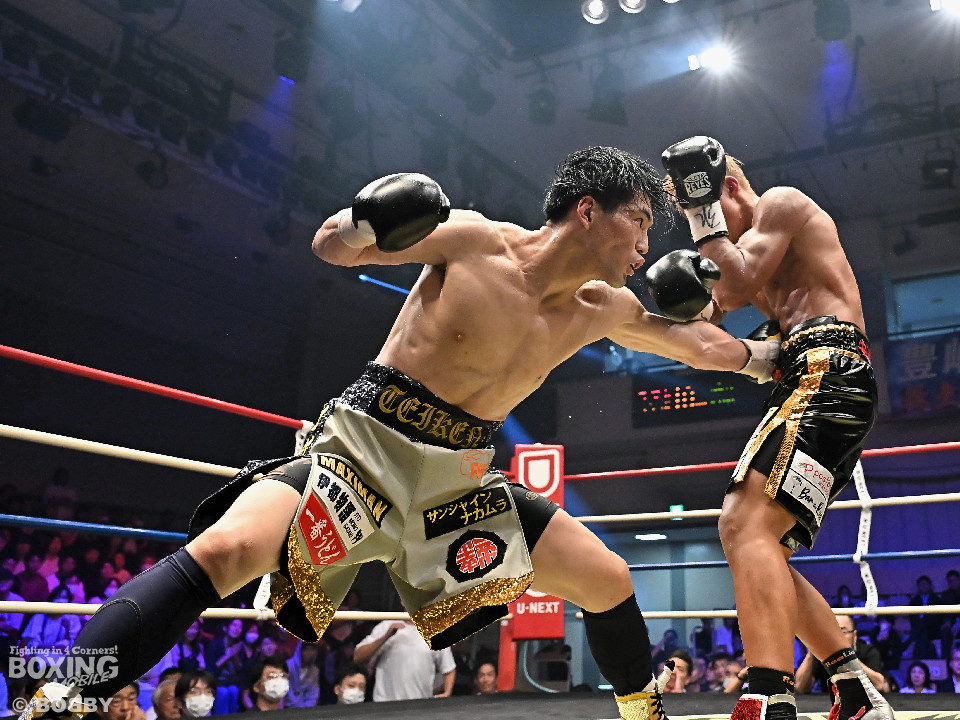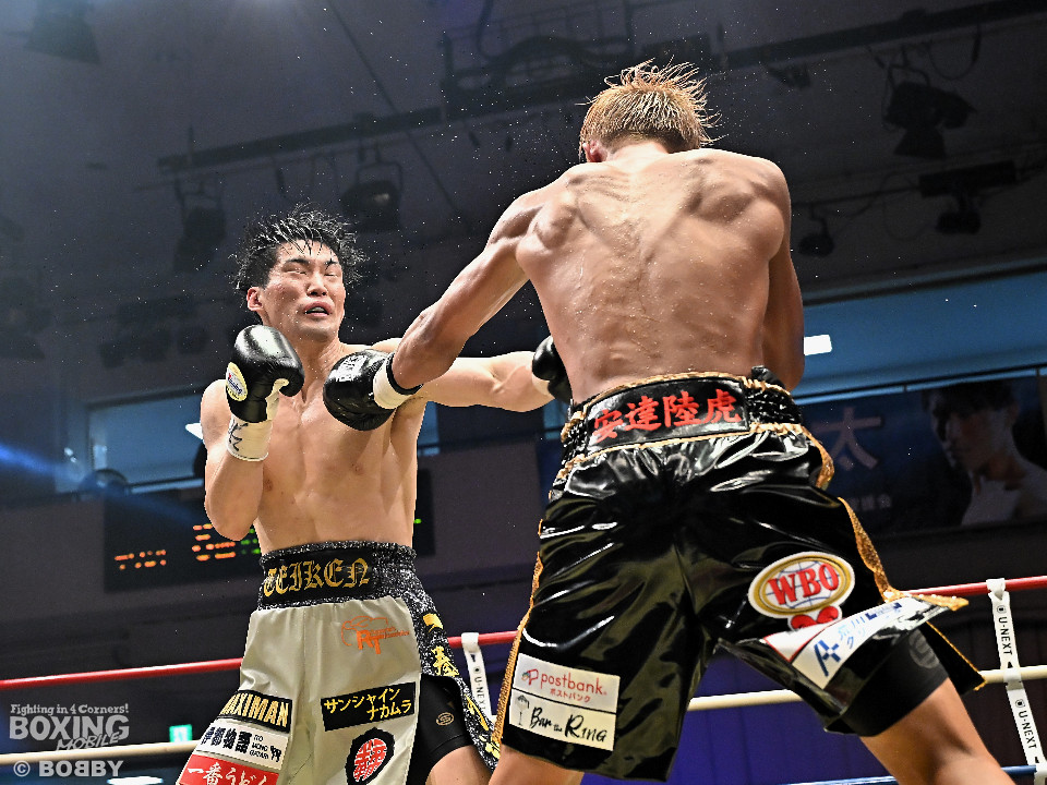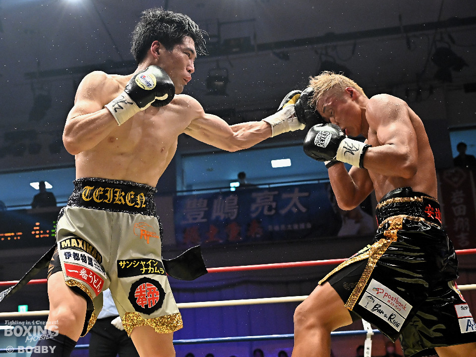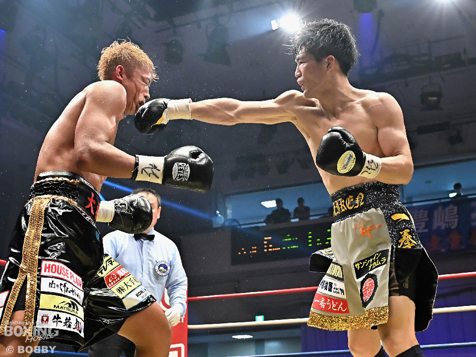 試合:日本スーパーウェルター級王者の豊嶋がタイトル防衛戦と空位のWBOアジアパシフィック王座決定戦に臨んだ。挑んだのはキャリア10年目で初のタイトルマッチの舞台に上がった安達。ジャブの差し合いからスタートした試合は、安達が相手の左右フックをブロック。お互いにアグレッシブで好勝負の予感を感じさせた。2回、豊嶋が右フックでガクッと腰を沈めさせると左右フックをブンブンと叩きつけて攻勢。3回、豊嶋はジャブからワンツーにつなげてリズム感のある攻撃を披露。4回、接近戦での体力の削り合い。安達のショートアッパーの見栄えがいい。5回、豊嶋は右アッパーで顔を弾くとパパっとまとめて攻勢。安達はグローブを叩いて鼓舞した。6回、豊嶋のショートアッパーが冴えてくる。手数を増やして突き放しにかかった。7~8回、体を密着させての消耗戦が続く。要所で豊嶋の見せ方が上回った印象。9回、安達はプレスを強めてワンツーを軸に積極的な攻撃。10回、豊嶋は右アッパーで顔を弾くと前に出る相手をジャブで押し返した。壮絶な打撃戦を繰り広げた両者に盛大な拍手が送られた。タフファイトを制した豊嶋がスーパーウェルター級2冠王者に輝いた。