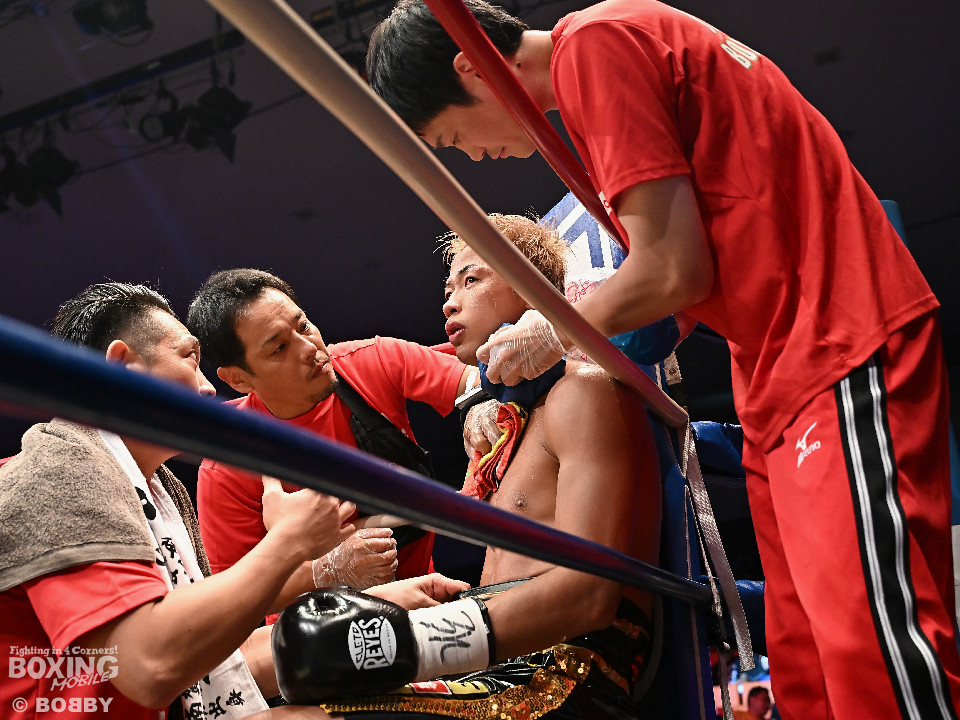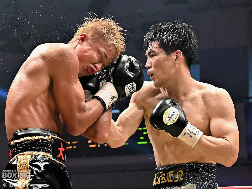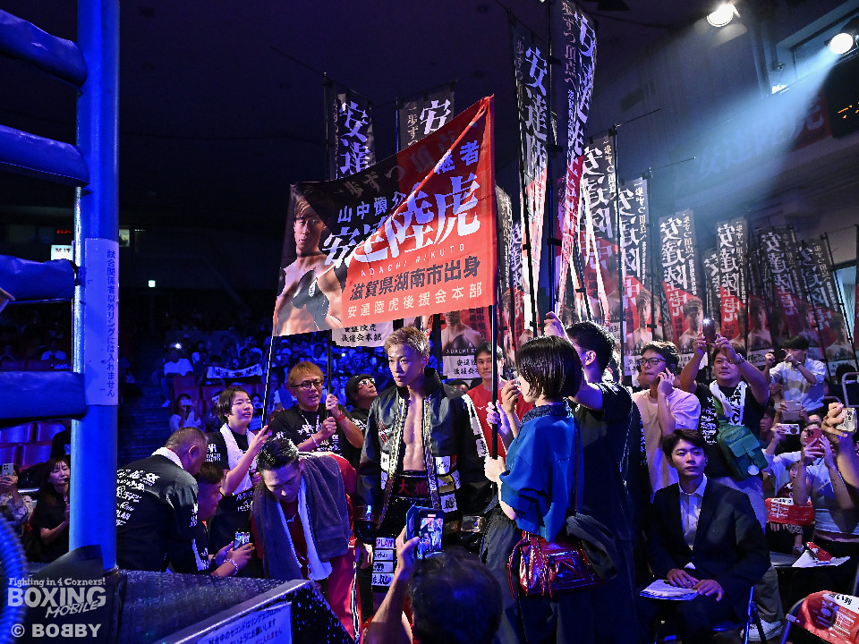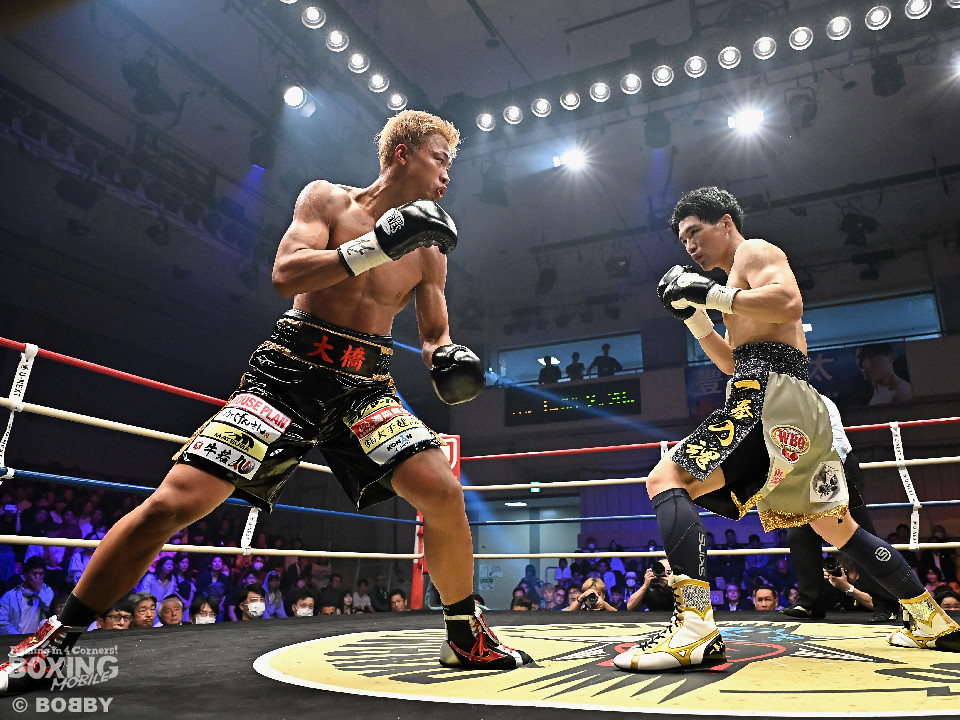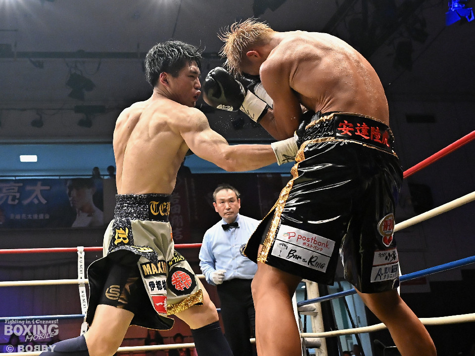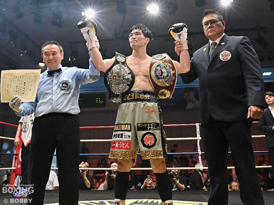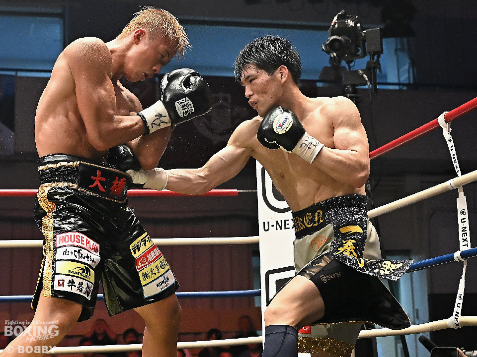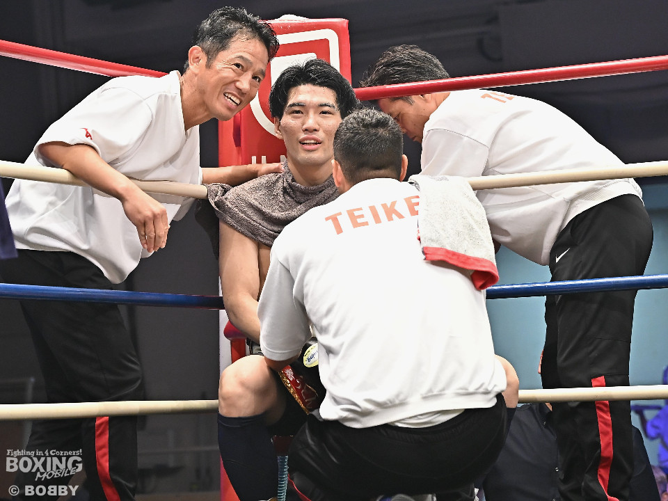 試合:日本スーパーウェルター級王者の豊嶋がタイトル防衛戦と空位のWBOアジアパシフィック王座決定戦に臨んだ。挑んだのはキャリア10年目で初のタイトルマッチの舞台に上がった安達。ジャブの差し合いからスタートした試合は、安達が相手の左右フックをブロック。お互いにアグレッシブで好勝負の予感を感じさせた。2回、豊嶋が右フックでガクッと腰を沈めさせると左右フックをブンブンと叩きつけて攻勢。3回、豊嶋はジャブからワンツーにつなげてリズム感のある攻撃を披露。4回、接近戦での体力の削り合い。安達のショートアッパーの見栄えがいい。5回、豊嶋は右アッパーで顔を弾くとパパっとまとめて攻勢。安達はグローブを叩いて鼓舞した。6回、豊嶋のショートアッパーが冴えてくる。手数を増やして突き放しにかかった。7~8回、体を密着させての消耗戦が続く。要所で豊嶋の見せ方が上回った印象。9回、安達はプレスを強めてワンツーを軸に積極的な攻撃。10回、豊嶋は右アッパーで顔を弾くと前に出る相手をジャブで押し返した。壮絶な打撃戦を繰り広げた両者に盛大な拍手が送られた。タフファイトを制した豊嶋がスーパーウェルター級2冠王者に輝いた。