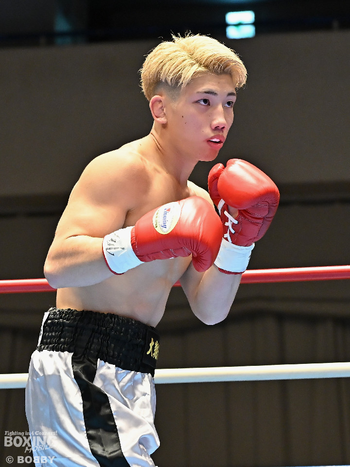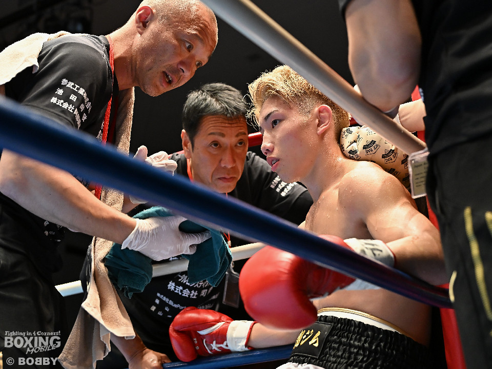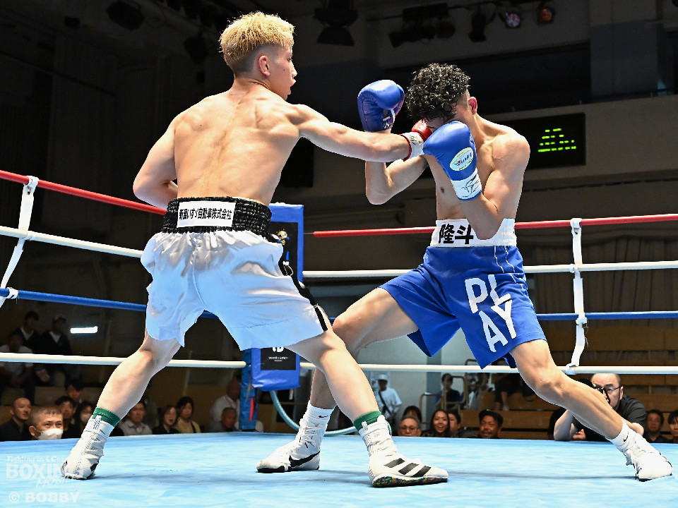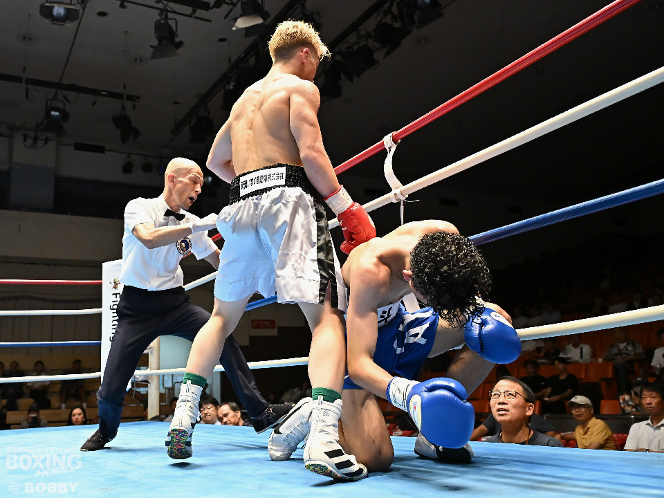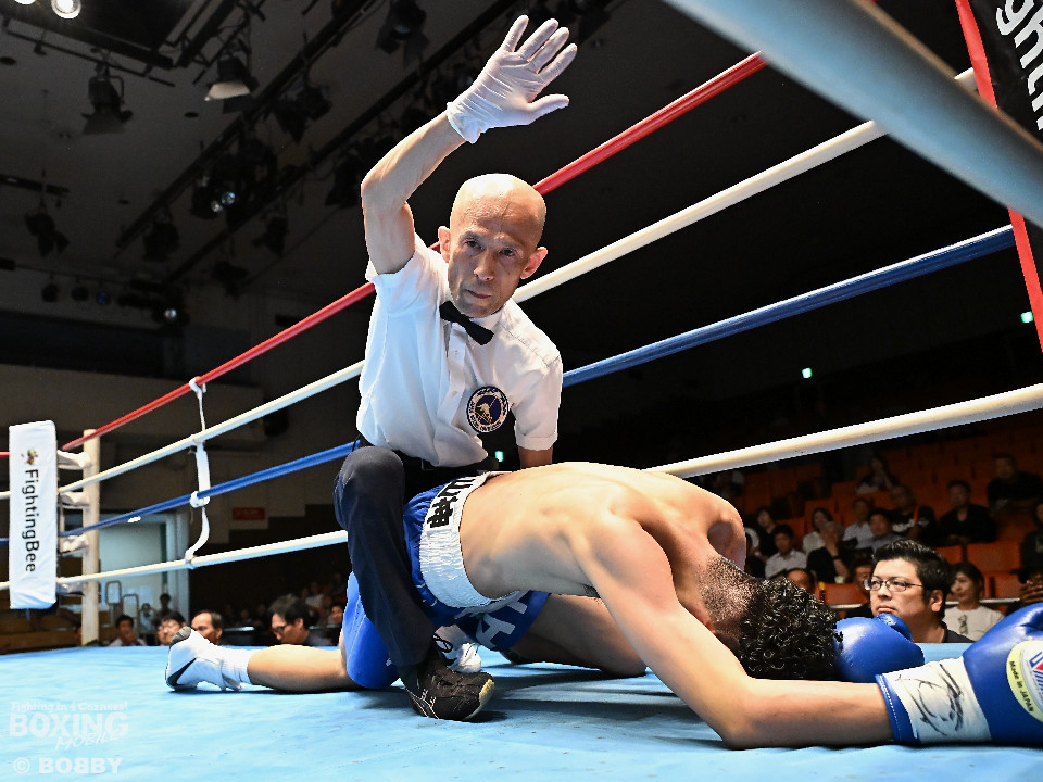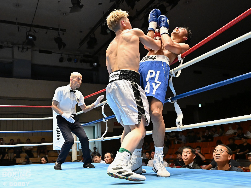 試合:サウスポー鈴木が前後の動きを意識しながらタイミングを探ると単発の左ストレートをヒット。2回、鈴木がジャブでリズムを作りペースを維持。ガードを固めながら右ストレートを狙う中村だが、距離が遠く感じるのか決定打を打ち込めず。3回、鈴木は右フックで顔を弾くと左右フックを強振。サウスポーにスイッチした中村だが、突破口を開けず。4回、鈴木は右フックでグラつかせると、距離を詰めて左右フックでダウンを演出。レフェリーがすぐに止めた。