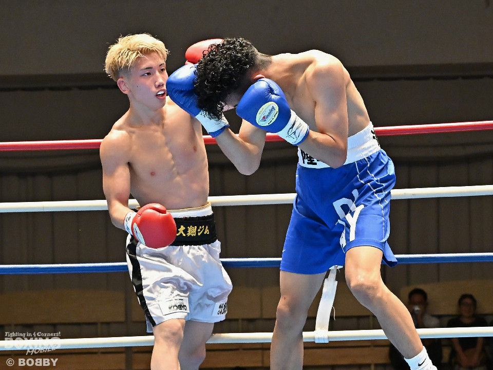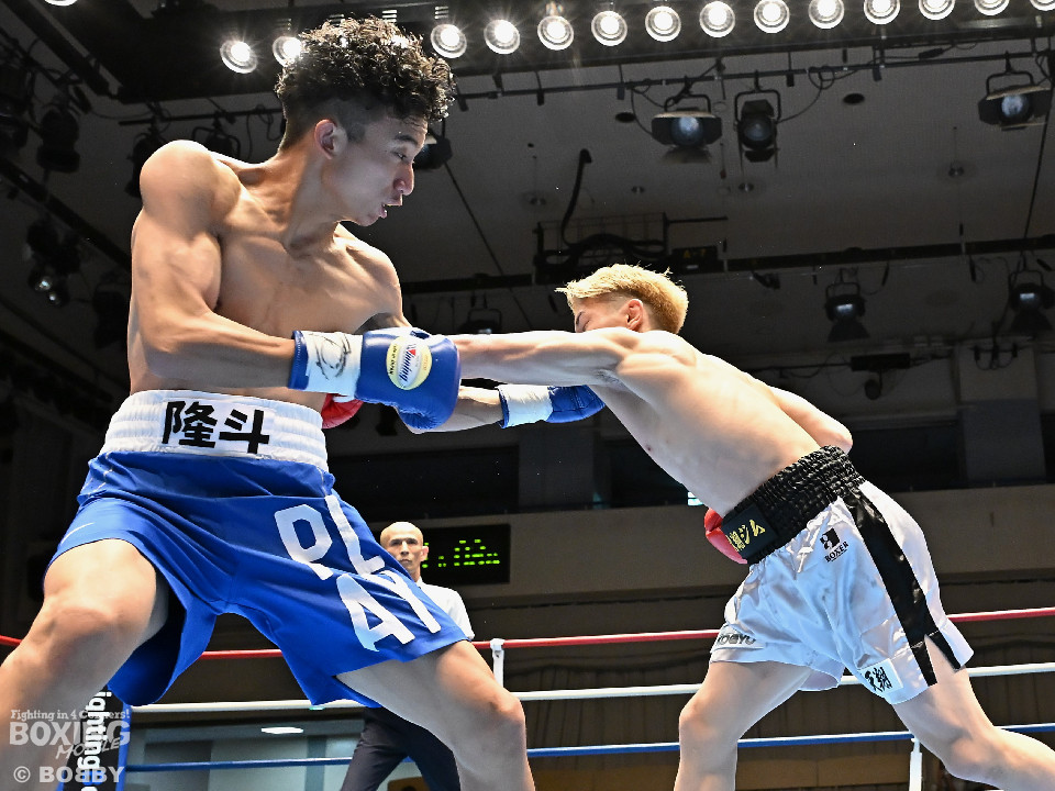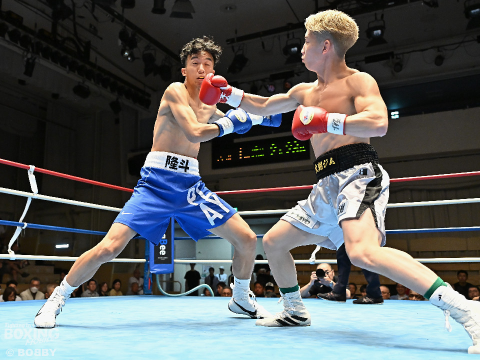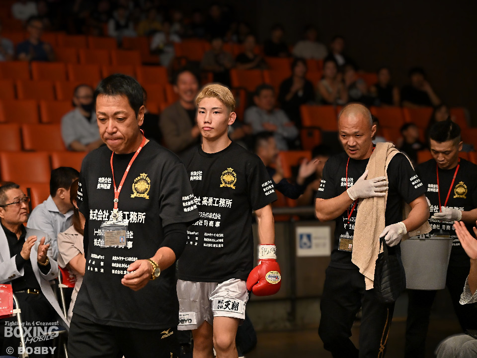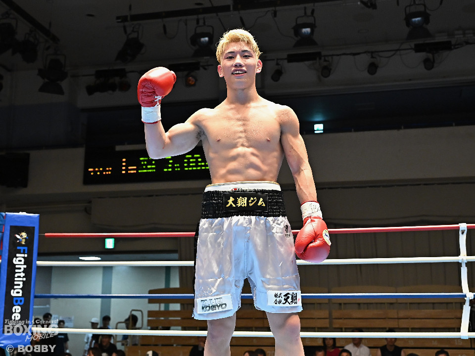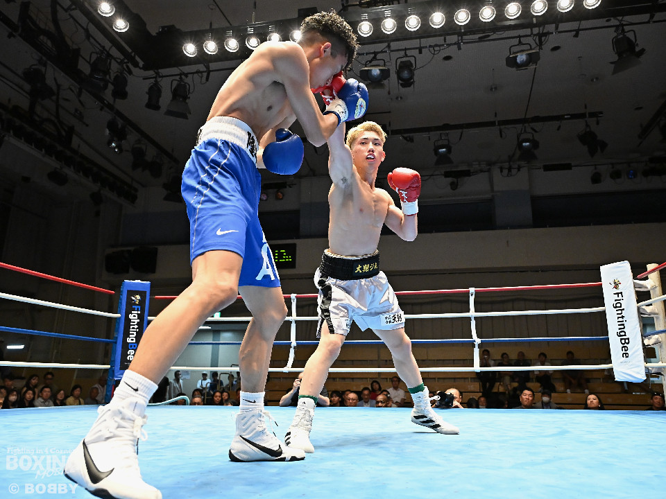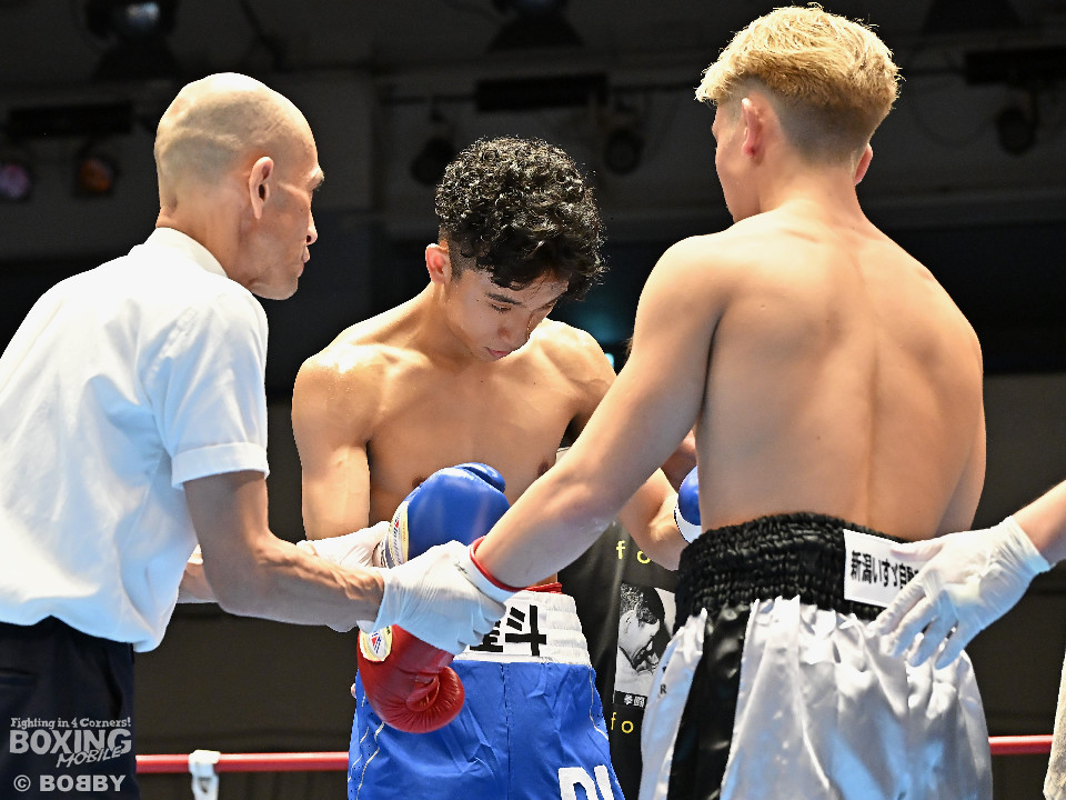試合:サウスポー鈴木が前後の動きを意識しながらタイミングを探ると単発の左ストレートをヒット。2回、鈴木がジャブでリズムを作りペースを維持。ガードを固めながら右ストレートを狙う中村だが、距離が遠く感じるのか決定打を打ち込めず。3回、鈴木は右フックで顔を弾くと左右フックを強振。サウスポーにスイッチした中村だが、突破口を開けず。4回、鈴木は右フックでグラつかせると、距離を詰めて左右フックでダウンを演出。レフェリーがすぐに止めた。