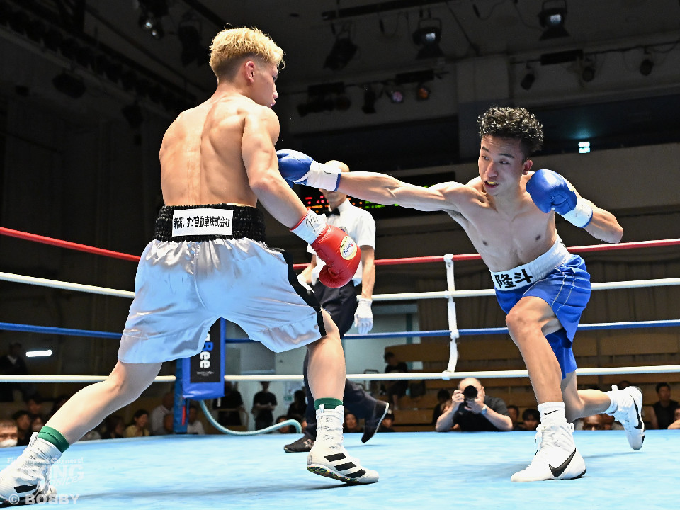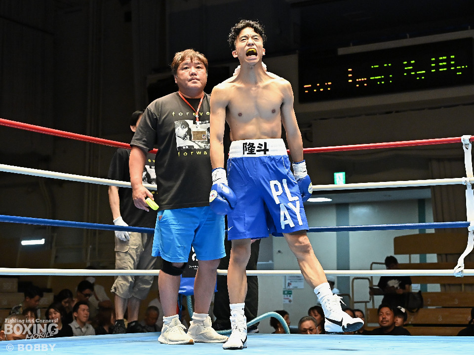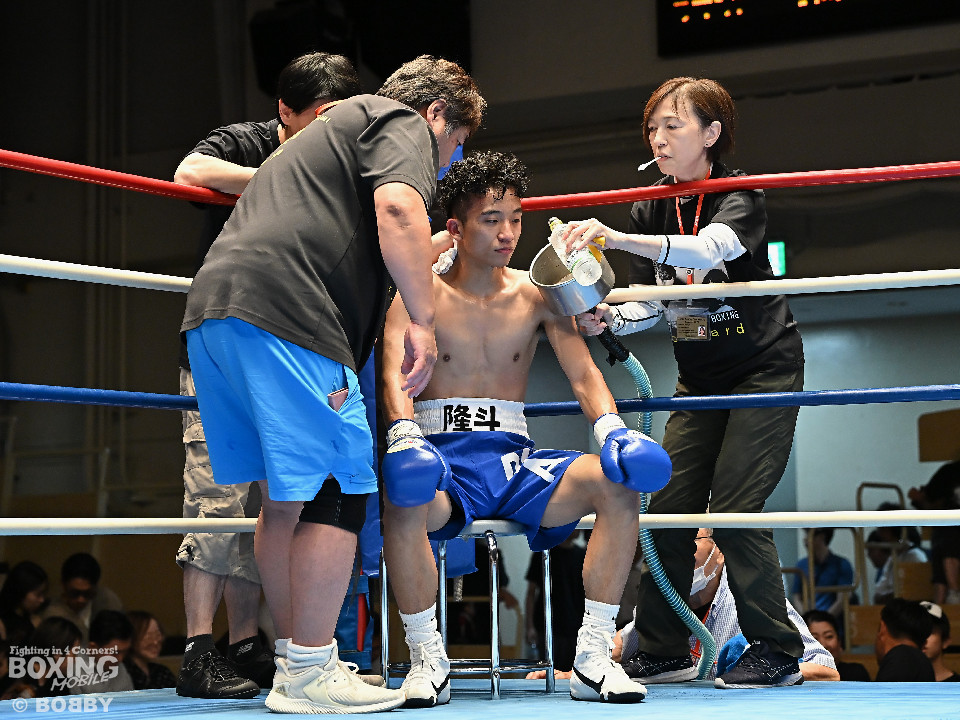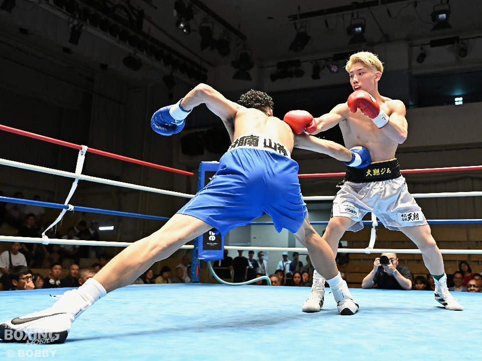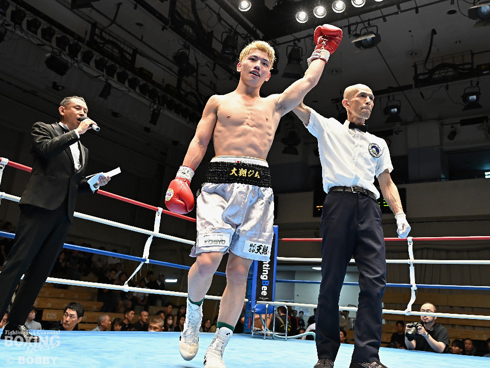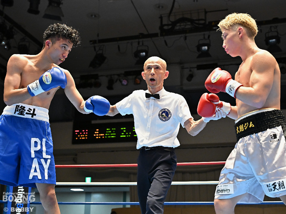 試合:サウスポー鈴木が前後の動きを意識しながらタイミングを探ると単発の左ストレートをヒット。2回、鈴木がジャブでリズムを作りペースを維持。ガードを固めながら右ストレートを狙う中村だが、距離が遠く感じるのか決定打を打ち込めず。3回、鈴木は右フックで顔を弾くと左右フックを強振。サウスポーにスイッチした中村だが、突破口を開けず。4回、鈴木は右フックでグラつかせると、距離を詰めて左右フックでダウンを演出。レフェリーがすぐに止めた。