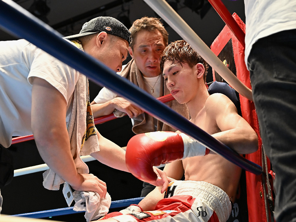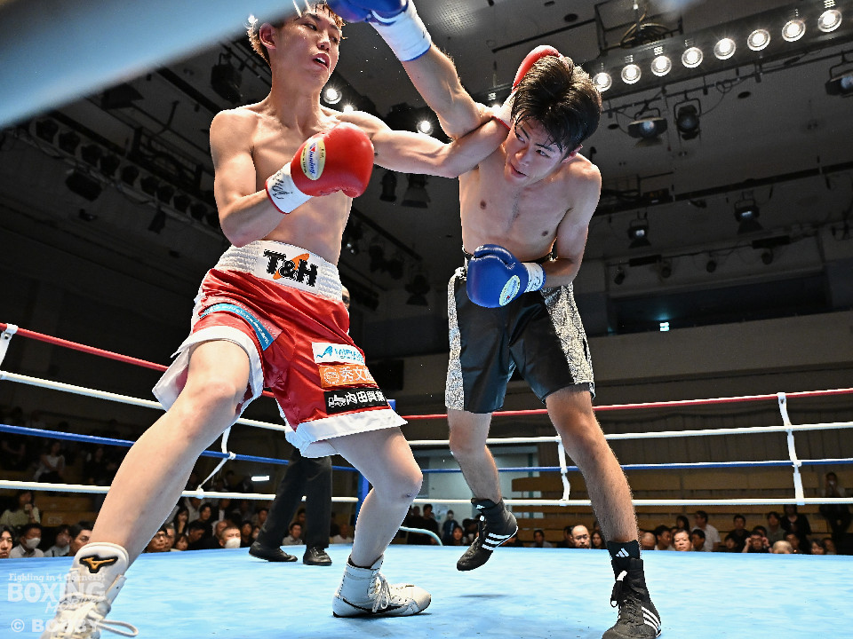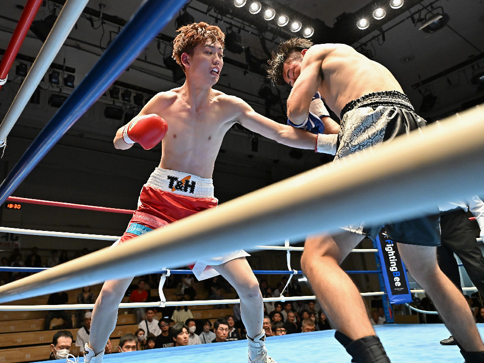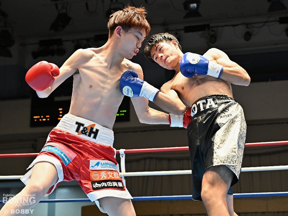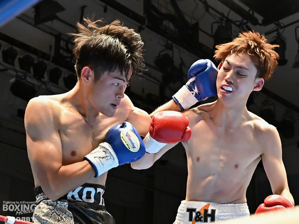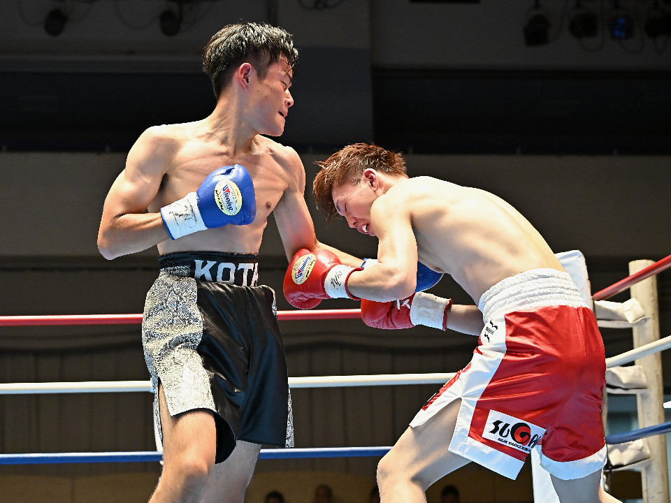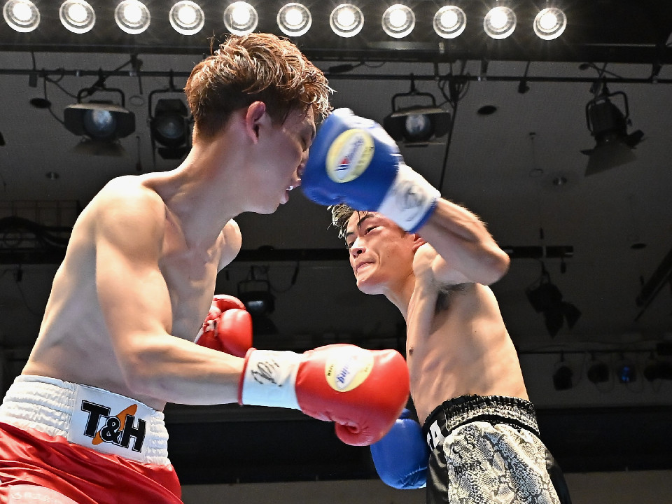 試合:今治が独特のリズムで右ストレートから切り込むが、永瀬は右ストレートを合わせると、ワンツーを再三決めてペースを掌握。2回、今治は前進しながら左フックで膝を揺らすと得意の乱打戦に持ち込む。距離を取りワンツーを返した永瀬だが、相手のしつこさに手を焼いた。3回、今治は豊富な手数で押し込みアグレッシブな姿勢。永瀬は要所でワンツーをヒット。4回、永瀬は右ボディストレートを差し込むが、勢いを止めるまでには至らず。今治は最後まで馬力を活かして攻め立てた。ジャッジ2者の支持を得た今治がB級昇格を決めた。