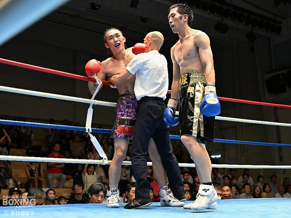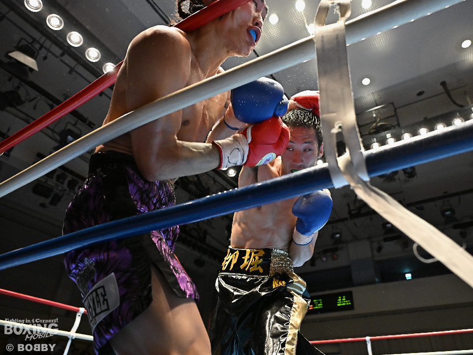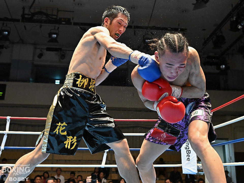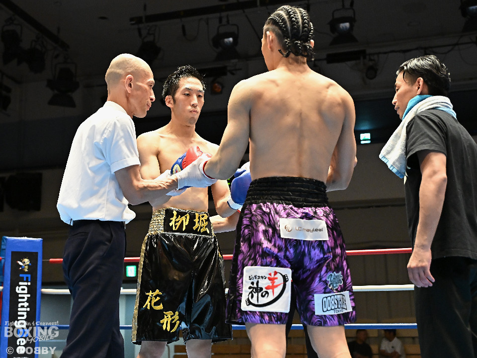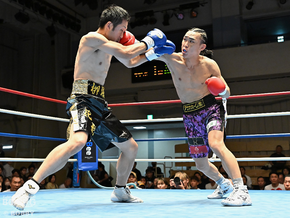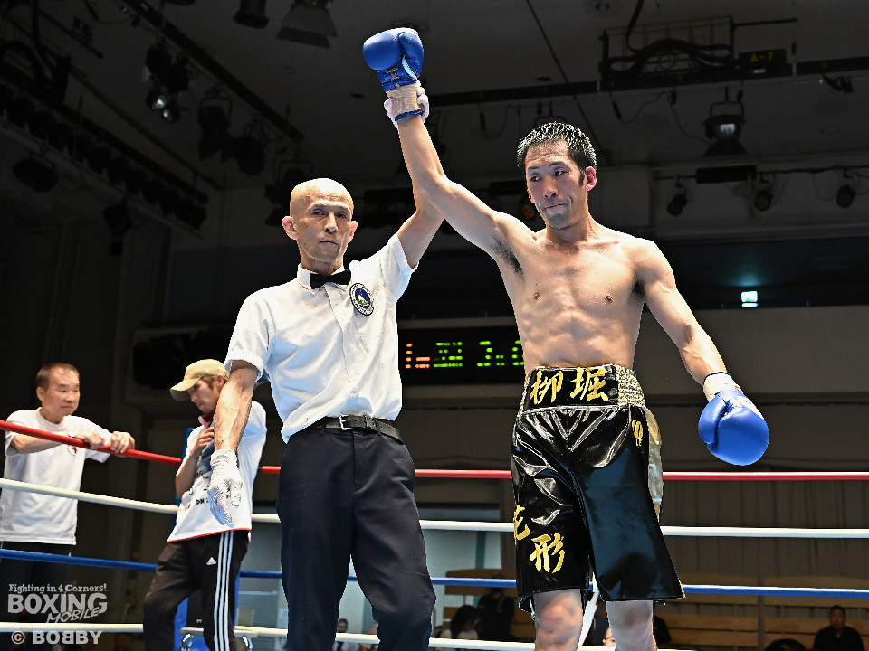 試合:大場が右フックから切り込むと左右フックで先制攻撃。2回、栁堀は左ボディを突き刺すとワンツーを好打。大場はレスリング行為の反則により減点1が課せられた。3回、栁堀は左ボディで動きを止めると、これでもかとボディにパンチを集めて体力を削った。4回、栁堀はワンツーで左目尻を切り裂くとロープに詰めて連打で仕留めにいく。守勢を強いられた大場だが、右フックを合わせて逆転を狙った。5回も栁堀のラウンド。ワンツー左ボディでロープに押し込み攻勢を強めた。6回、栁堀はロープに詰めてスパート!粘る大場を振り切ると左フックで顔を弾いたところでレフェリーが割って入った。栁堀が3連敗を脱出した。