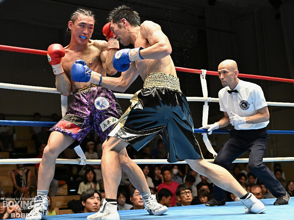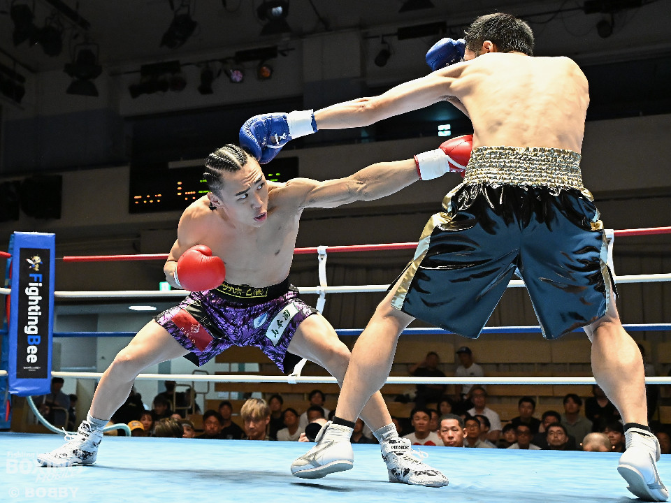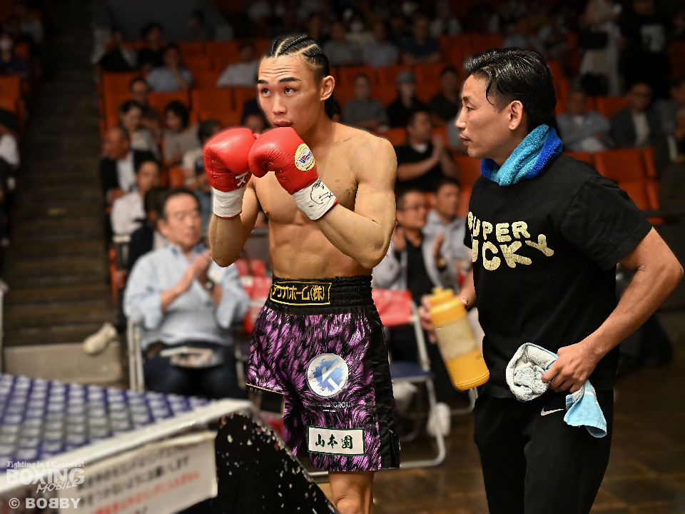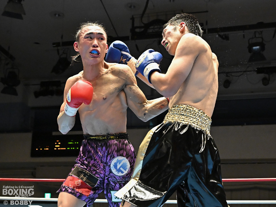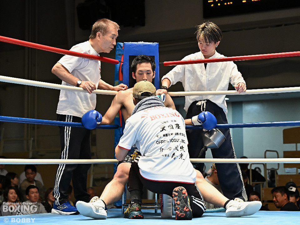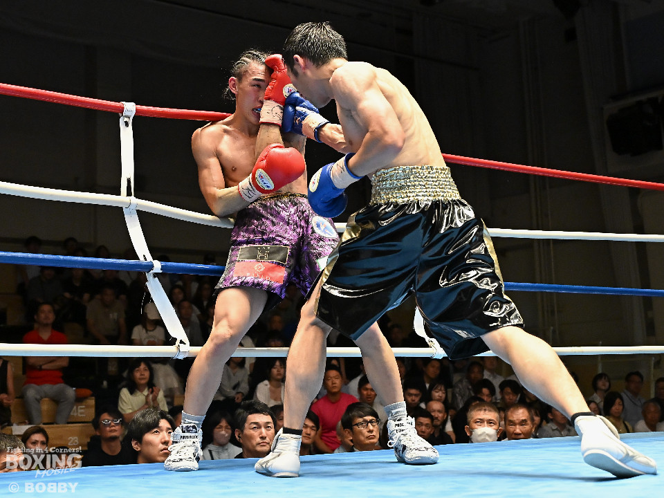 試合:大場が右フックから切り込むと左右フックで先制攻撃。2回、栁堀は左ボディを突き刺すとワンツーを好打。大場はレスリング行為の反則により減点1が課せられた。3回、栁堀は左ボディで動きを止めると、これでもかとボディにパンチを集めて体力を削った。4回、栁堀はワンツーで左目尻を切り裂くとロープに詰めて連打で仕留めにいく。守勢を強いられた大場だが、右フックを合わせて逆転を狙った。5回も栁堀のラウンド。ワンツー左ボディでロープに押し込み攻勢を強めた。6回、栁堀はロープに詰めてスパート!粘る大場を振り切ると左フックで顔を弾いたところでレフェリーが割って入った。栁堀が3連敗を脱出した。