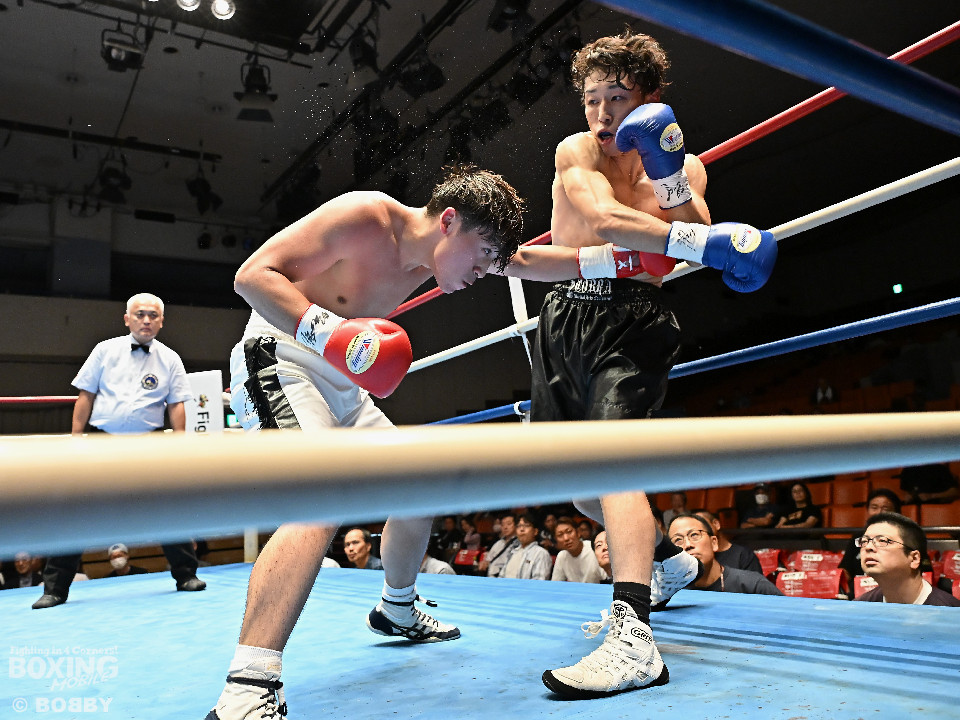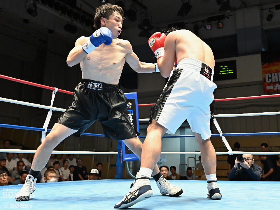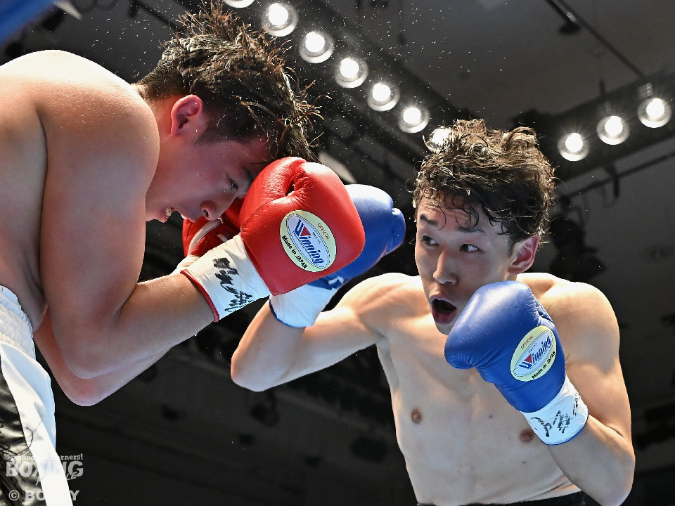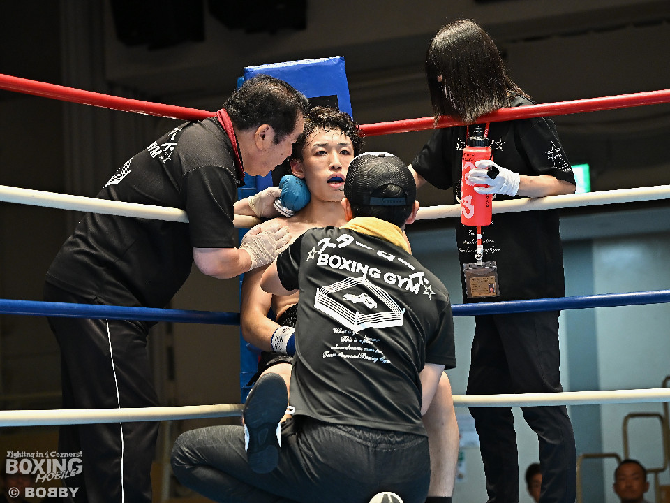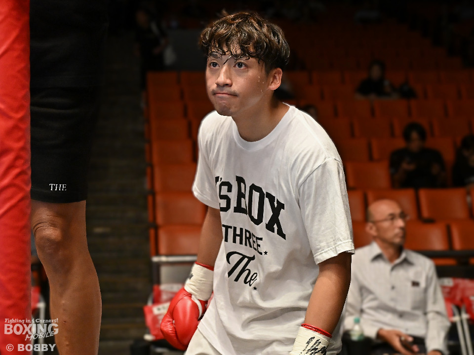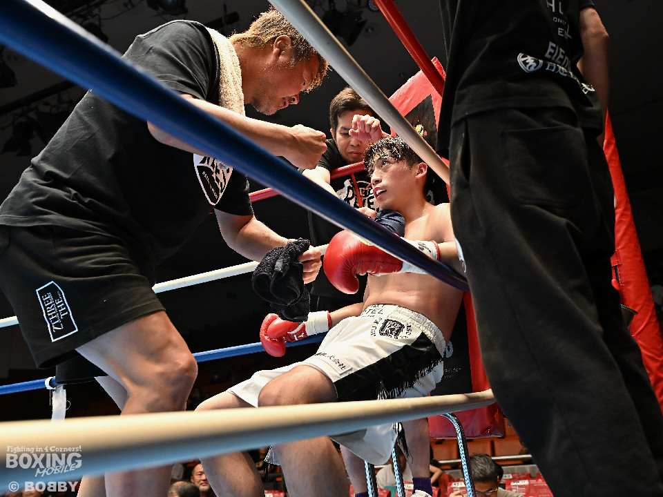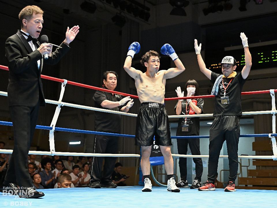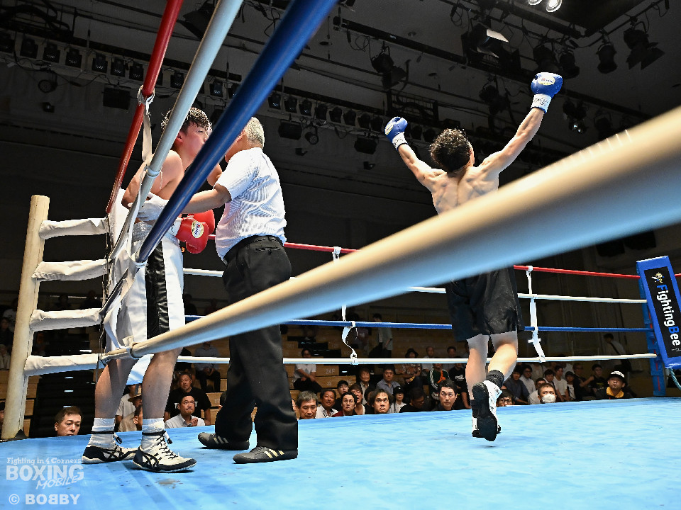 試合:お互いに警戒心が強くなかなか手が出ない中、中野が右フックをねじ込み先に仕掛けると左右フックで先制攻撃。2回、サウスポー篠田がステップインから左ボディストレートを決めて反撃。3回、中野は距離を潰してボディにパンチを集めて攻勢。コーナーに詰めてグイグイと攻めると防戦一方になった篠田を見てレフェリーが割って入った。