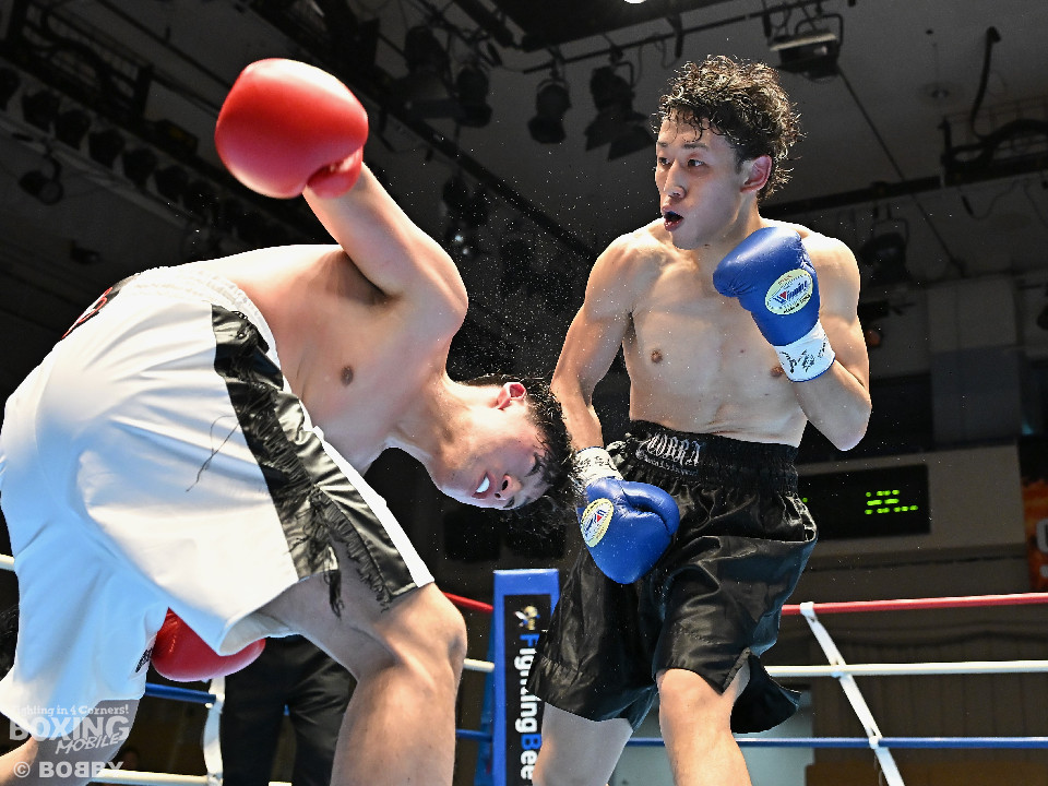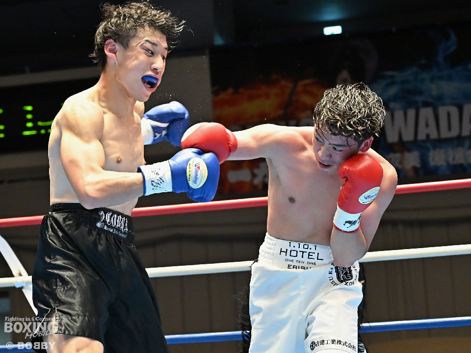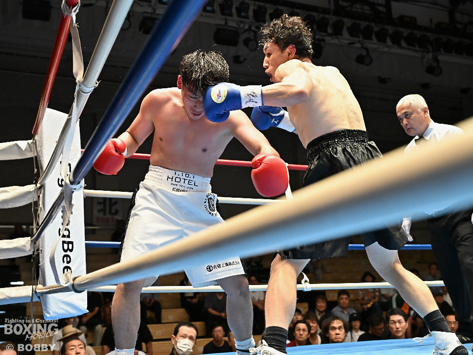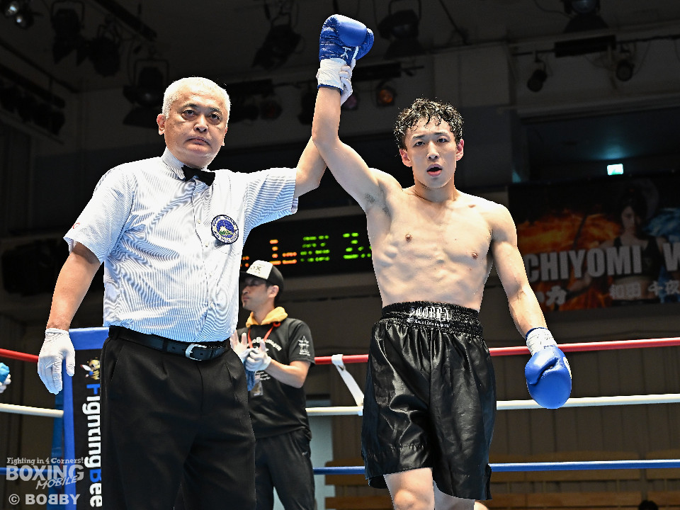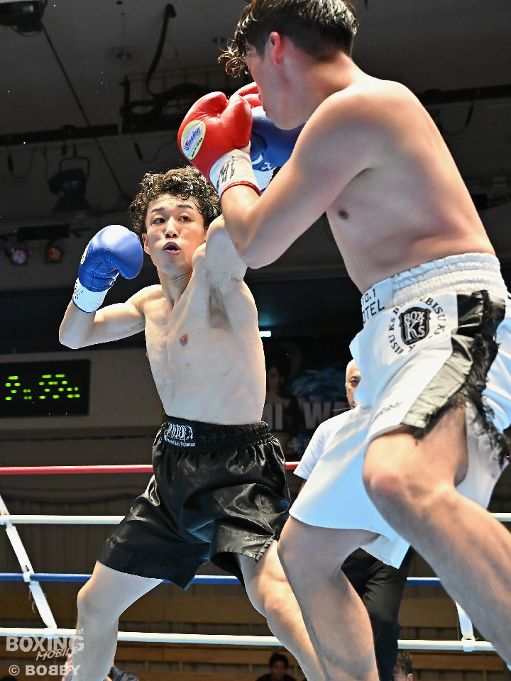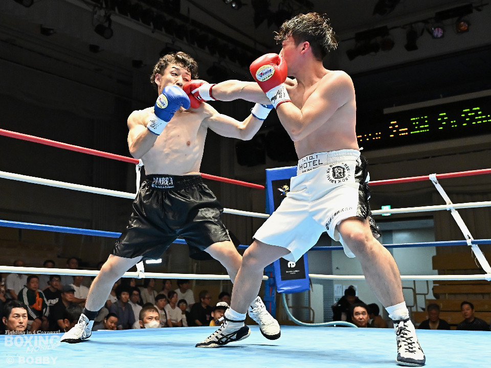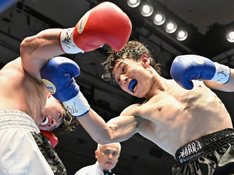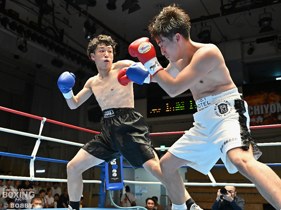 試合:お互いに警戒心が強くなかなか手が出ない中、中野が右フックをねじ込み先に仕掛けると左右フックで先制攻撃。2回、サウスポー篠田がステップインから左ボディストレートを決めて反撃。3回、中野は距離を潰してボディにパンチを集めて攻勢。コーナーに詰めてグイグイと攻めると防戦一方になった篠田を見てレフェリーが割って入った。