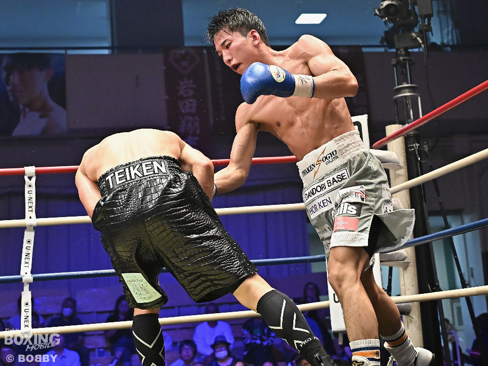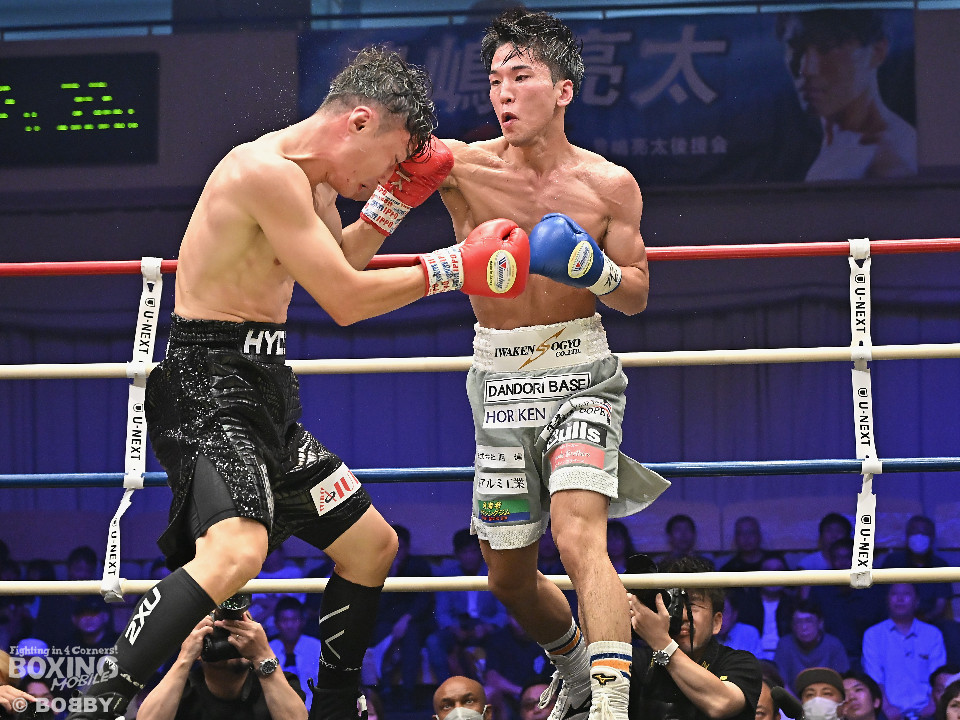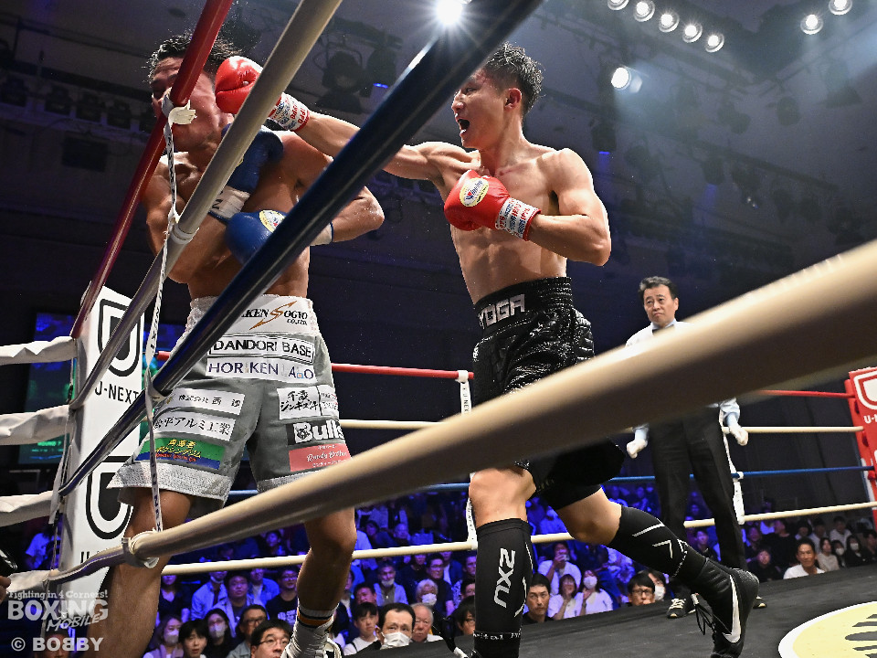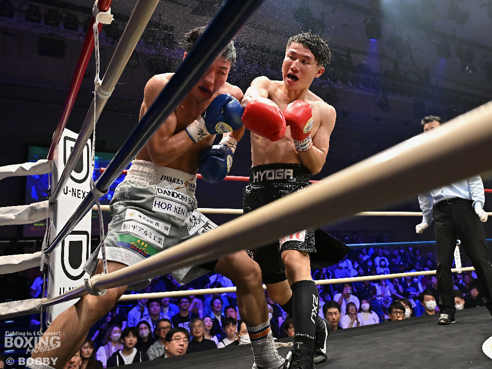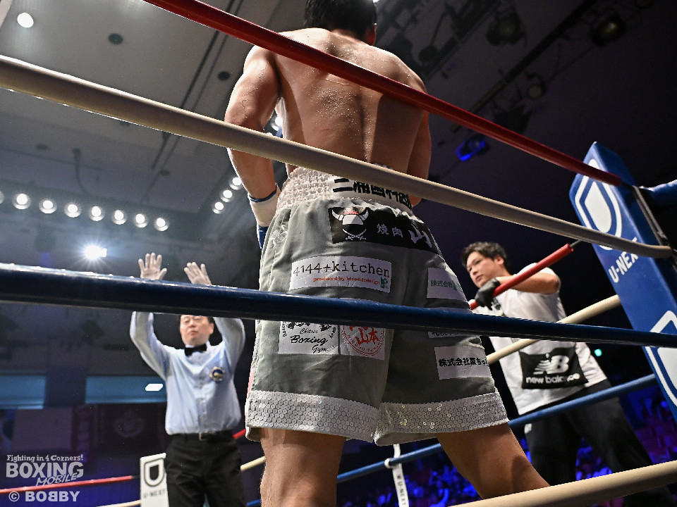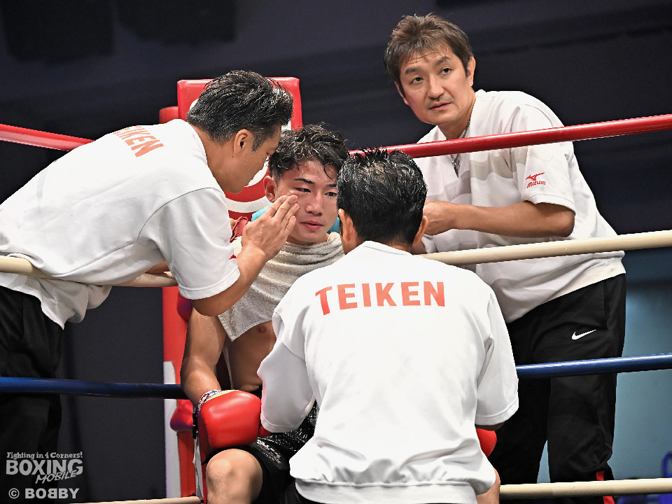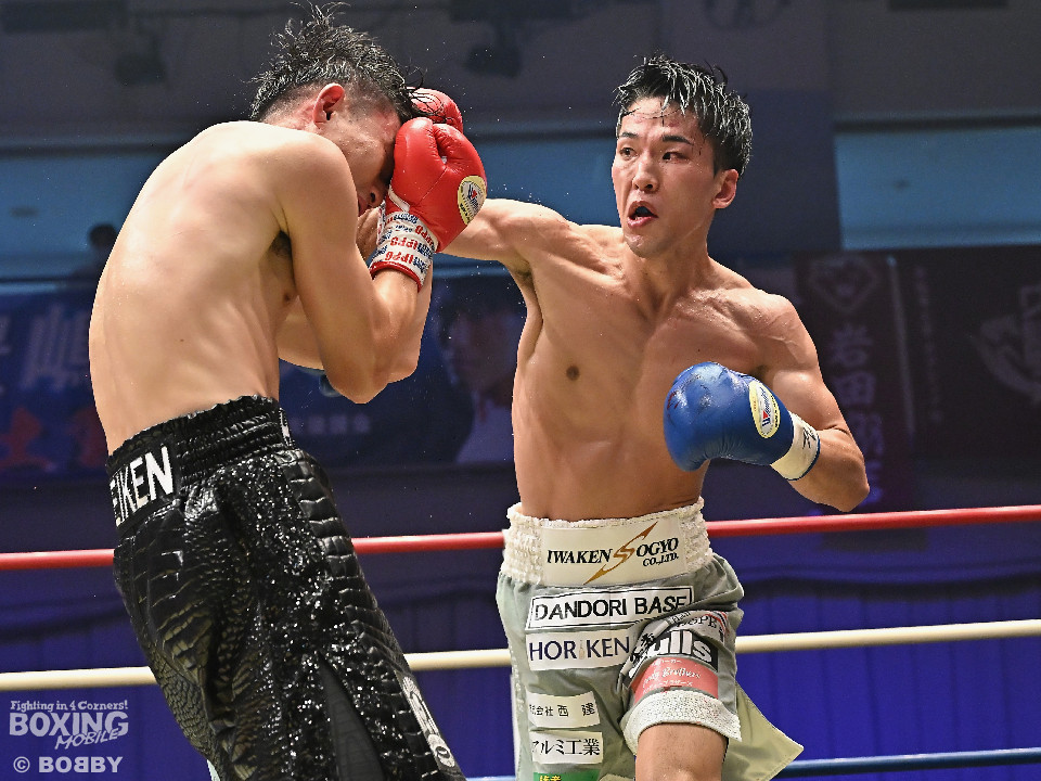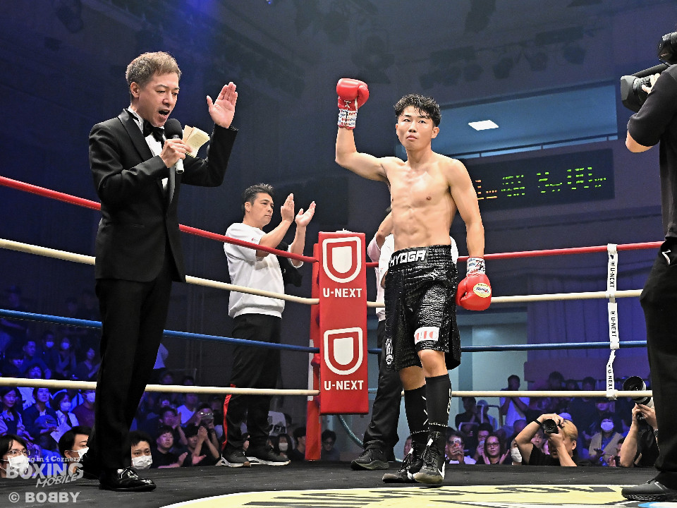 試合:榊野がワンツーで腰を沈めさせるとポジションを意識しながらリズムを構築。2回、宮田はトントンとステップを刻みながらジャブをヒット。3回、榊野はジャブから組み立てるとワンツーを好打。激しいペース争いが続いた。4回、宮田はプレスをかけて右フックをねじ込むとアグレッシブな姿勢。続く回も宮田はガードを固めながら前に出てワンツーをヒット。榊野は後手に回った印象。6回、榊野はヒッティングで左目上をカット。7回、宮田はワンツーで顔を弾くとロープに詰めて攻勢。榊野陣営が棄権を申し出た。宮田が日本ランカーを撃破した。