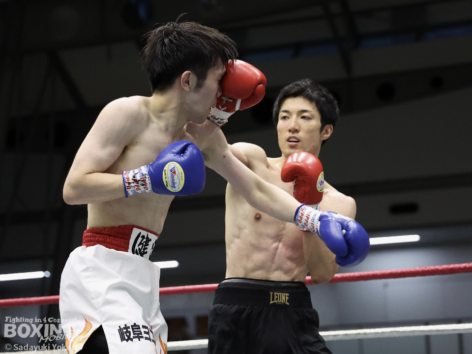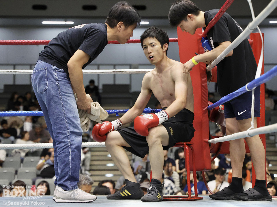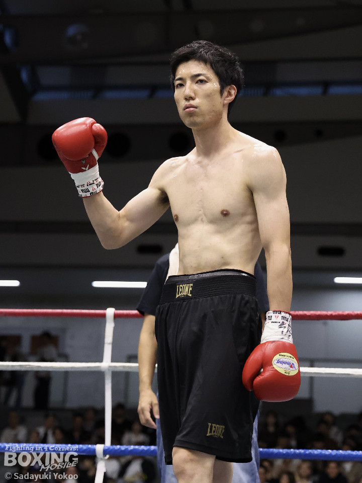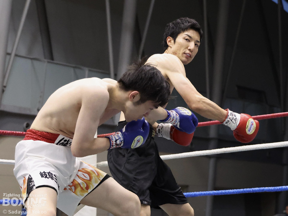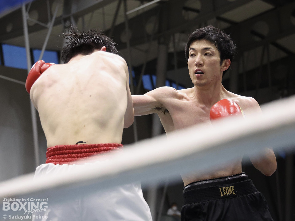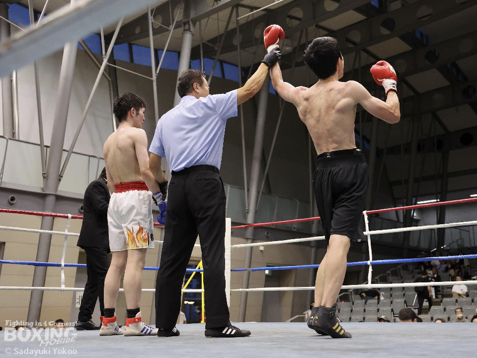 試合:サウスポー三上がロングレンジから上下のパンチを放ち、対する篠田は、ガードを固め左右のフックで対抗。2回、三上が打ち終わりを狙い左ストレートでポイントを重ね、この回の優勢をアピール。3回、篠田がプレスを強め上下を攻め、三上はカウンターで対抗するが、疲労が見え始める。最終4回、篠田が気持ちを前面に攻め続け、左右の強打を放つ、対する三上は、打ち終わりを狙いストレートで応戦、身体を預け合っての打ち合いに。勝敗はジャッジに委ねられ、的確なパンチでポイントを重ね続けた三上が、判定で初勝利を収めた。