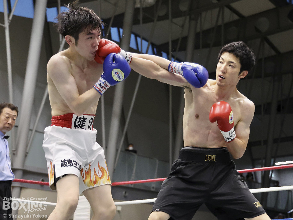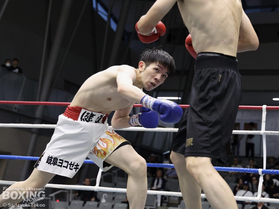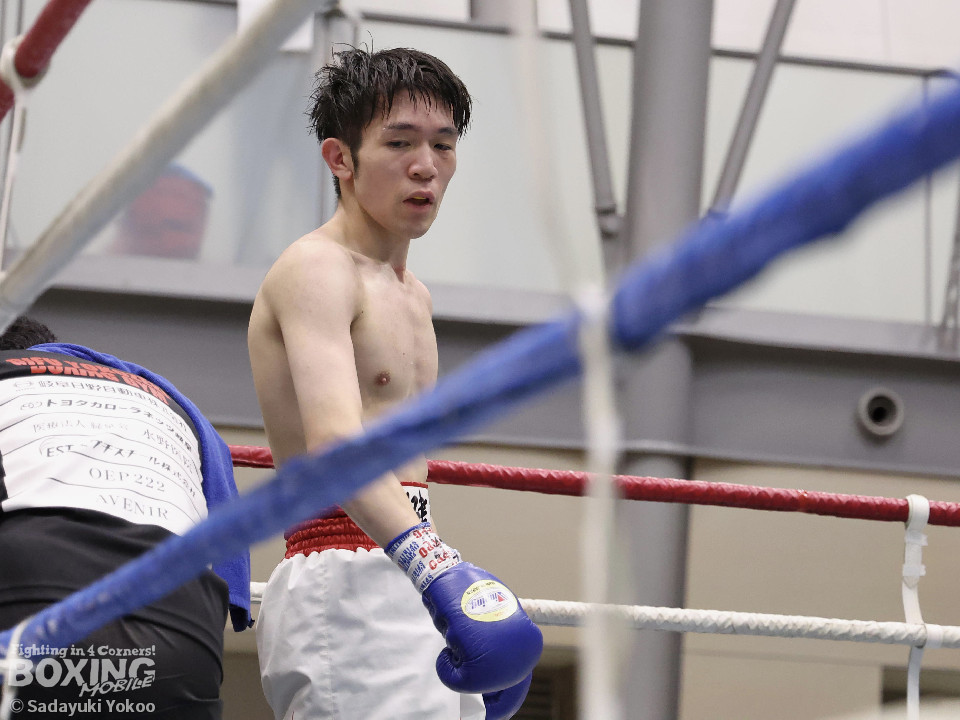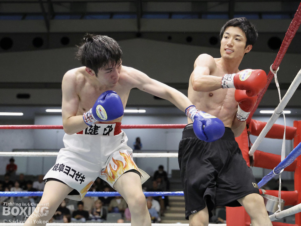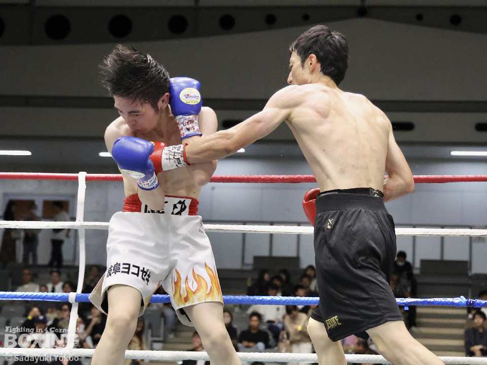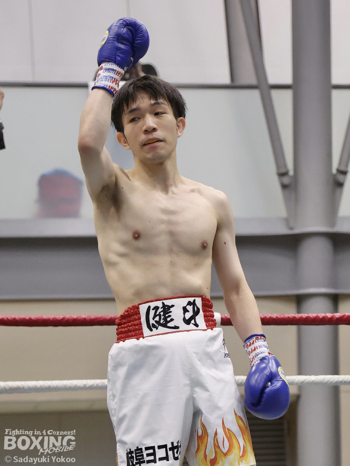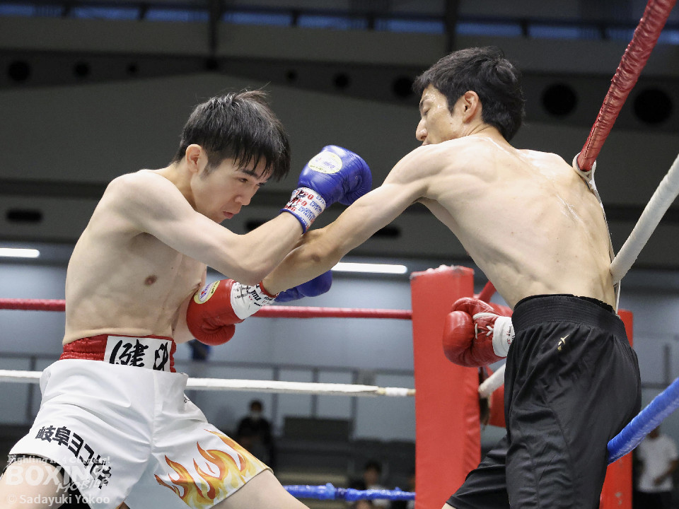 試合:サウスポー三上がロングレンジから上下のパンチを放ち、対する篠田は、ガードを固め左右のフックで対抗。2回、三上が打ち終わりを狙い左ストレートでポイントを重ね、この回の優勢をアピール。3回、篠田がプレスを強め上下を攻め、三上はカウンターで対抗するが、疲労が見え始める。最終4回、篠田が気持ちを前面に攻め続け、左右の強打を放つ、対する三上は、打ち終わりを狙いストレートで応戦、身体を預け合っての打ち合いに。勝敗はジャッジに委ねられ、的確なパンチでポイントを重ね続けた三上が、判定で初勝利を収めた。