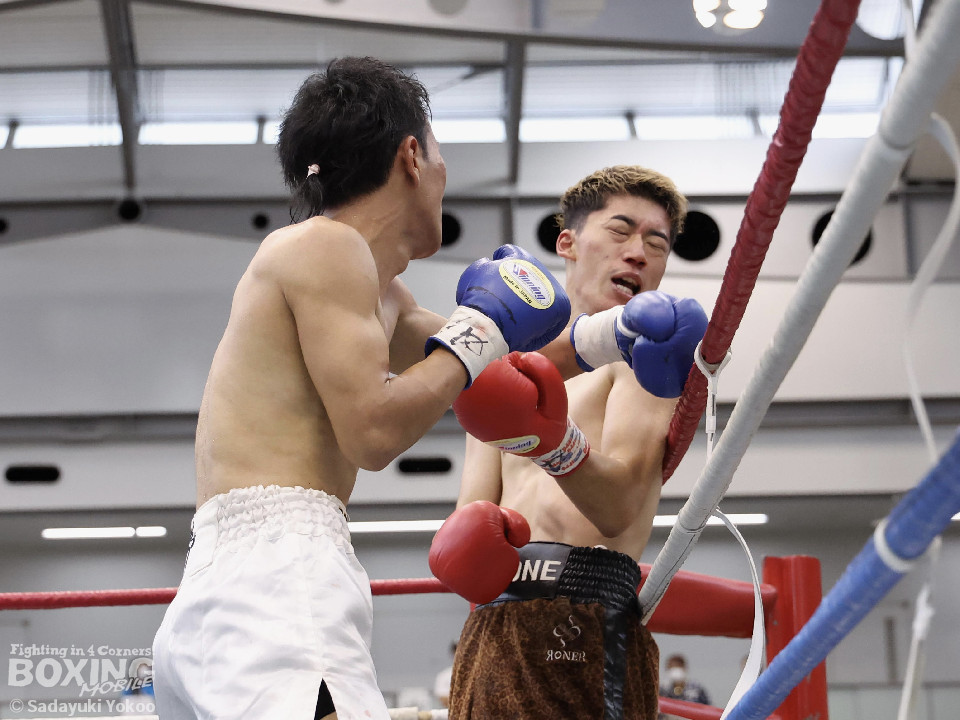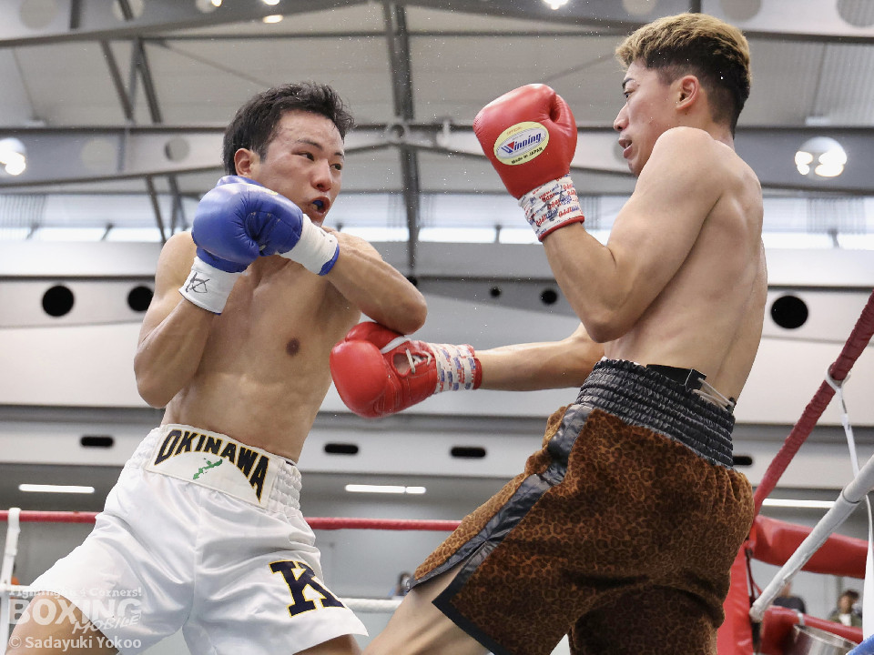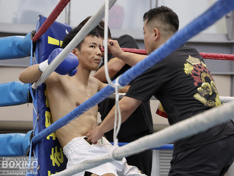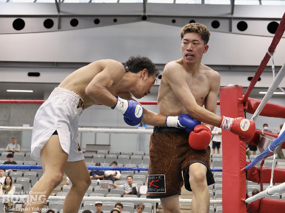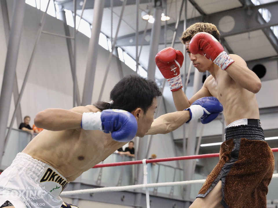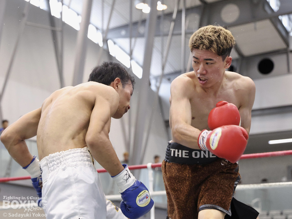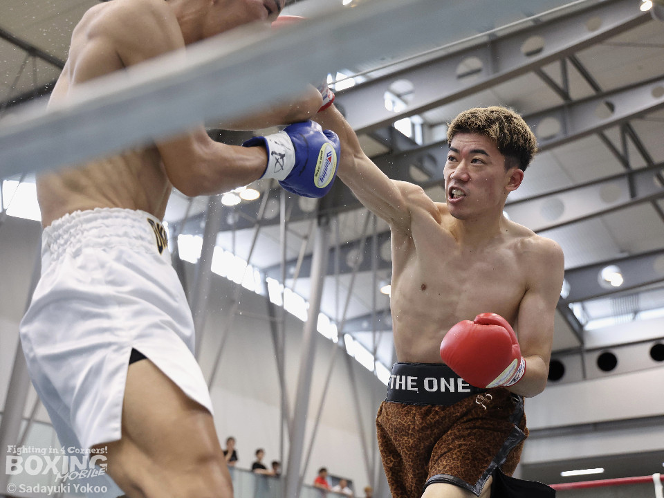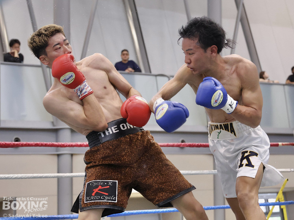 試合:仲里が左で距離を測り右フックへ繋げ、対する加藤はジリジリとプレスをかけワンツーを放つ。2回、このラウンドは距離の探り合いに、仲里の右ストレートが顔面を捉え、この回の優勢をアピール。3回、加藤がキレのあるジャブからワンツーで距離を突き放し、仲里がプレスをかけ左右のフックを強振し対抗。4回、仲里が飛び込みの左フックからコンビネーションへ繋げる。加藤がワンツーで応戦するも、やや疲れが見える。最終5回、加藤がワンツーで的確にヒットを重ね、仲里は左右の連打でプレスをかけ続ける。勝負の決着は採点へ。終始プレスをかけ攻め続けた仲里が3者の支持を得て、勝利を掴み取った。
