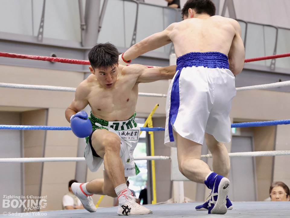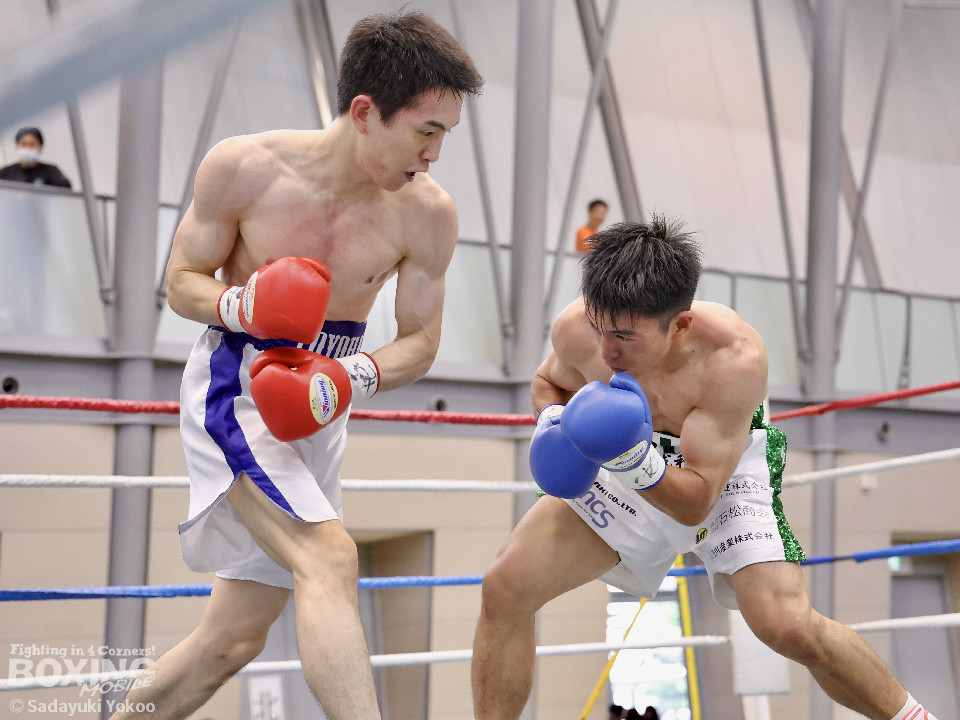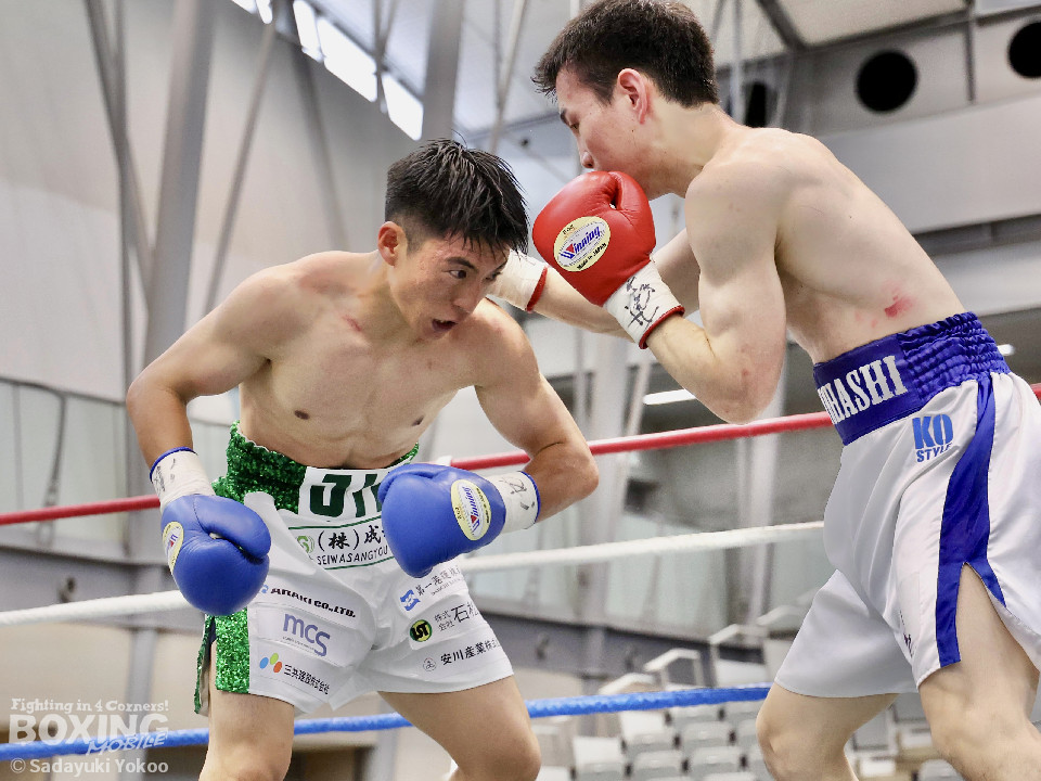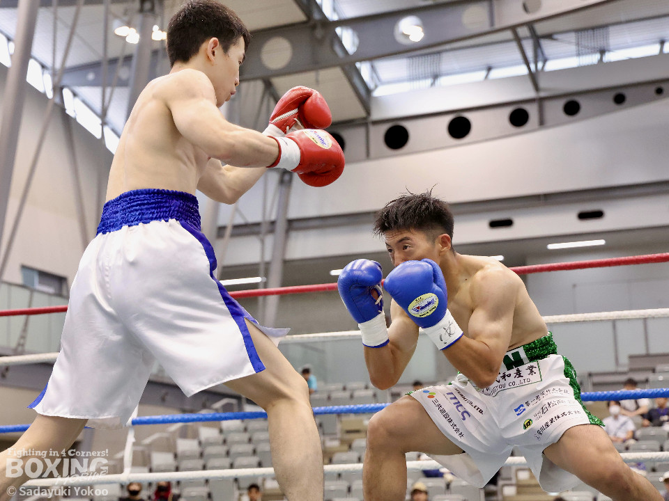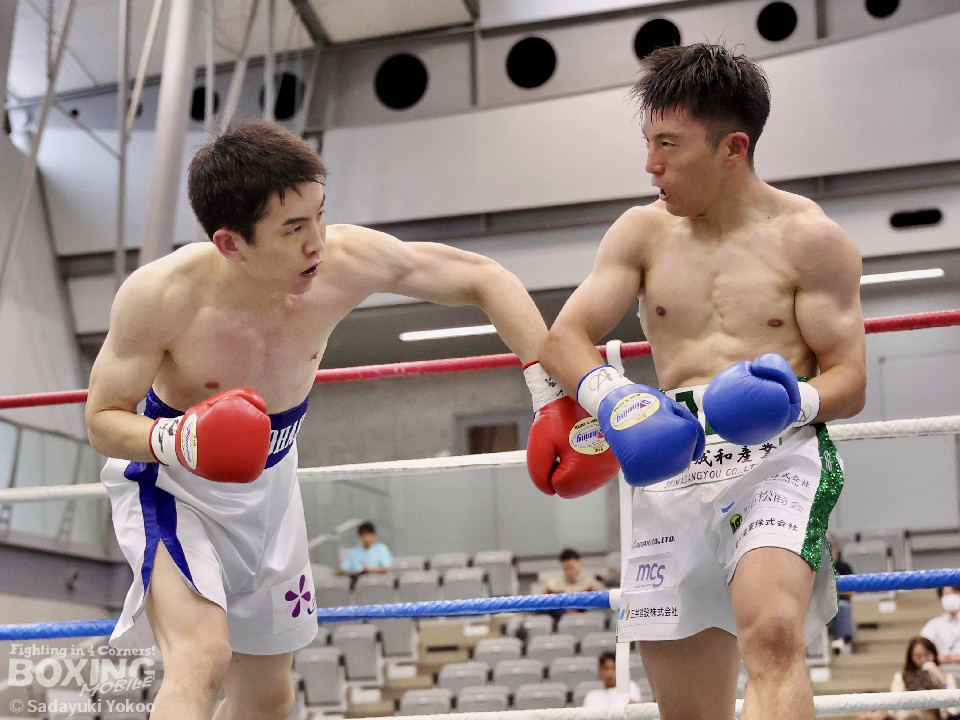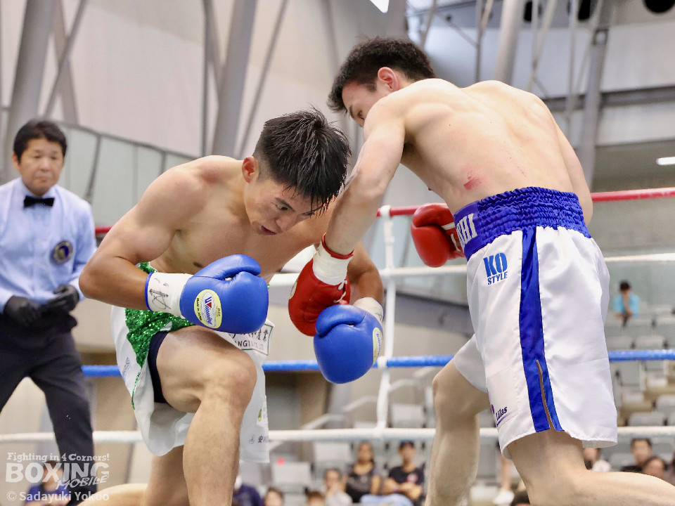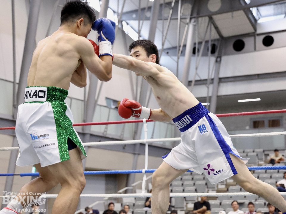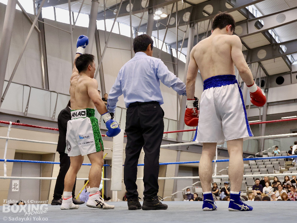 試合:サウスポー同士の一戦。川添が至近距離から左右のフックで攻め、対する鈴木は、ガードの隙間からパンチ差し込み応援。2回〜3回、川添は体制を低く保ちプレスをかけ左右のフックを強振、対する鈴木は退がらず応戦し、打ち終わりを狙い左右の強打で返す。最終4回、会場が声援に包まれる、激しい打ち合いを展開するも、決着は着かず勝敗の結果は判定へ。引き分けとなったが、優勢点により川添が次戦に駒を進めた。