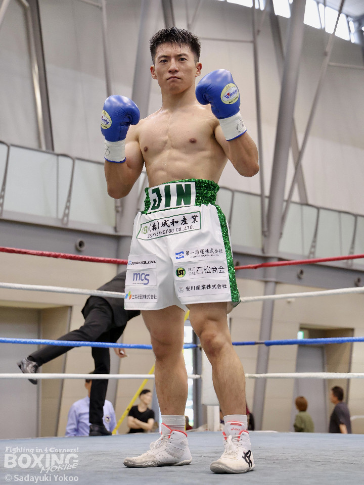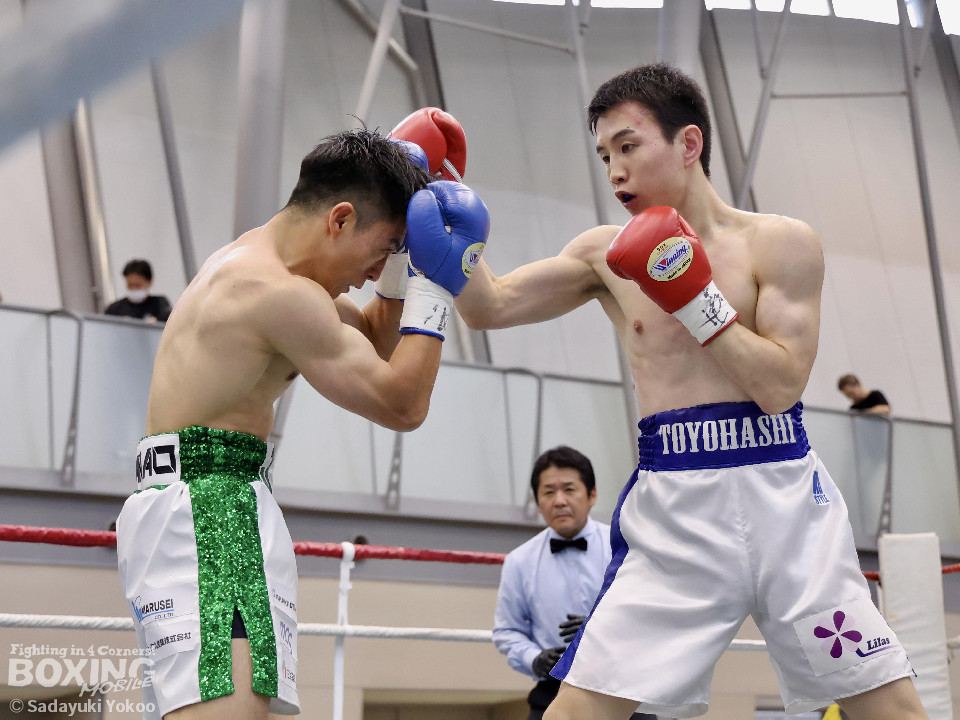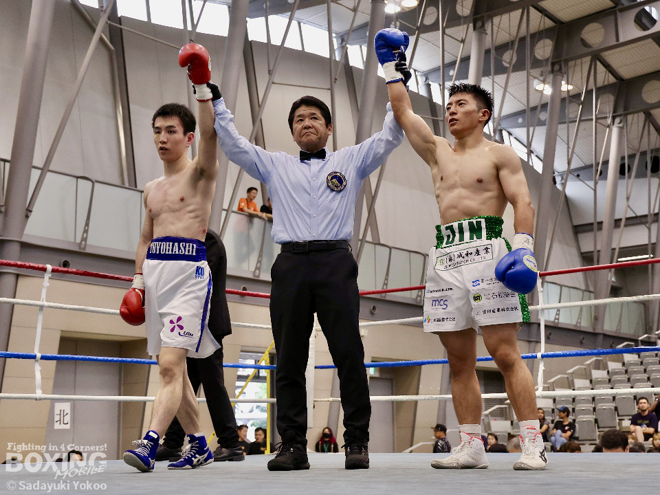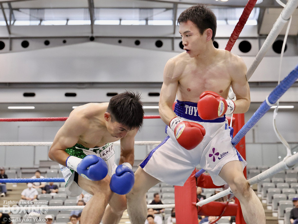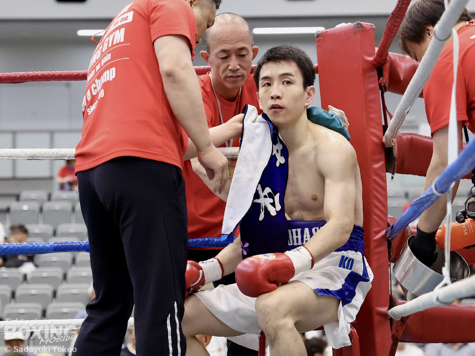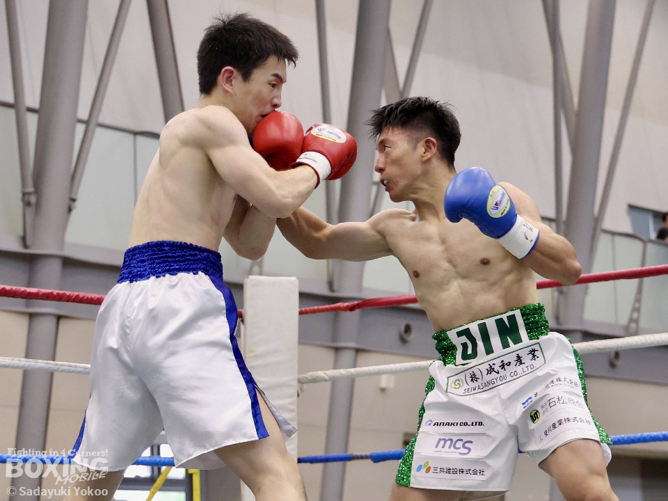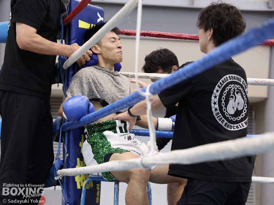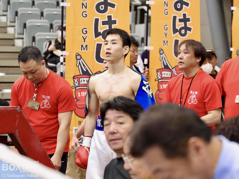 試合:サウスポー同士の一戦。川添が至近距離から左右のフックで攻め、対する鈴木は、ガードの隙間からパンチ差し込み応援。2回〜3回、川添は体制を低く保ちプレスをかけ左右のフックを強振、対する鈴木は退がらず応戦し、打ち終わりを狙い左右の強打で返す。最終4回、会場が声援に包まれる、激しい打ち合いを展開するも、決着は着かず勝敗の結果は判定へ。引き分けとなったが、優勢点により川添が次戦に駒を進めた。