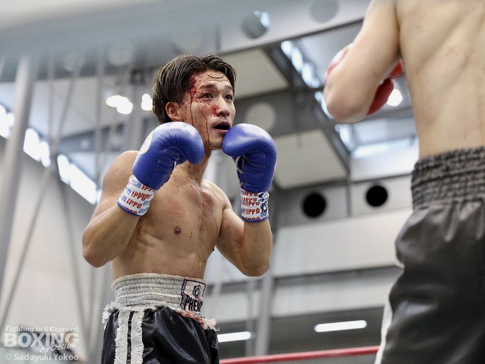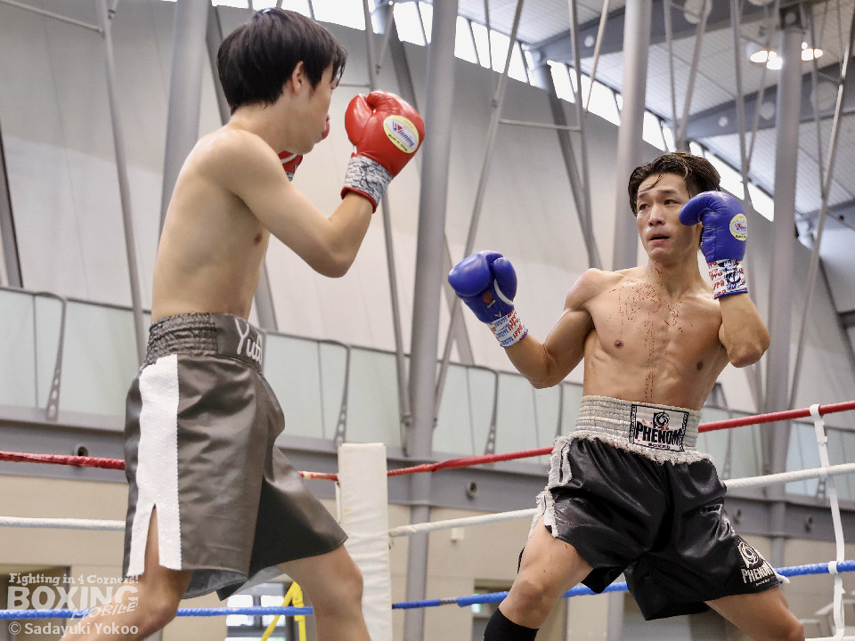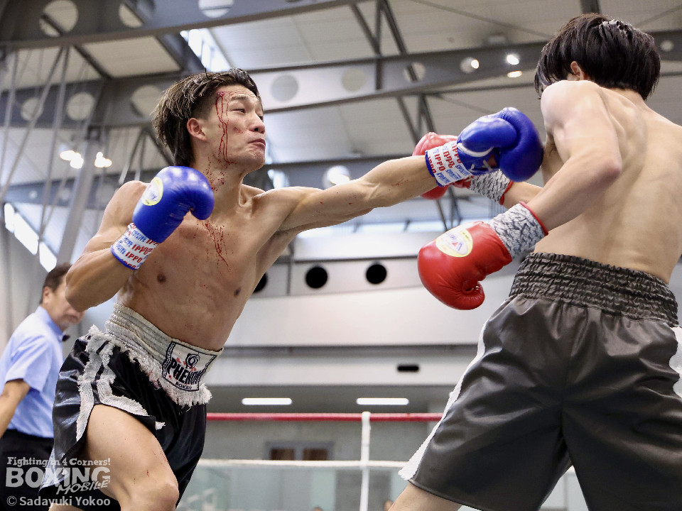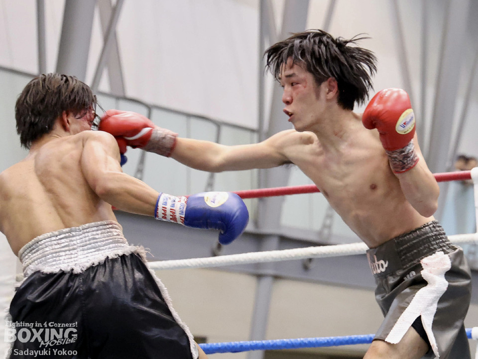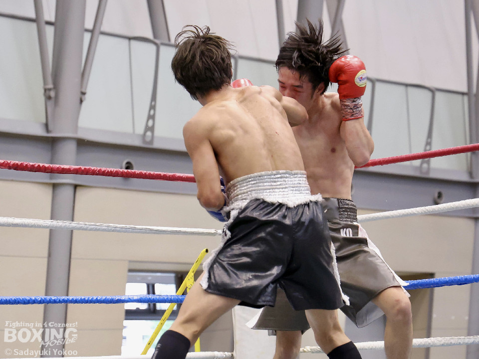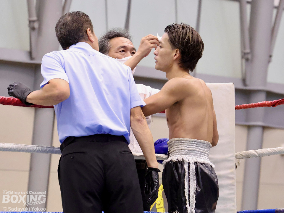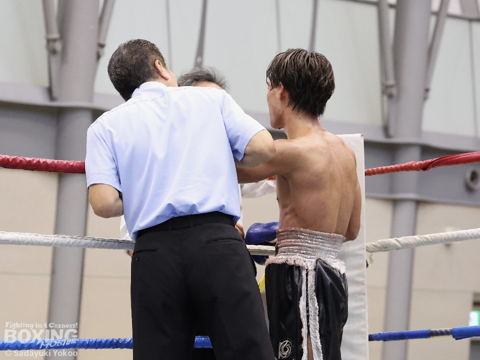試合:サウスポーの鶴丸がジリジリと距離を詰め、キレのある右フックからワンツーへ繋げ、中村は距離を保ち冷静にパンチを返す。この回、偶然のバッティングにより鶴丸が右目上側頭部をカット。2回〜3回、鶴丸がプレスをかけ左右のパンチを強振、中村は左フックから右の強打へ繋げ応戦。最終4回、両者勝利を掴もうと打ち合いを展開するも、偶然のバッティングにより鶴丸が右目尻上をカット。ドクターチェックの結果、怪我の状態が深刻と判断され試合終了、負傷判定へ。終始、プレスをかけ攻め続けた鶴丸が勝利。