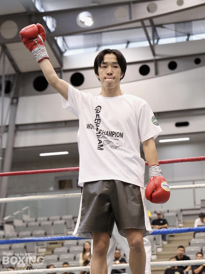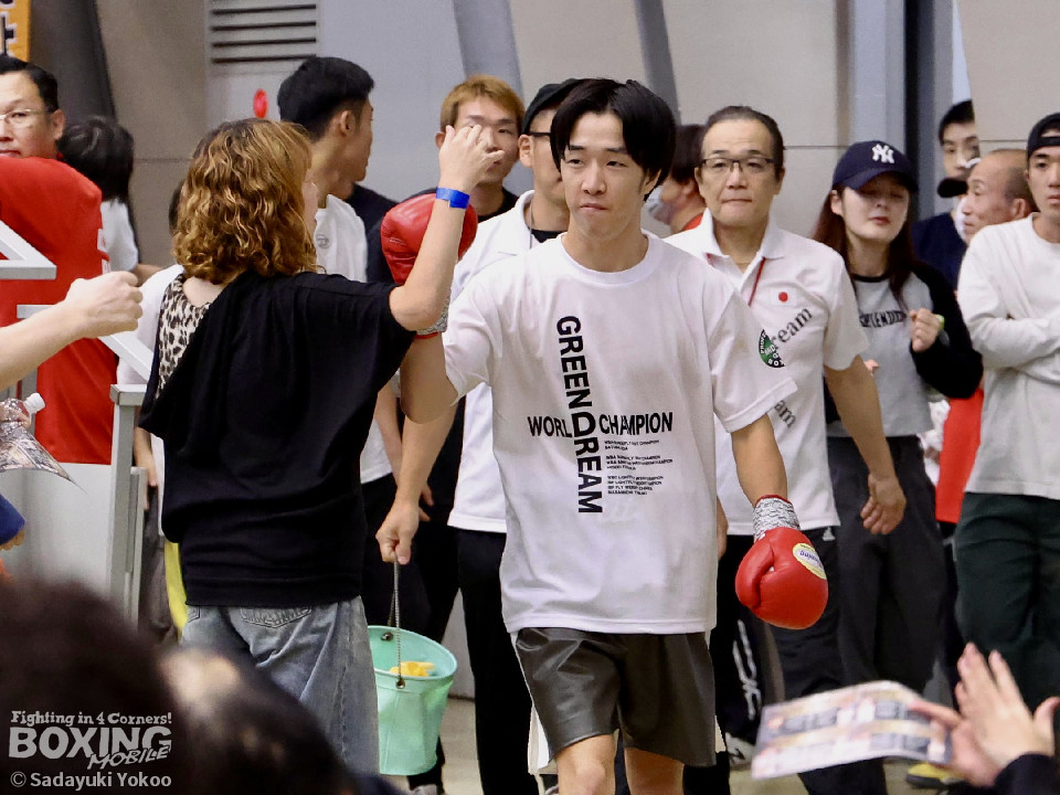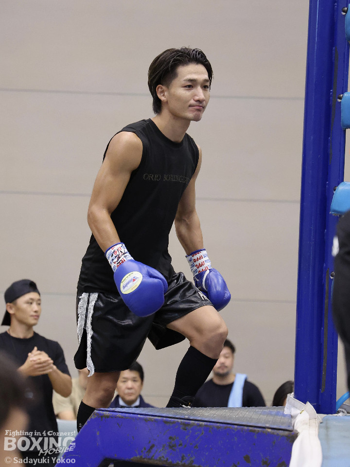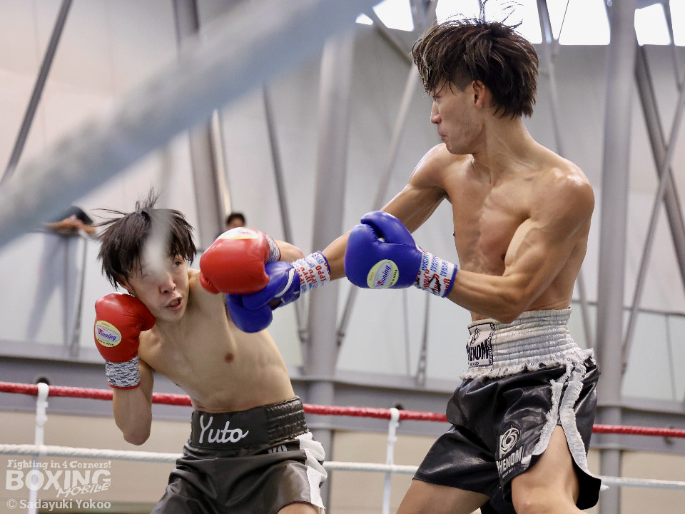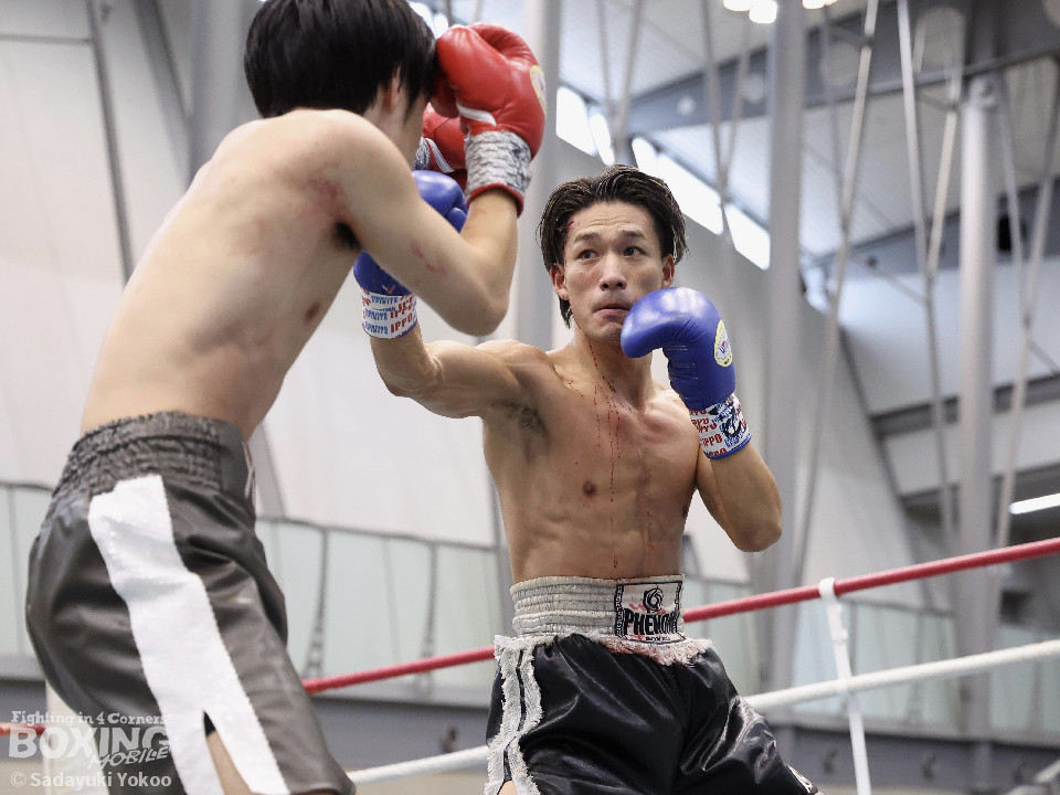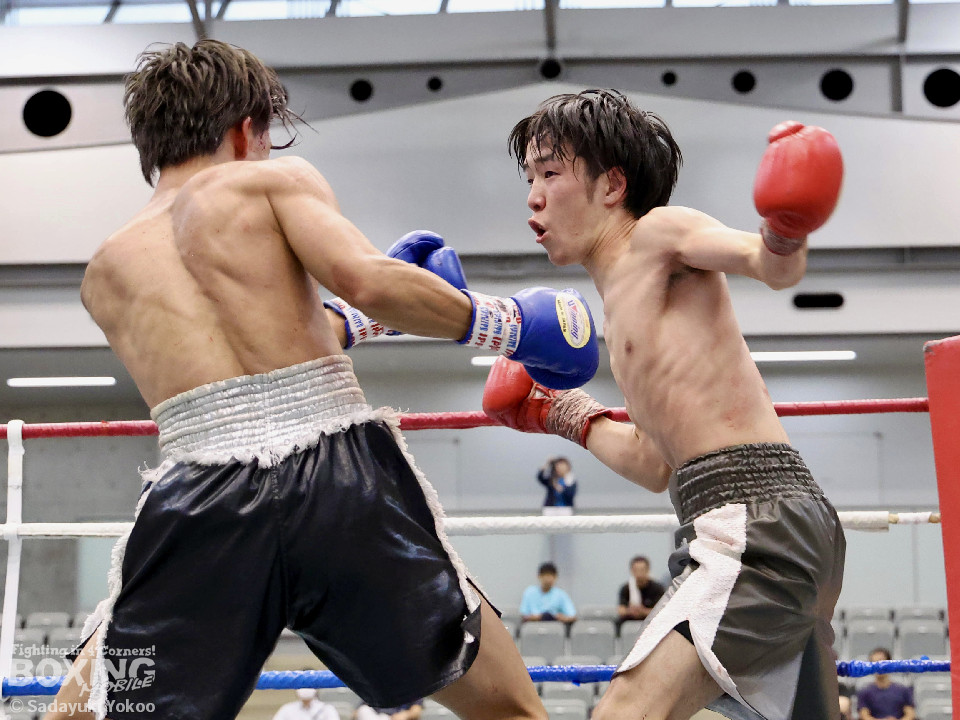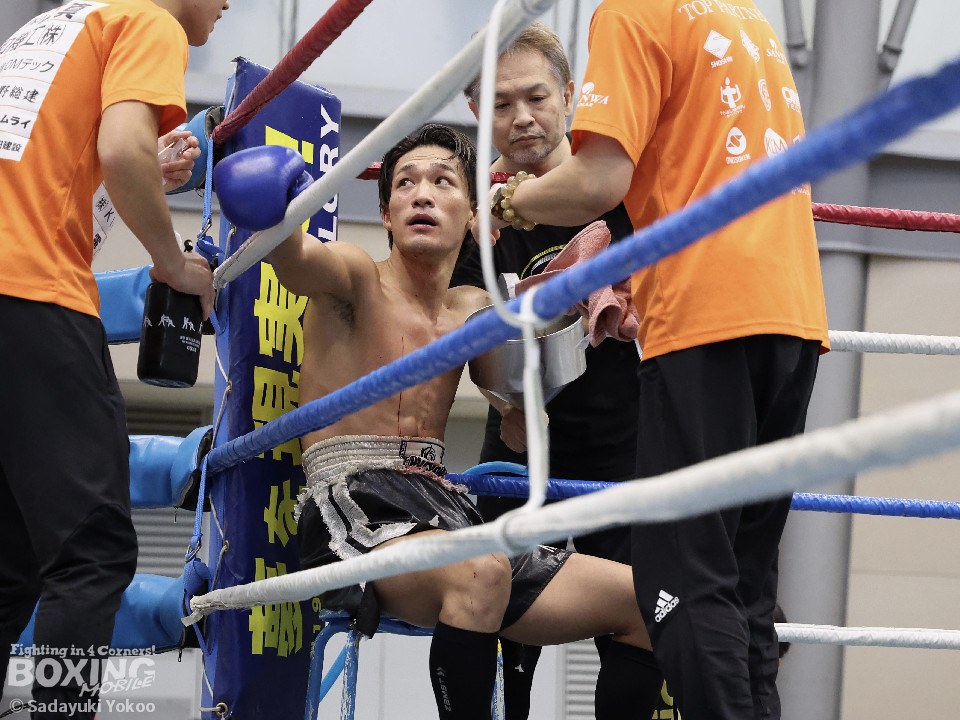 試合:サウスポーの鶴丸がジリジリと距離を詰め、キレのある右フックからワンツーへ繋げ、中村は距離を保ち冷静にパンチを返す。この回、偶然のバッティングにより鶴丸が右目上側頭部をカット。2回〜3回、鶴丸がプレスをかけ左右のパンチを強振、中村は左フックから右の強打へ繋げ応戦。最終4回、両者勝利を掴もうと打ち合いを展開するも、偶然のバッティングにより鶴丸が右目尻上をカット。ドクターチェックの結果、怪我の状態が深刻と判断され試合終了、負傷判定へ。終始、プレスをかけ攻め続けた鶴丸が勝利。