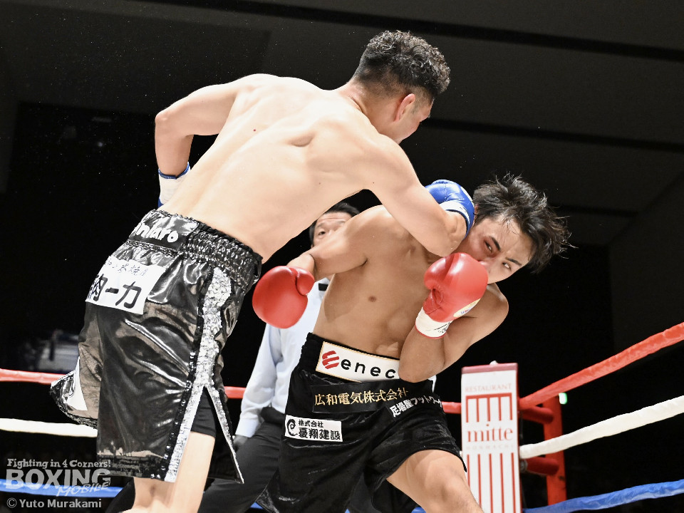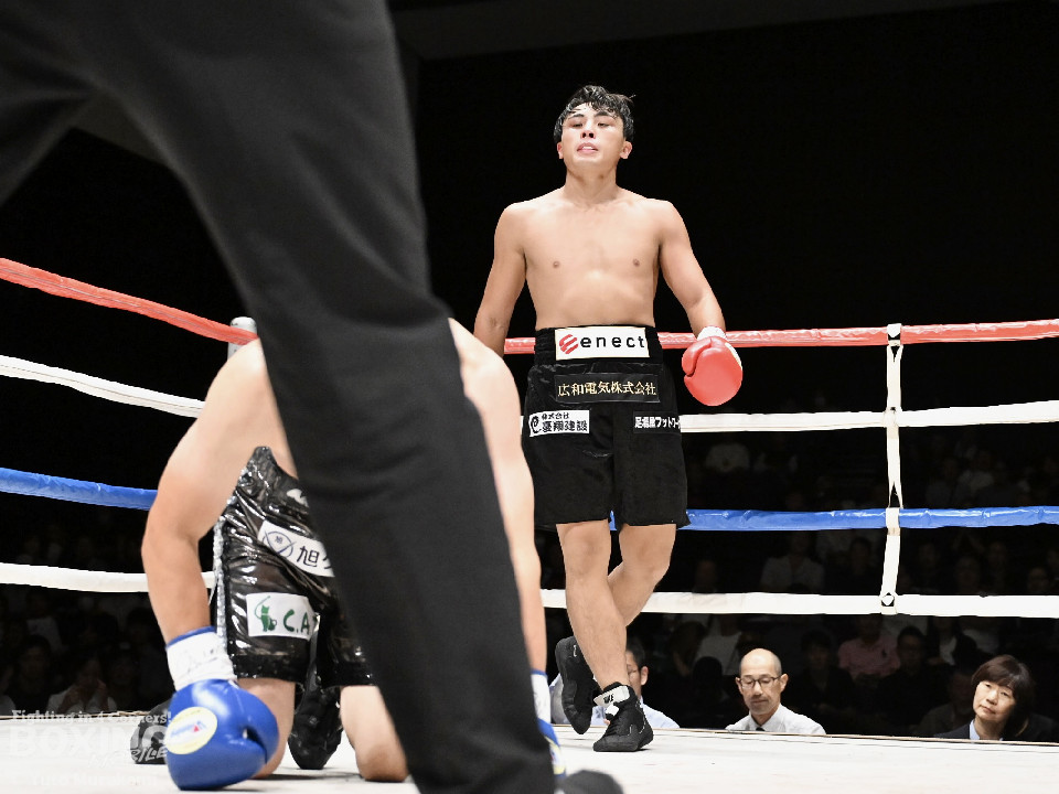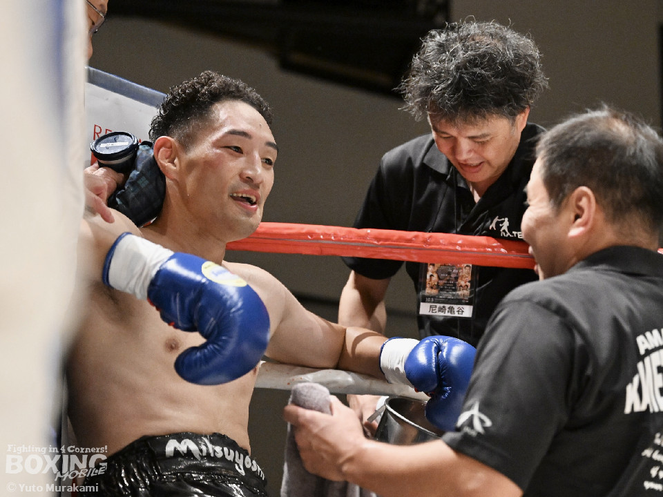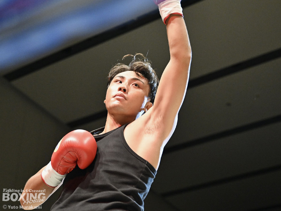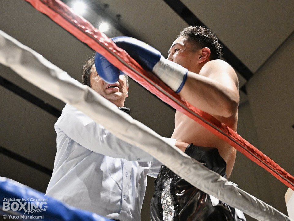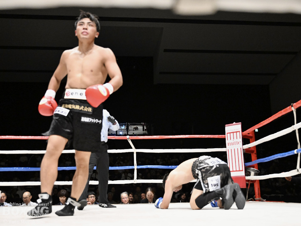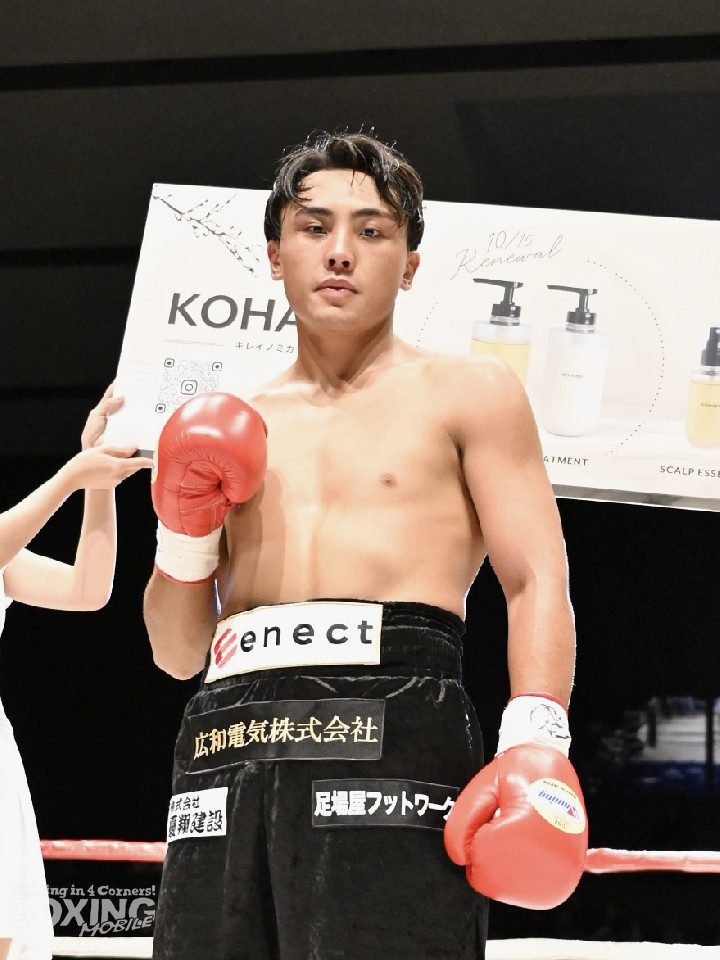 試合:日本ミドル級6位の可兒に元日本ランカーの大島が挑んだ。開始早々、大島が左右フックで仕掛けるが可兒はガードとボディワークで回避。可兒は左ボディを突き刺すと中間距離の打ち合いに発展。ラウンド終了間際、可兒は右フックを振り抜きダウンを奪った。2回、可兒は右ショートで2度目のダウンを奪取。再開後、パンチをまとめてレフェリーストップに持ち込んだ。可兒が今年7月以来の再起戦を飾った。