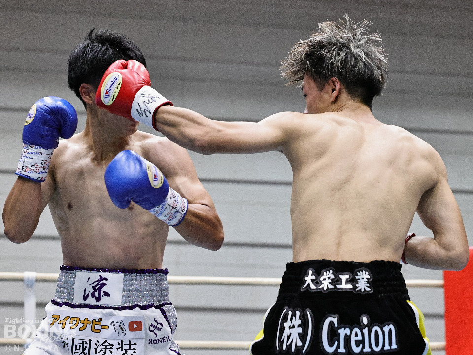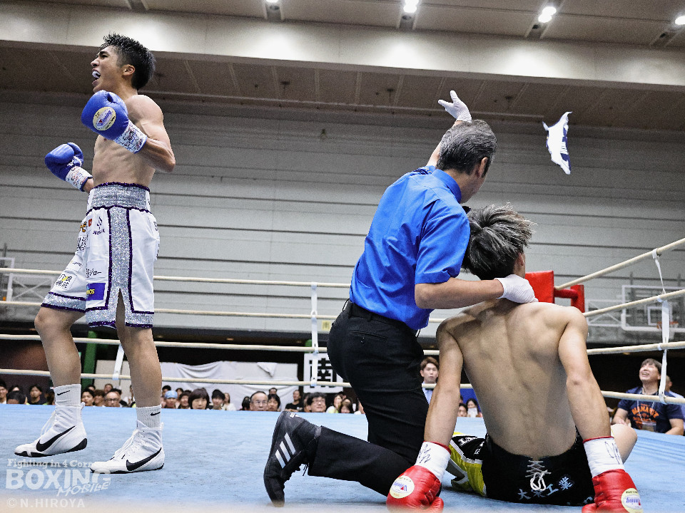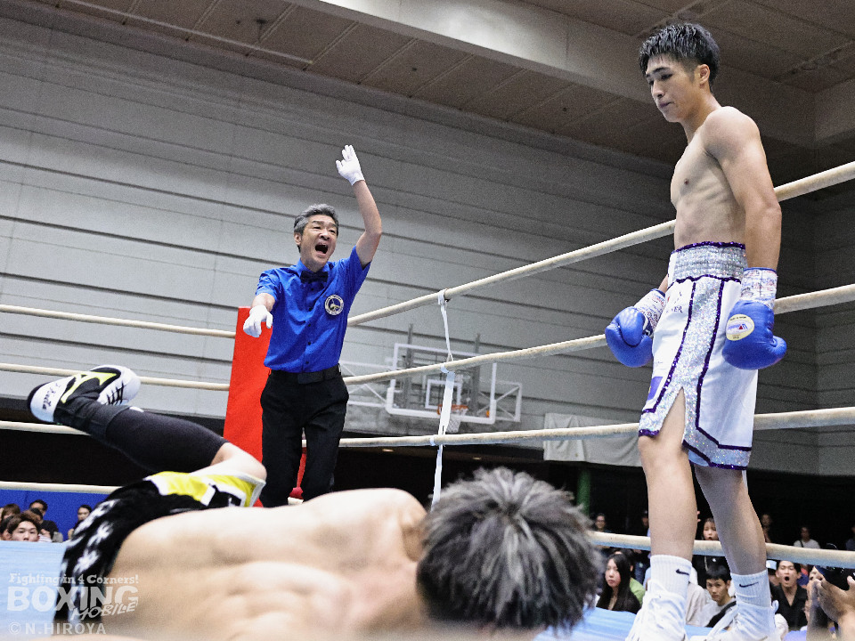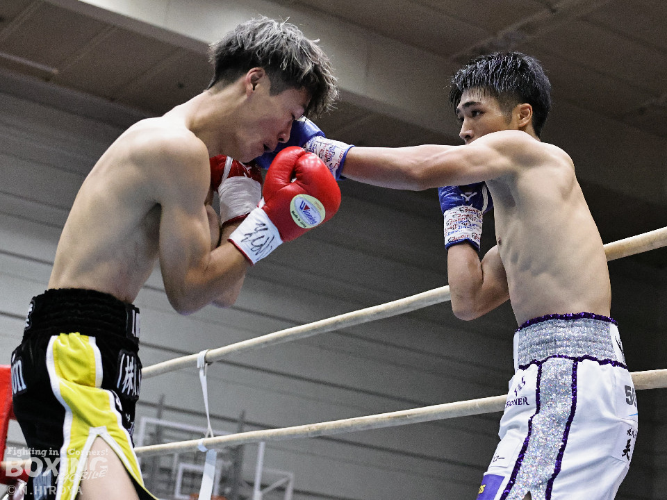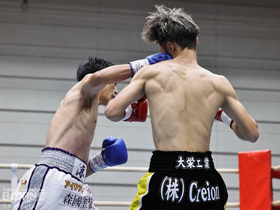 試合:ジャブから右につなげた福本に対し、市原はワンツーでバランスを崩させると連打で畳み掛け、ロープを背負わせると右アッパーでダウンを先取。再開後、連打を畳み掛けて2度目のダウンを奪うとレフェリーはノーカウントで試合をストップ。市原が初回KOで勝利。連続KO記録を6に伸ばした。
