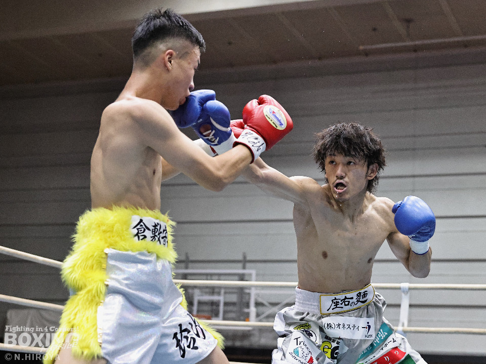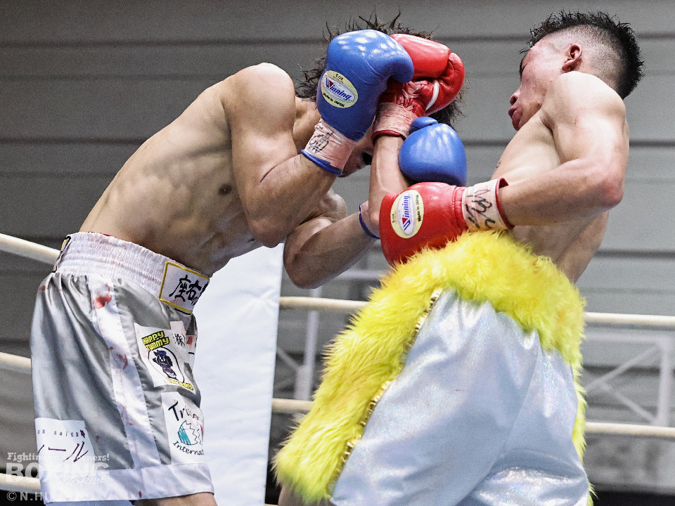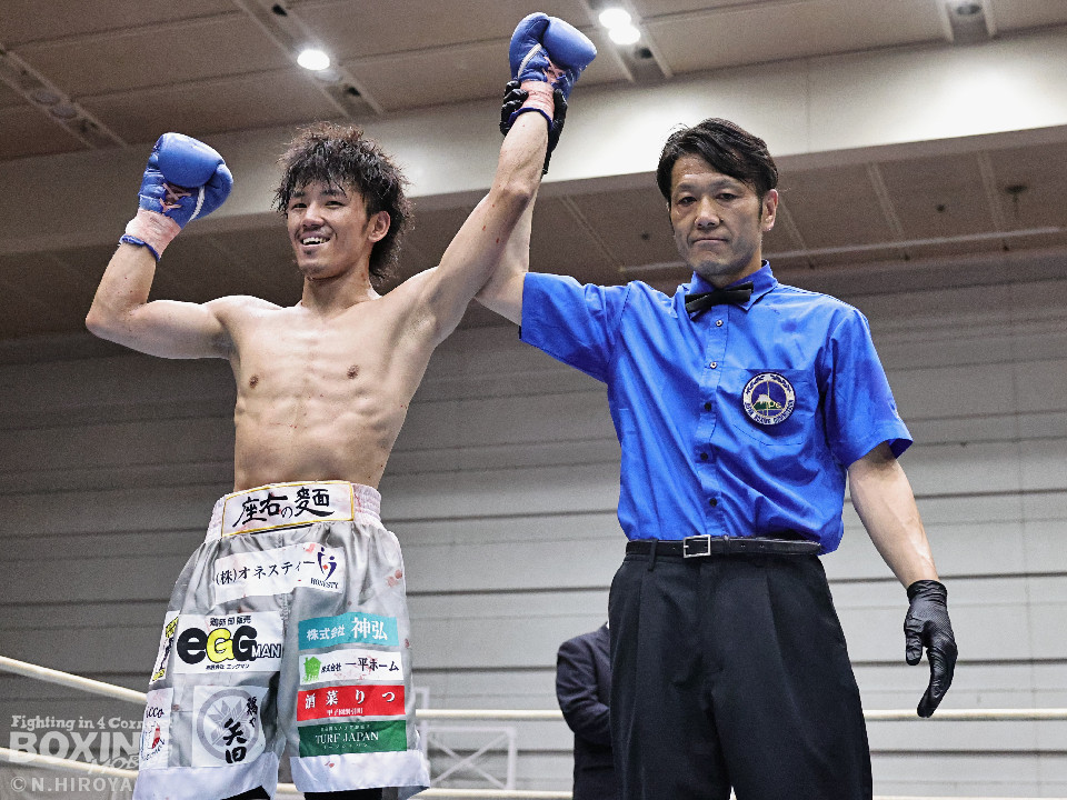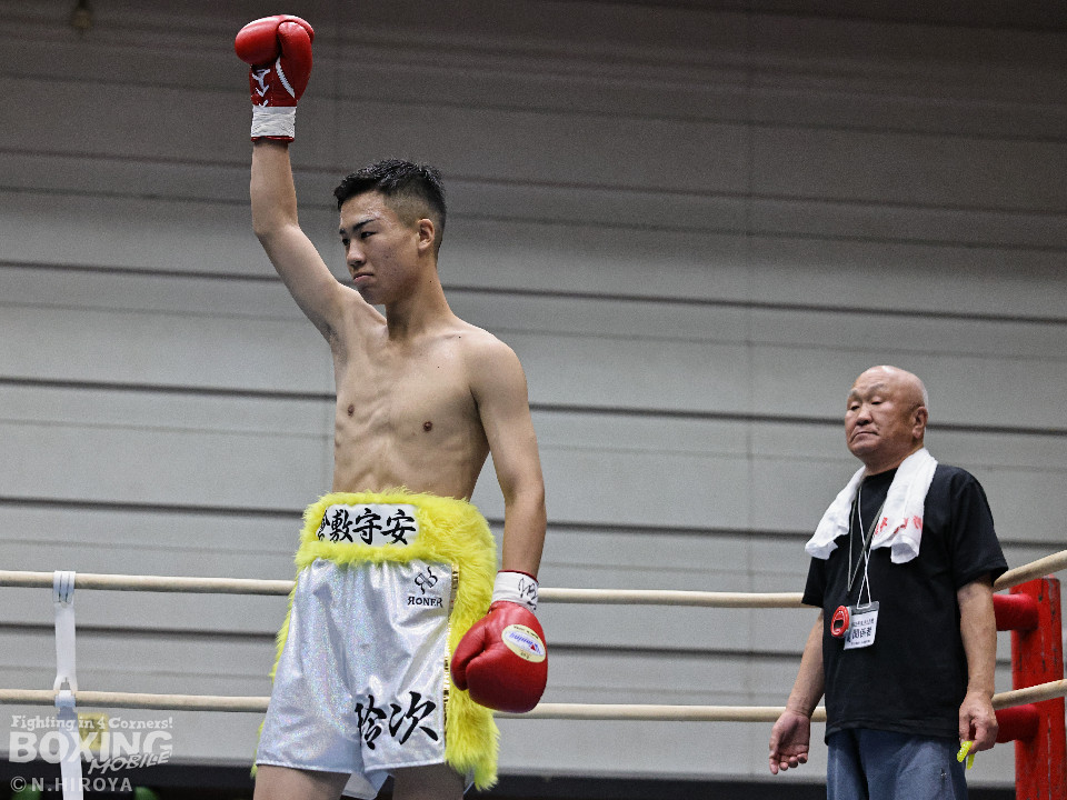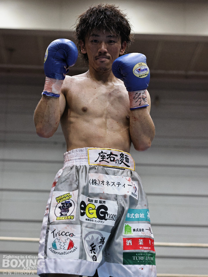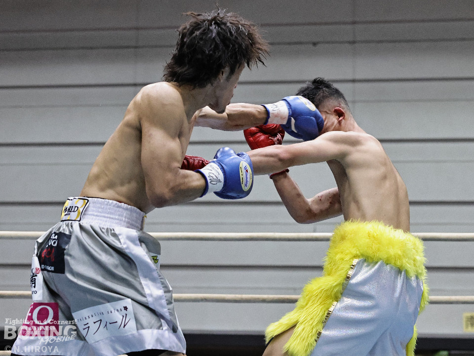 試合:フェイントをかけつつジャブでタイミングを測ったサウスポー高橋はワンツーのヒットを重ね、ポイントを稼いだ。2回、相手のパンチをバックステップでかわした高橋はワンツーを軸に攻勢を仕掛け、右アッパーを交えたコンビネーションを放つと田井の顔面が血に染まった。3回、プレスをかける田井に対し、ワンツーから右アッパーにつなげた高橋はノーモーションの左をヒット、ワンツーでダウンを先取した。4回、ワンツー連打で仕掛けた田井に対し、ワンツーから右につなげ、右フックをヒットした。結果は判定に持ち越され、高橋が3者の支持を得て判定勝利を飾った。