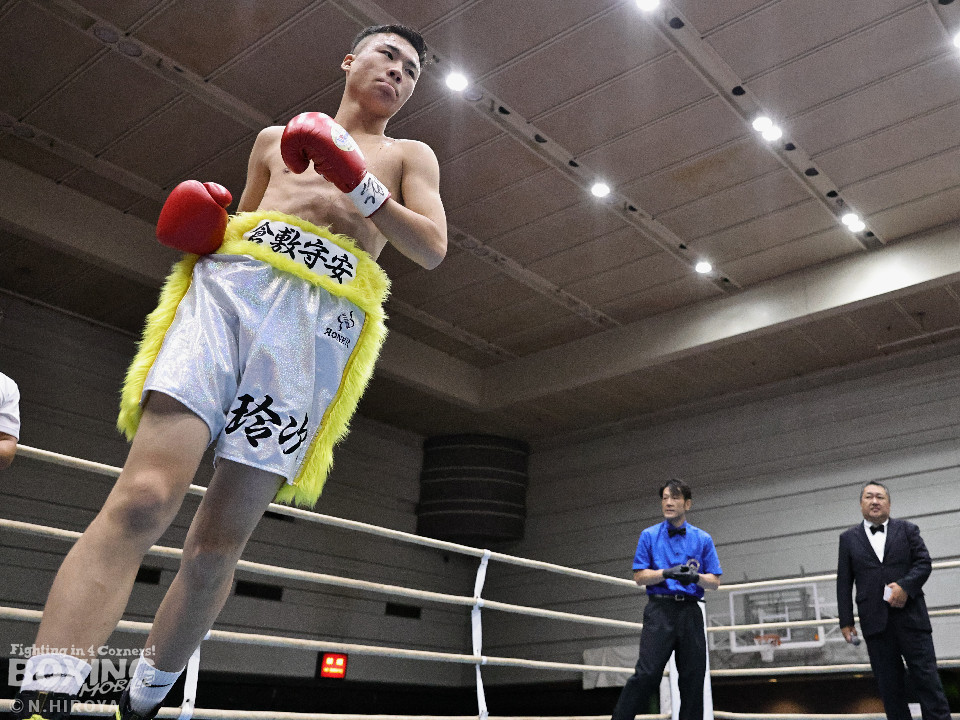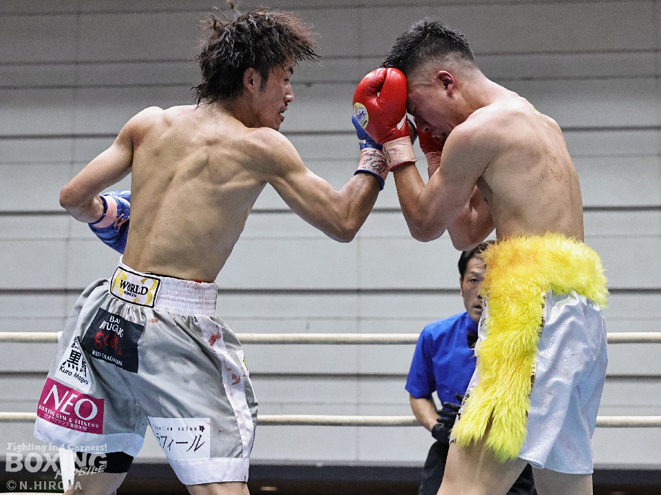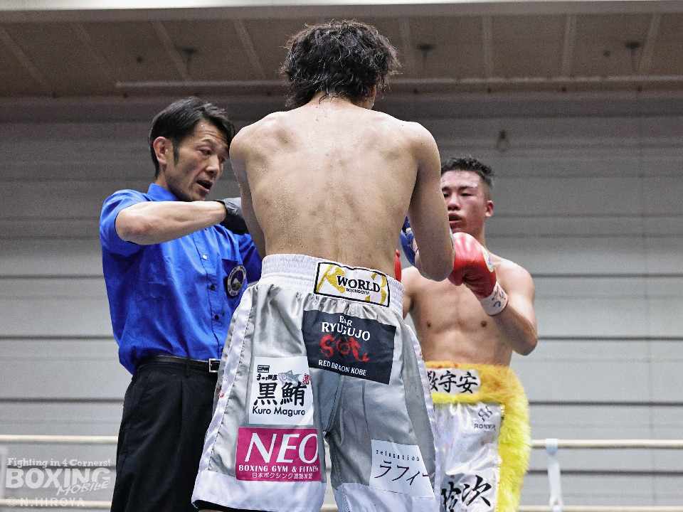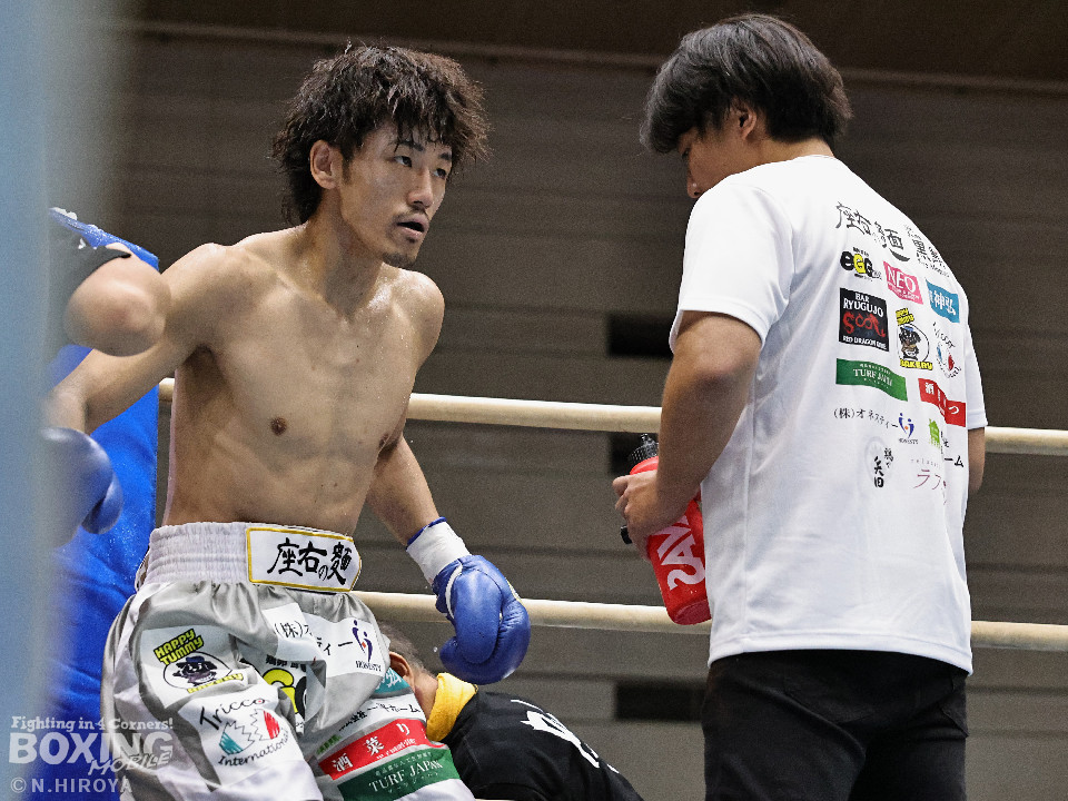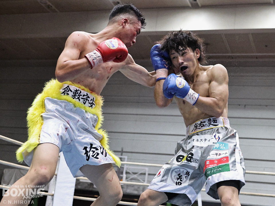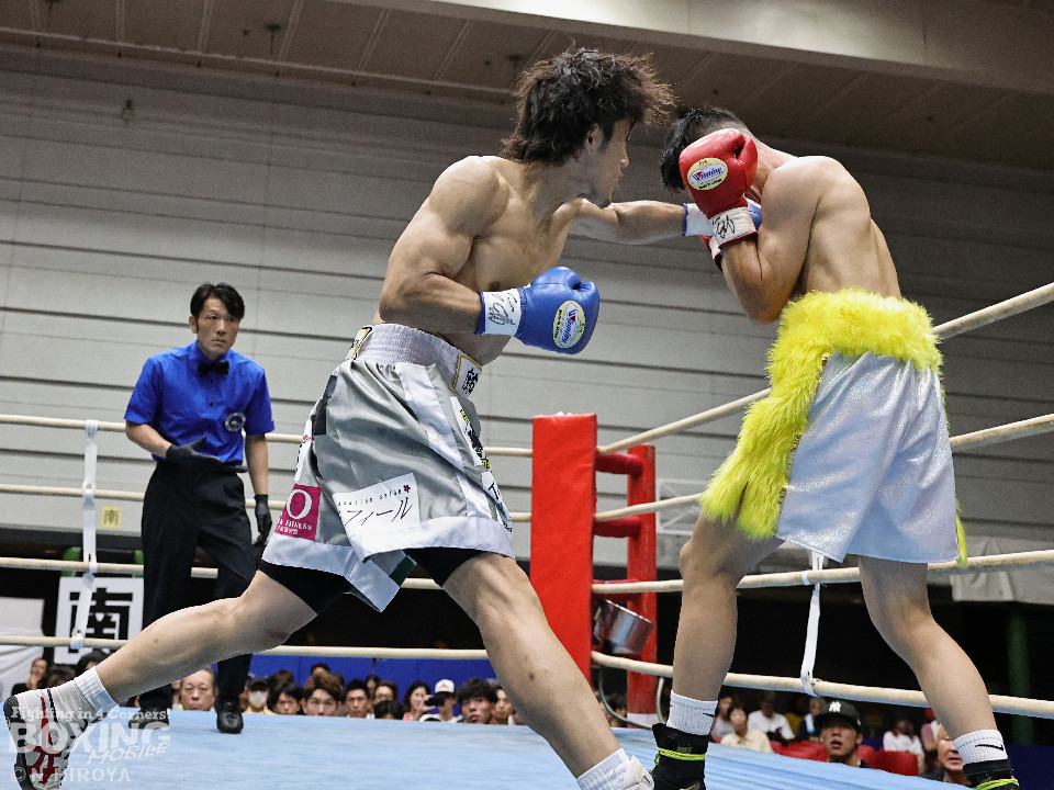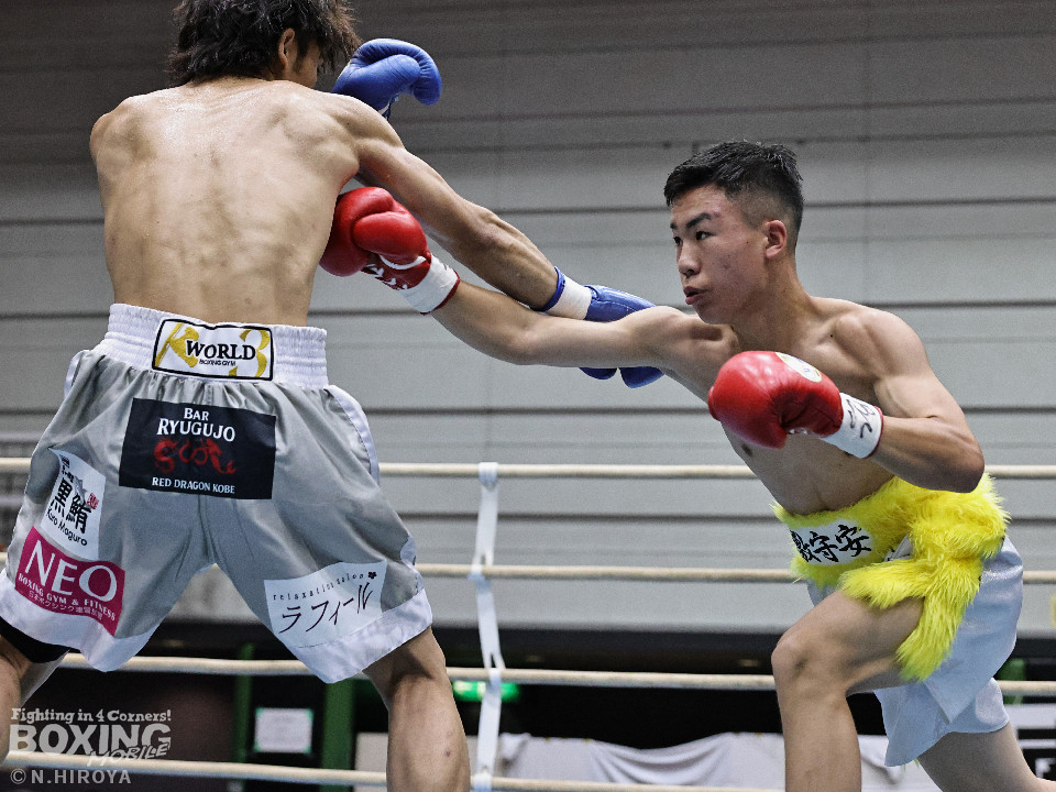 試合:フェイントをかけつつジャブでタイミングを測ったサウスポー高橋はワンツーのヒットを重ね、ポイントを稼いだ。2回、相手のパンチをバックステップでかわした高橋はワンツーを軸に攻勢を仕掛け、右アッパーを交えたコンビネーションを放つと田井の顔面が血に染まった。3回、プレスをかける田井に対し、ワンツーから右アッパーにつなげた高橋はノーモーションの左をヒット、ワンツーでダウンを先取した。4回、ワンツー連打で仕掛けた田井に対し、ワンツーから右につなげ、右フックをヒットした。結果は判定に持ち越され、高橋が3者の支持を得て判定勝利を飾った。