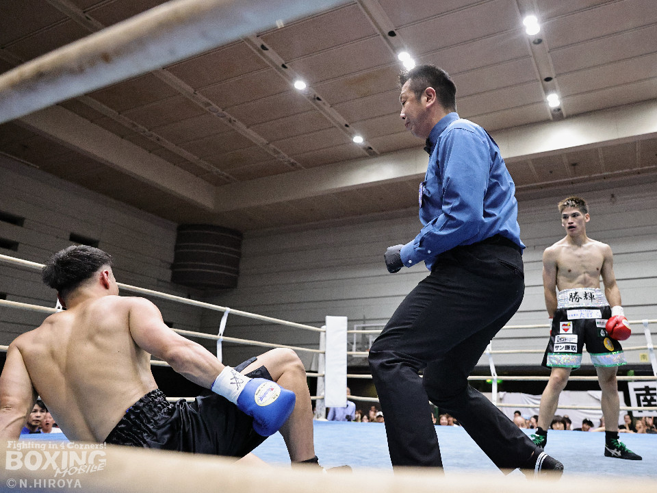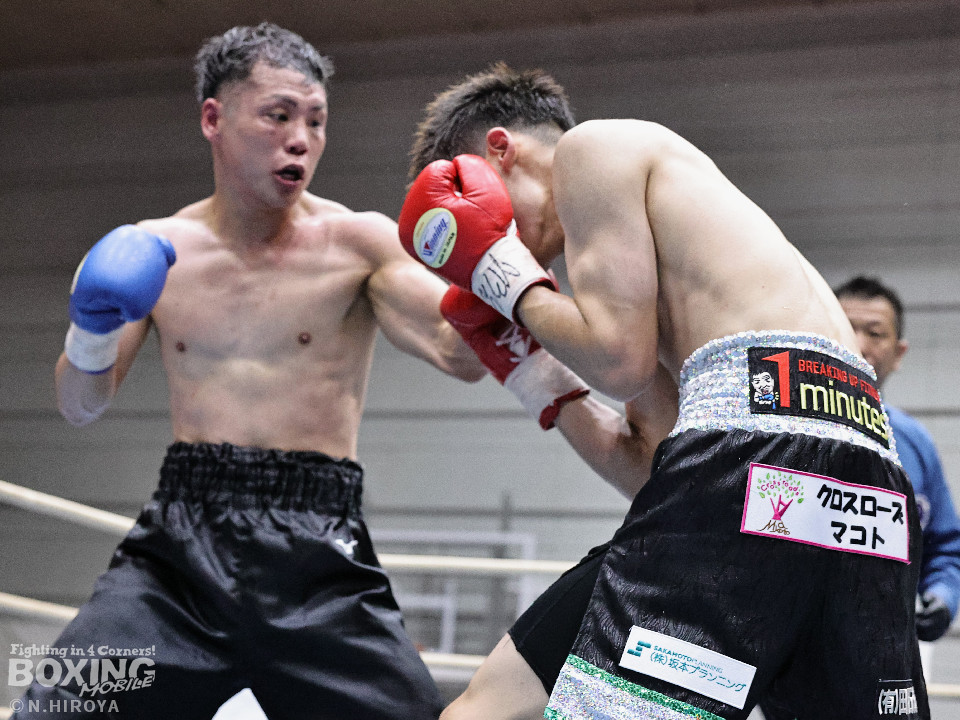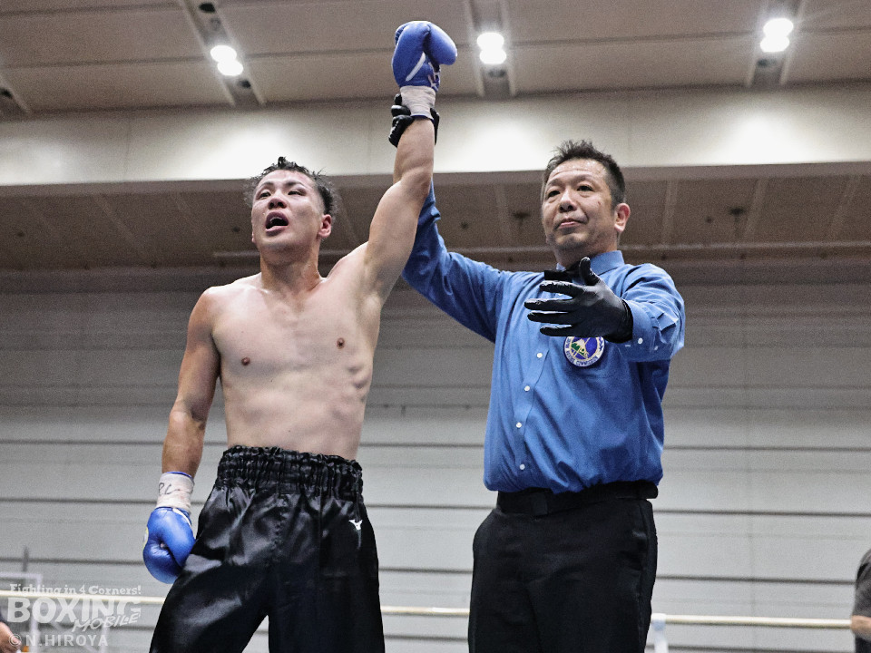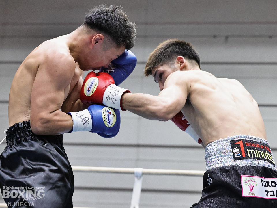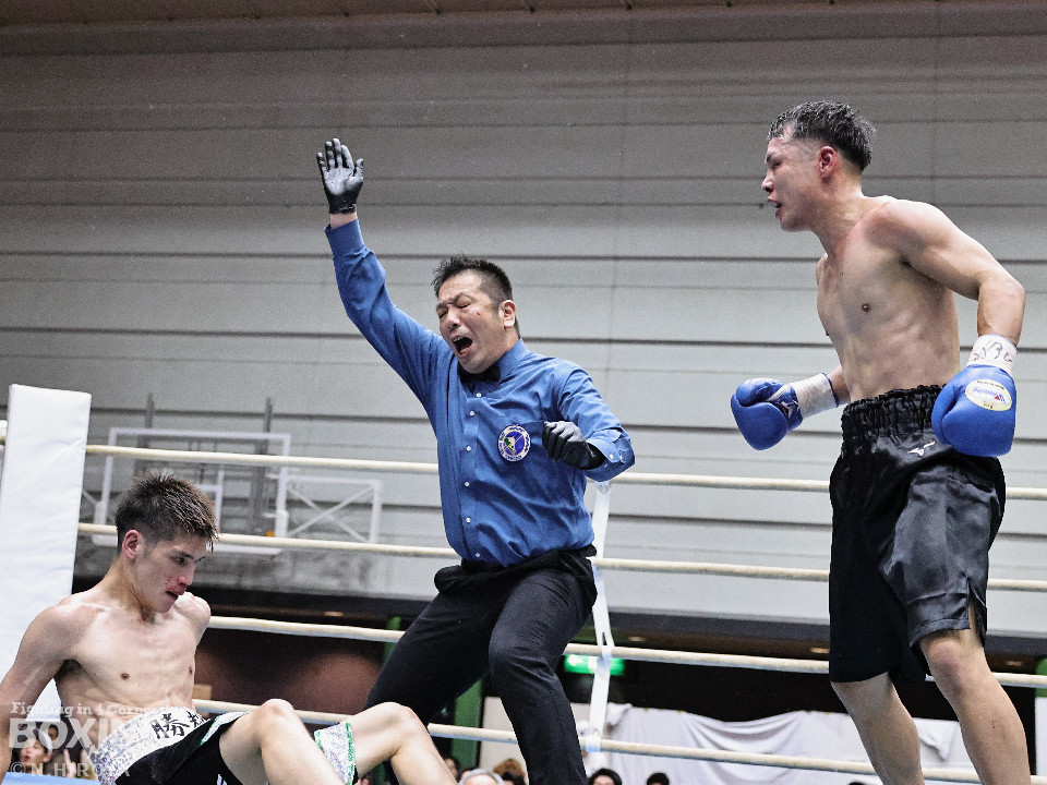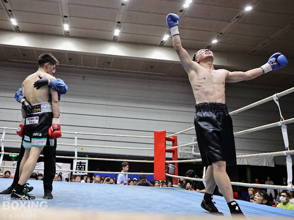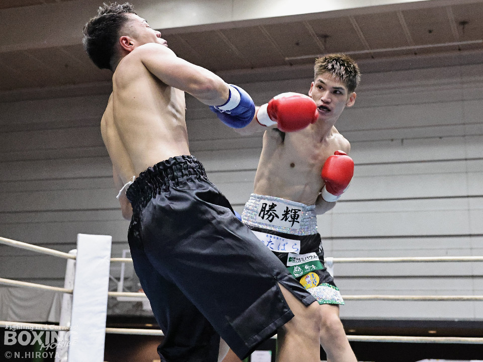 試合:開始ゴングと同時に互いに駆け寄ると、守屋が左右ボディを叩き、パンチを上に返し、曽田も右アッパーを交えたコンビネーションで応じ、右でダウンを奪った。2回、守屋が左右ボディを叩くと曽田もワンツーから左フックにつなげ激しい打ち合いとなった。3回、守屋が手数を増やして攻勢をかけ、左右ボディを叩くとワンツーを放った。曽田も負けじと左フックからの連打を放ち、どちらも引かない打撃戦となった。打ち合いの中で守屋が右フックでダウンを奪い返すと、レフェリーがノーカウントで試合をストップ。守屋がTKOで華麗な逆転勝利を飾った。