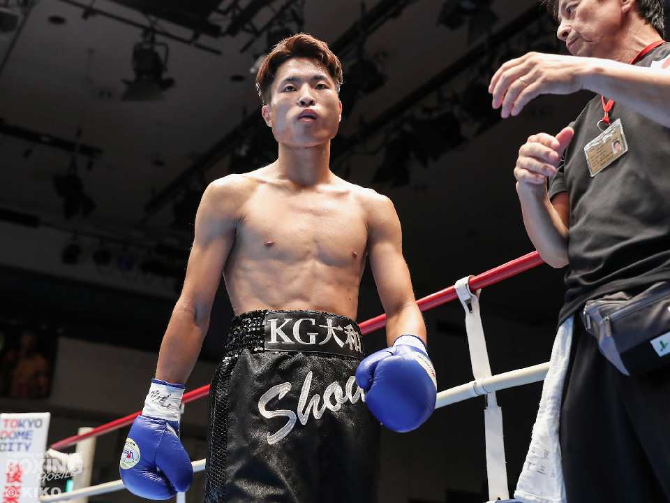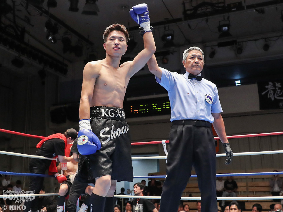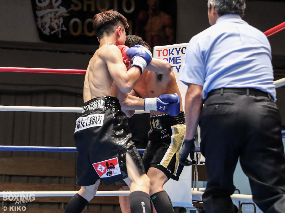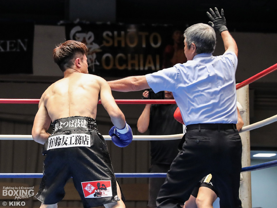 試合:飯塚がジャブを飛ばしながら出入りを意識。しかし、菅谷は慌てる素振りを見せずワンツーで腰を沈めさせて攻勢。チャンスとばかりに怒涛の連打でレフェリーストップに持ち込んだ。
