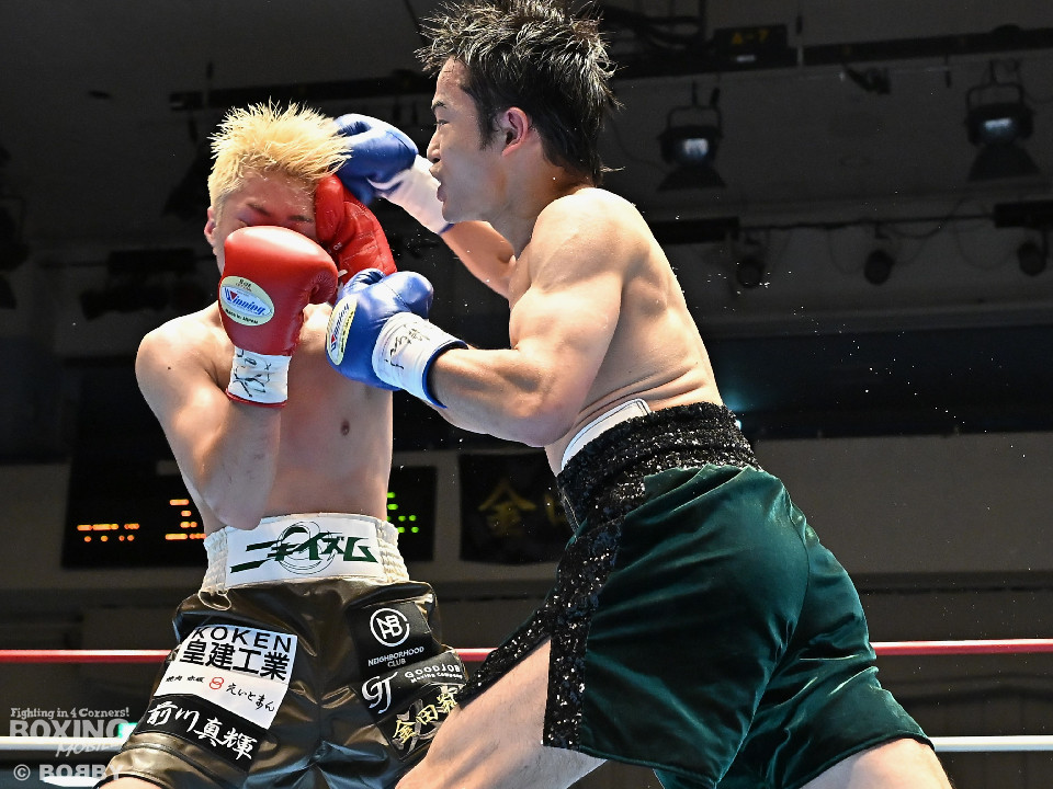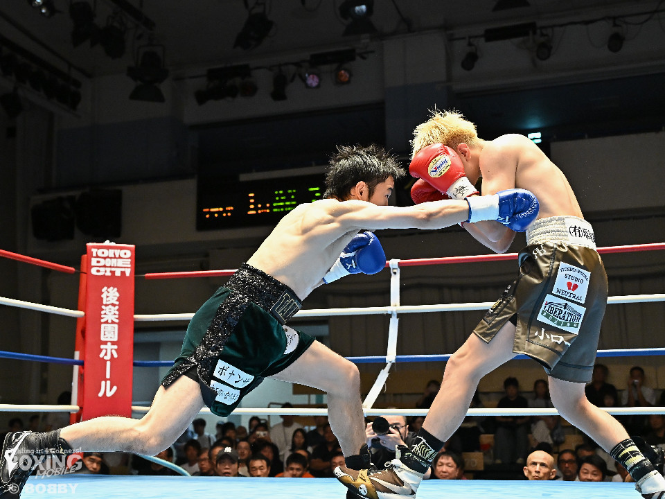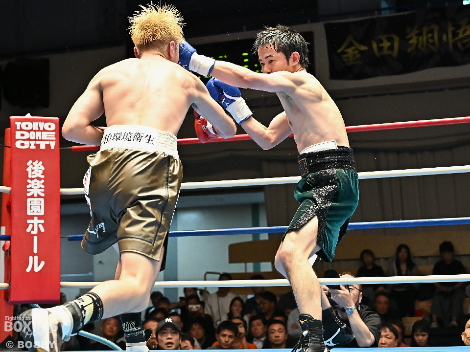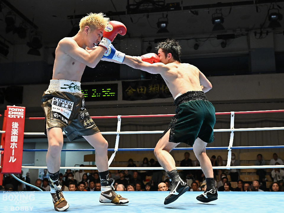 試合:左右に動きながら的を絞らせまいとする矢野に対し、金田はプレスをかけて力強いワンツーをヒット。2回、矢野は右フックを合わせると変則的な動きでやりにくさを発揮。3回も、矢野は相手の右を警戒しながら折を見て右フックを好打。曲者ぶりで金田の思い通りにさせず。4回、金田はなりふり構わず左右フックを振り回すが、矢野は距離を潰して回転力を活かした連打で積極性をアピールした。ジャッジ2者の支持を得た矢野が勝利した。