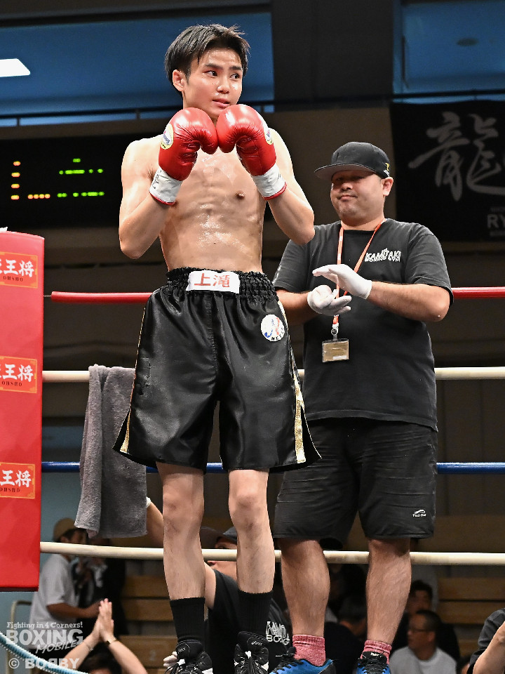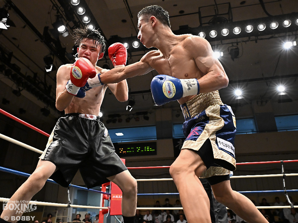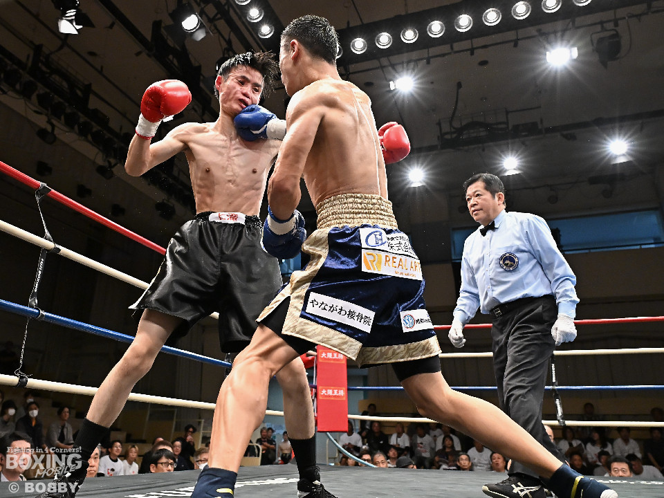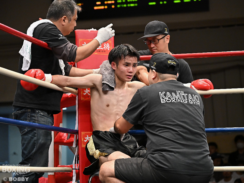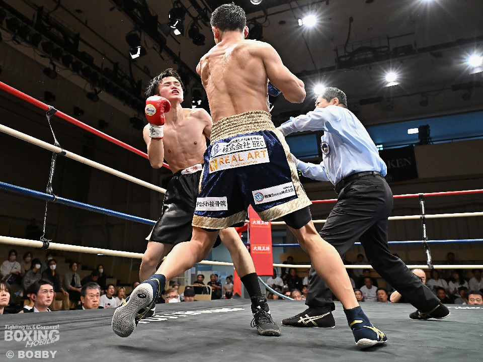 試合:松村が距離を詰めて左右フックでグイグイと攻め立ててペースを掌握。乱打戦に巻き込まれた太田は必死に返したが、後手に回る。勢いに乗った松村は連打で攻勢をかけて幸先の良いスタートを切った。2回、ジャブから立て直しを図る太田だが、松村は回転力を活かした連打で押し込むとダメージの深さを考慮したレフェリーがストップした。デビュー戦を飾った松村は大応援団の声援に手を挙げて応えた。