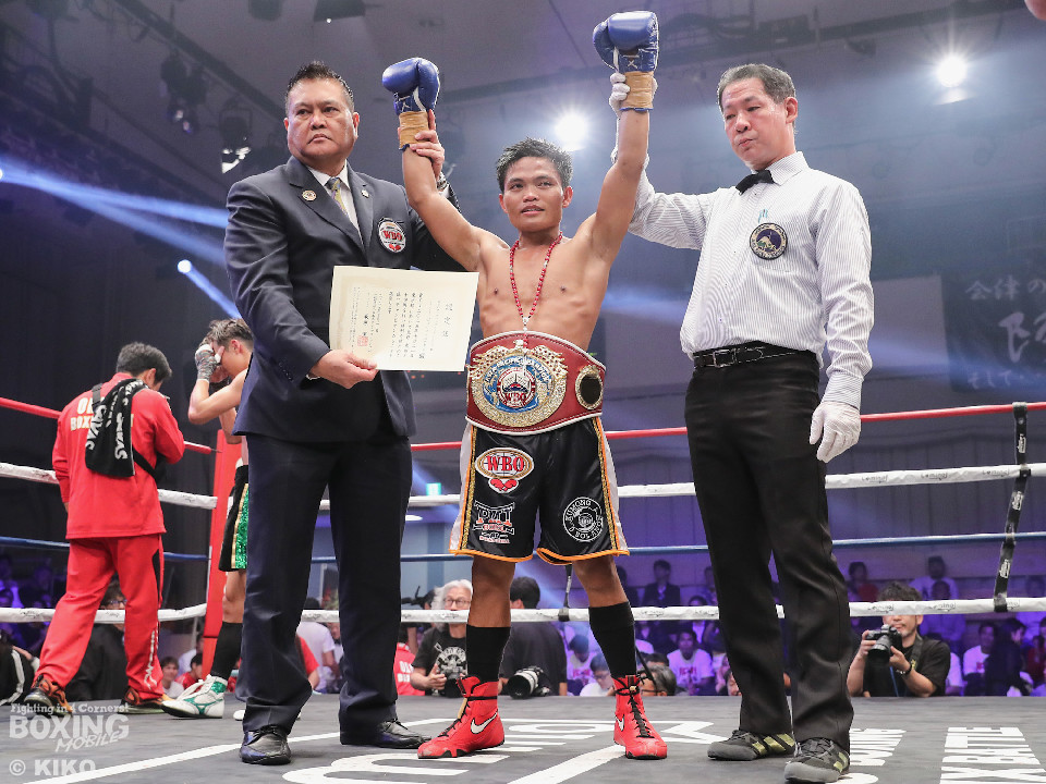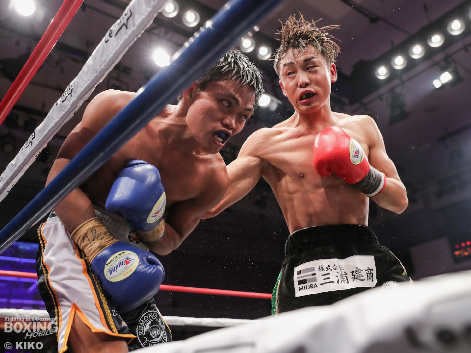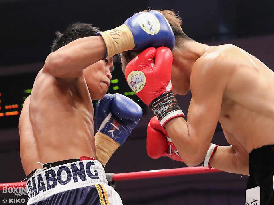 試合:日本ユース・ミニマム級王者の北野が2本目のベルトを狙うべく、WBOアジアパシフィック王座に挑んだ。サウスポー同士の試合は、北野がシャープなジャブを飛ばして組み立てるが、ラウンド終了間際、スマボンが左ショートをねじ込みダウンをゲット。まさかの展開に会場が大きくどよめいた。2回、北野は距離を潰して右ボディを叩きつけるがスマボンも真っ向から応戦。3回、消耗戦が続く中、スマボンが要所で左フックを決めて見栄えの良さをアピール。4回、北野はプレスをかけて単発の右ボディをヒット。続く回も北野は手数を増やしてアグレッシブな姿勢。6回、左オーバーハンドを浴びた北野だが倍返し。しかし、有効打はスマボンか。7~8回、拮抗したラウンドで甲乙つけがたいラウンド。9回、北野はプッシュしながら打ち下ろしの左ストレート、右ボディで攻勢。10回、北野は右ボディを突き刺すが、スマボンは右フックを強振。最後の力を振り絞り積極性を見せた。ダウンを奪ったスマボンが判定勝ちで新王者となった。