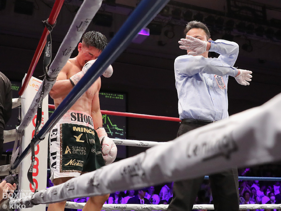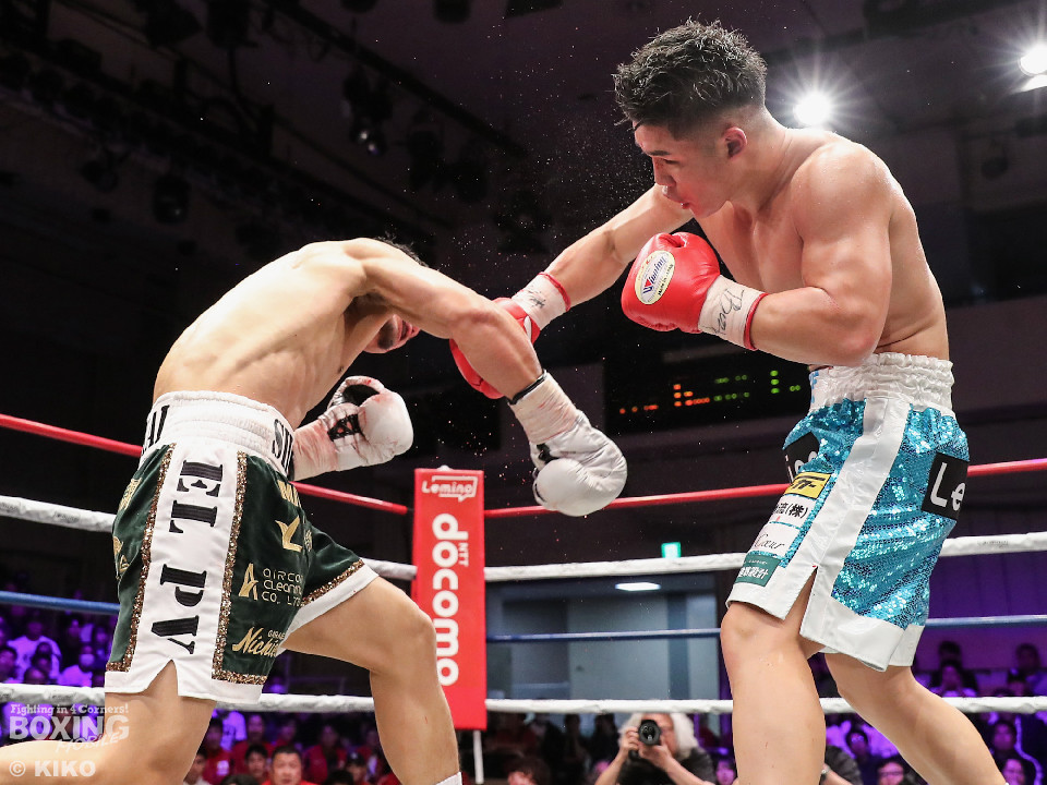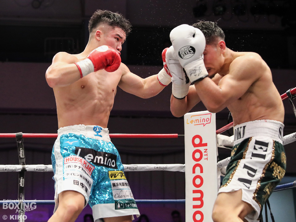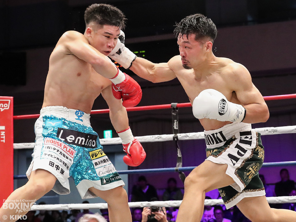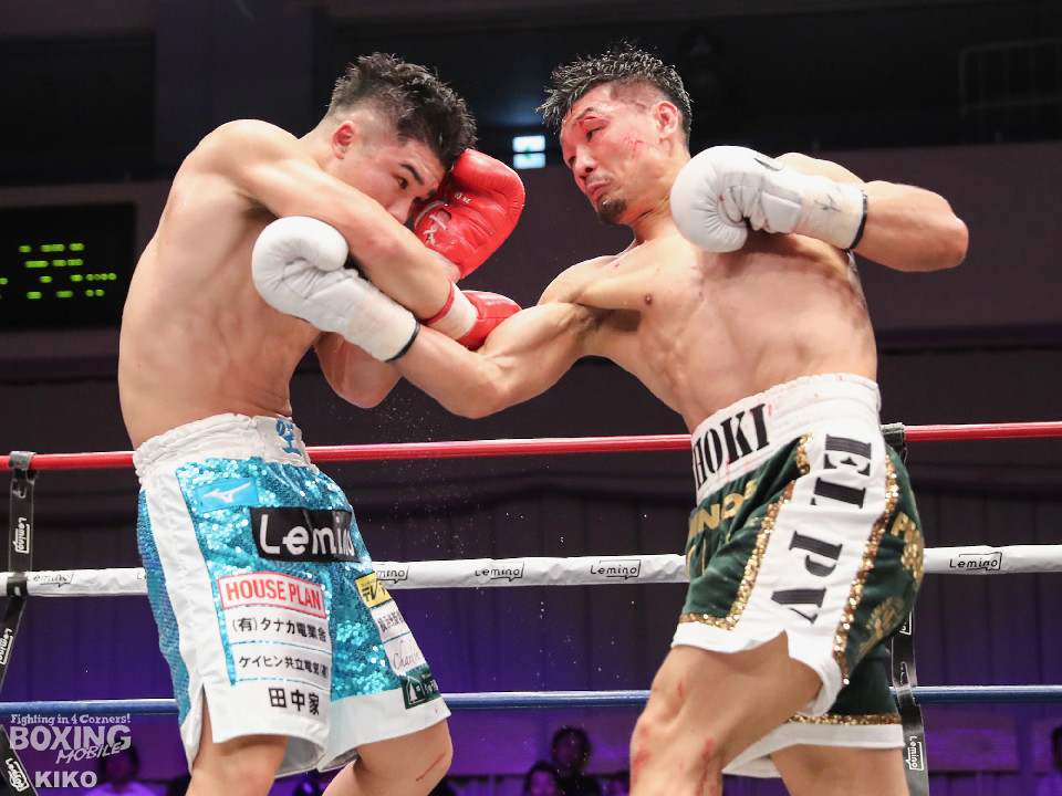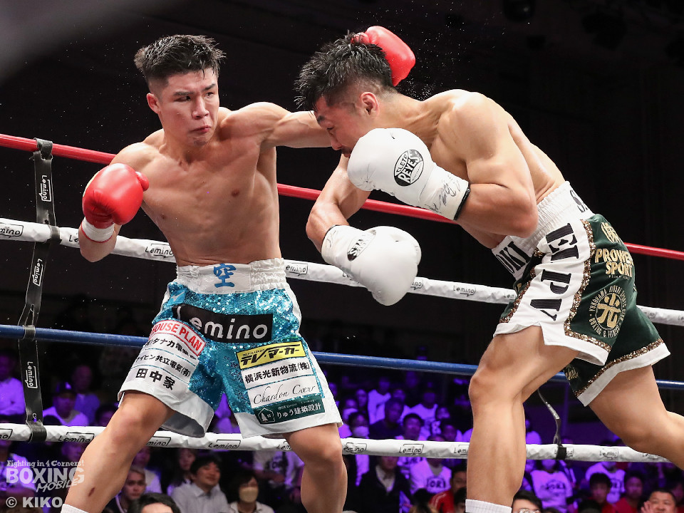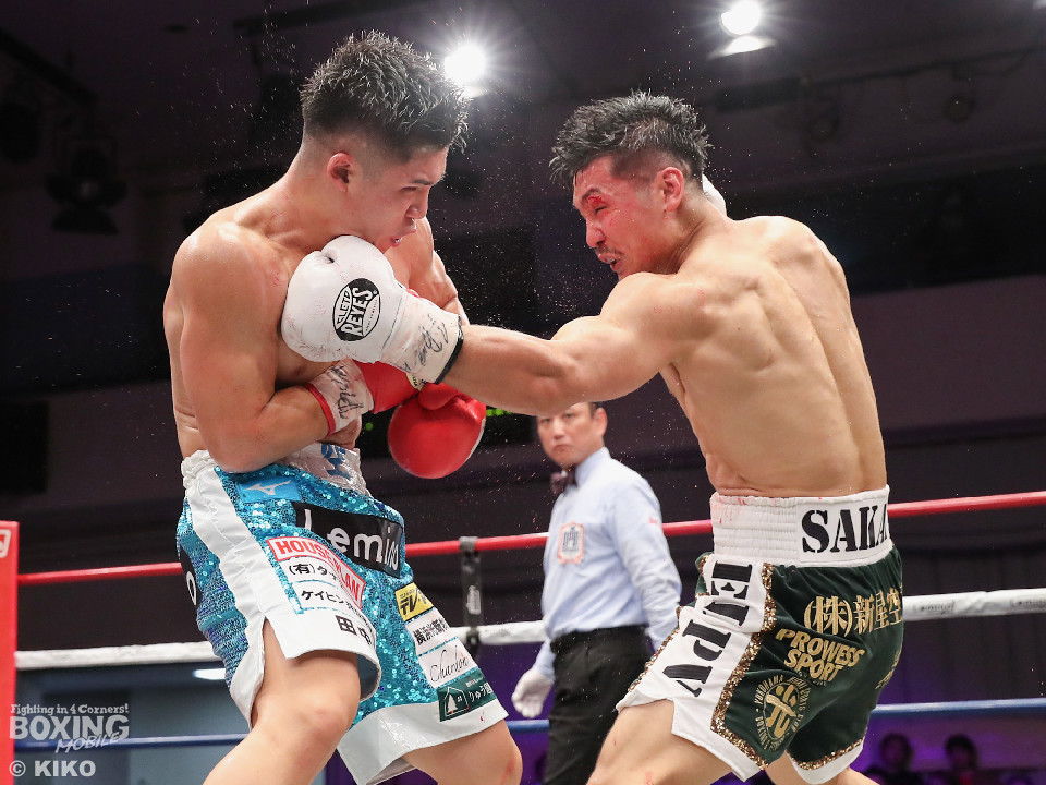 試合:「ハマのタイソン」のニックネームを持つOPBF東洋太平洋ウェルター級王者の田中が、47戦のキャリアを持つベテラン坂井を迎え撃った。初回、田中がコンパクトなコンビネーションを上下に打ち分け積極的な攻撃。2回、田中は左アッパーを織り交ぜつつ、サウスポーにスイッチ。さらに返しの右を冷静にブロックした。3回、坂井は左ボディで反撃を試みるが、田中は強弱をつけて倍返し。4回、右ストレートが交錯するスリリングな攻防を繰り広げる中、田中がワンツーで左目上を切り裂いた。5回、傷が深くなってきた坂井は相撃ちを狙うが、田中は滑らかなコンビネーションを決めた。前半終了時の公開採点は、50-45×3で田中がリード。6回、至近距離で激しい打撃戦を展開。坂井の傷がさらに深くなり、3度目のドクターチェックを要請したレフェリーはこれ以上に試合続行を許さず。田中がTKO勝ちで初防衛に成功した。